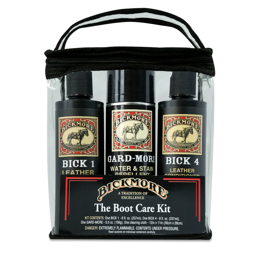 THREE OF THE BEST LEATHER CARE PRODUCTS AVAILABLE: Bickmore Boot Care Kit contains Bickmore Bick 1 to clean, Bick 4 to condition, and Gard-More to protect. Used together these three products will keep all your leather goods in great shape.