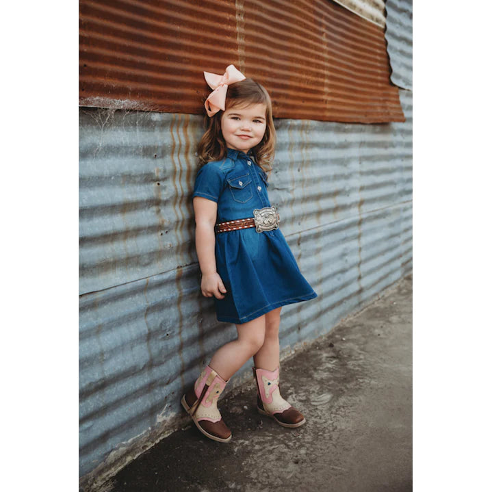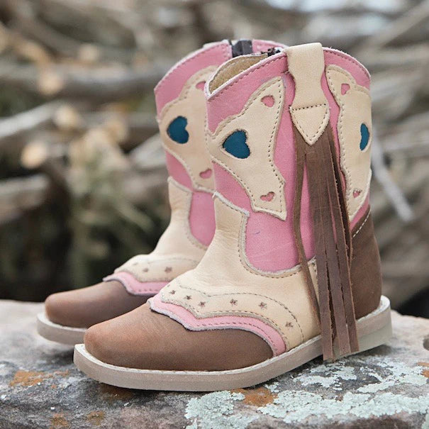 Our bestselling “Addi’ toddler boots are every cowgirl’s dream! The light pink and brown leather makes this boot perfect for any outfit! “Addi” is paired with brown fringe and embroidered hearts that give this boot the touch of uniqueness every little girl is looking for.
