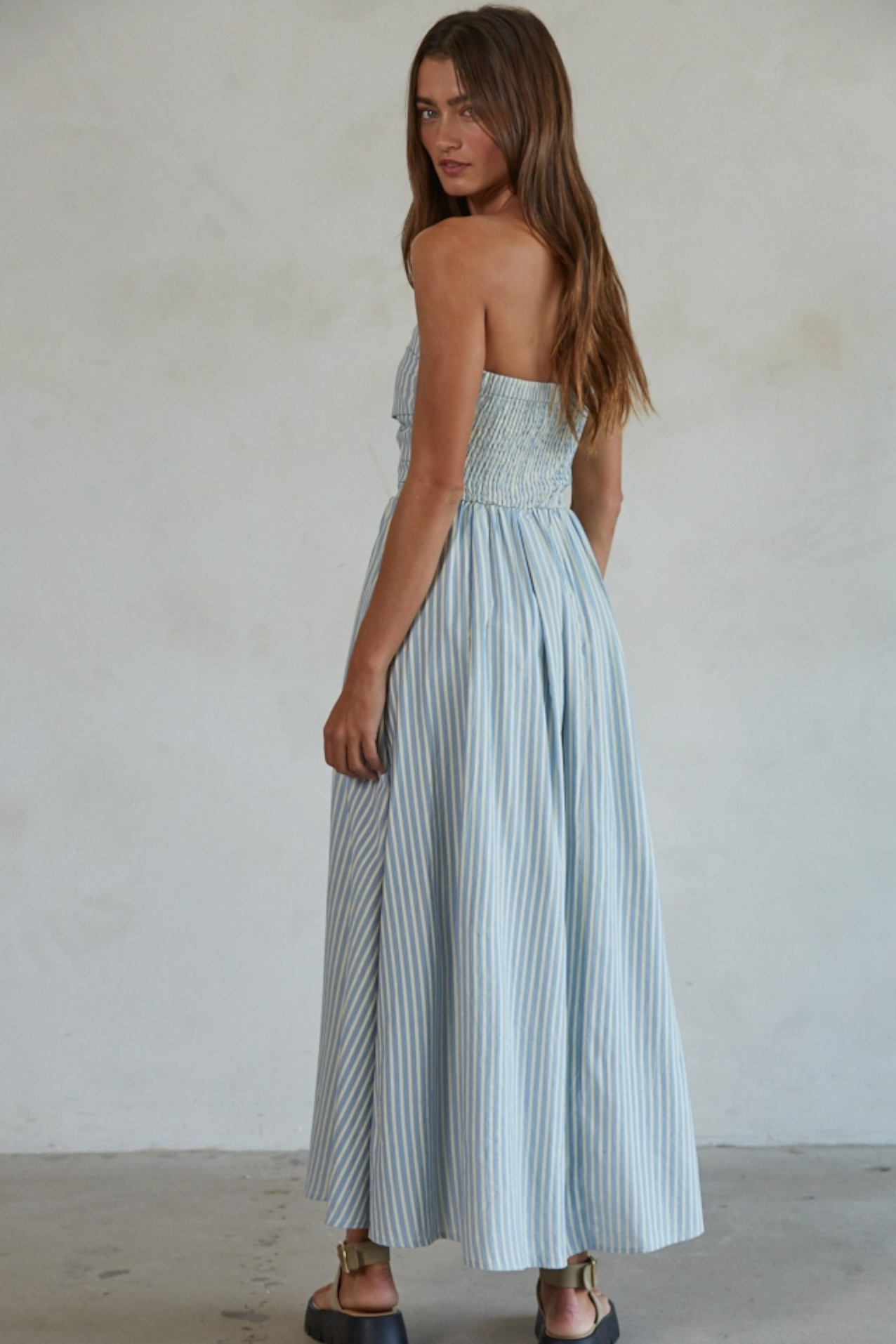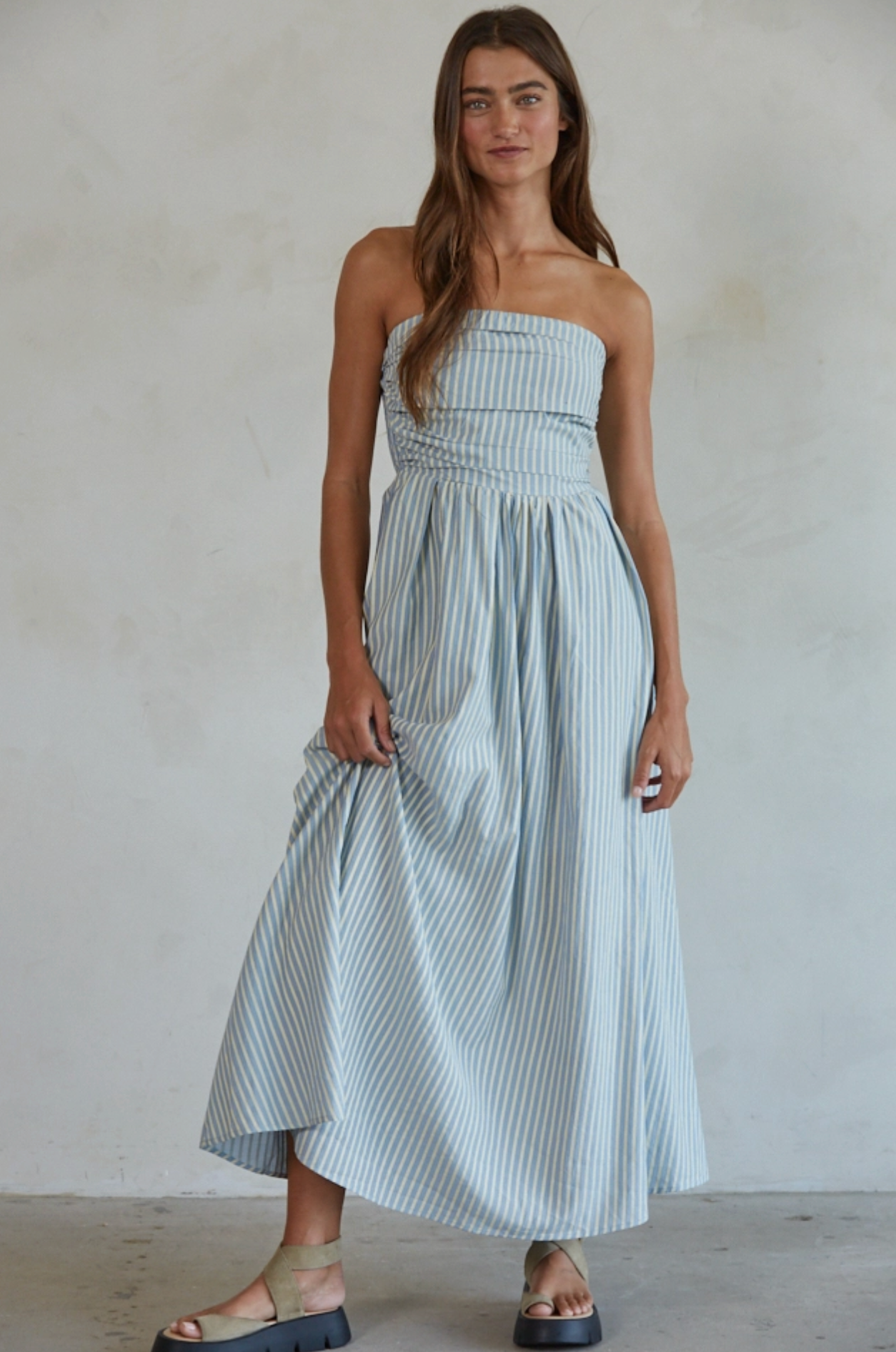 Dusty Blue Striped Tube Neck Strapless Flare Maxi Dress