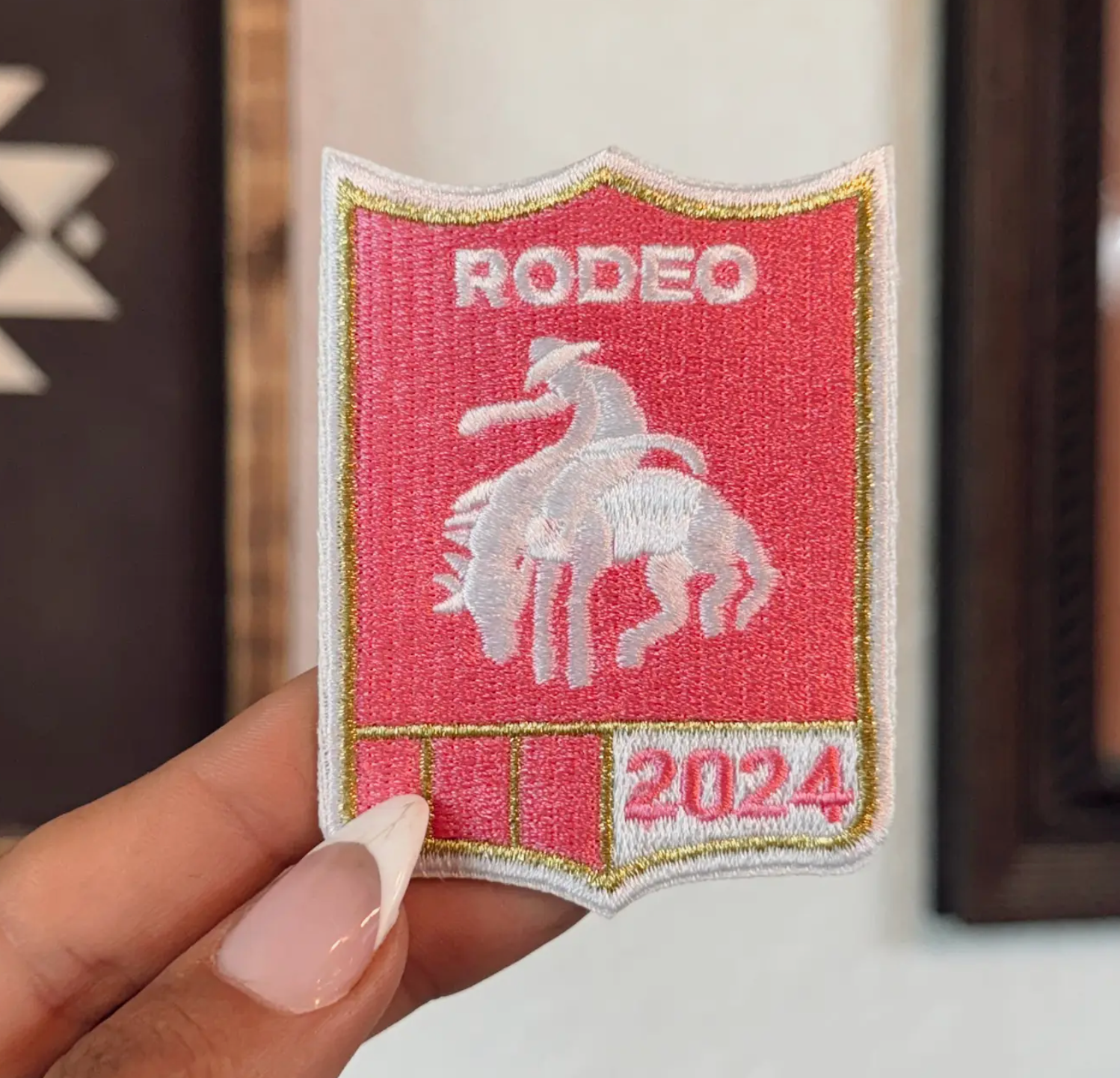 Show your rodeo pride with this 3" iron-on patch, designed by Hanna Rose Crawley—a proud rodeo wife, Texan, and girl mama. Inspired by a classic rodeo shield back number, it features a dynamic bronc rider and bucking horse graphic, available in bold pink, black, or turquoise. This patch is the perfect way to add a vibrant Western touch to any accessory, whether it's a hat, jacket, or bag. Easy to apply and built to last, it’s a fun and stylish way to celebrate the thrill of the ride and your love for the rodeo lifestyle. A true must-have for any rodeo fan!