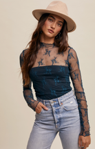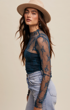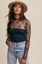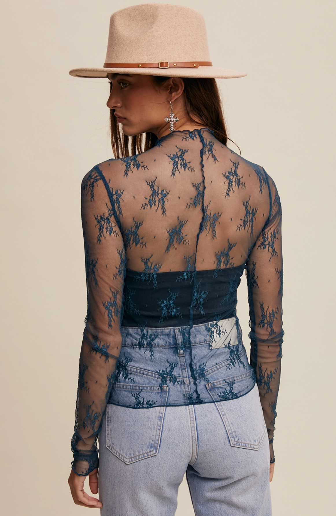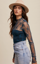 - Elegant Lace Design: Features an intricate, floral lace pattern that exudes a timeless and romantic aesthetic. - Sheer Details: Made entirely from semi-transparent fabric for a lightweight and airy look, perfect for layering. - Slim Fit Silhouette: Designed with a flattering slim fit that hugs the body elegantly, ideal for both casual and formal occasions. - Delicate High Neckline: A high neck with scalloped edges adds a sophisticated touch. - Long Sleeves: Sheer long sleeves with subtle scalloped hems for added elegance. - Unlined for Versatility: The unlined design allows for easy layering, making it suitable to pair with various camisoles or bralettes. - Model is 5' 7" 31-24-35 and wearing a size Small This top is an effortlessly chic choice for evening wear or a romantic day out. Pair it with high-waisted trousers or a sleek skirt to complete the look.
