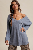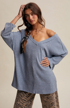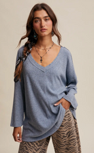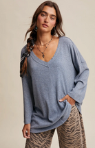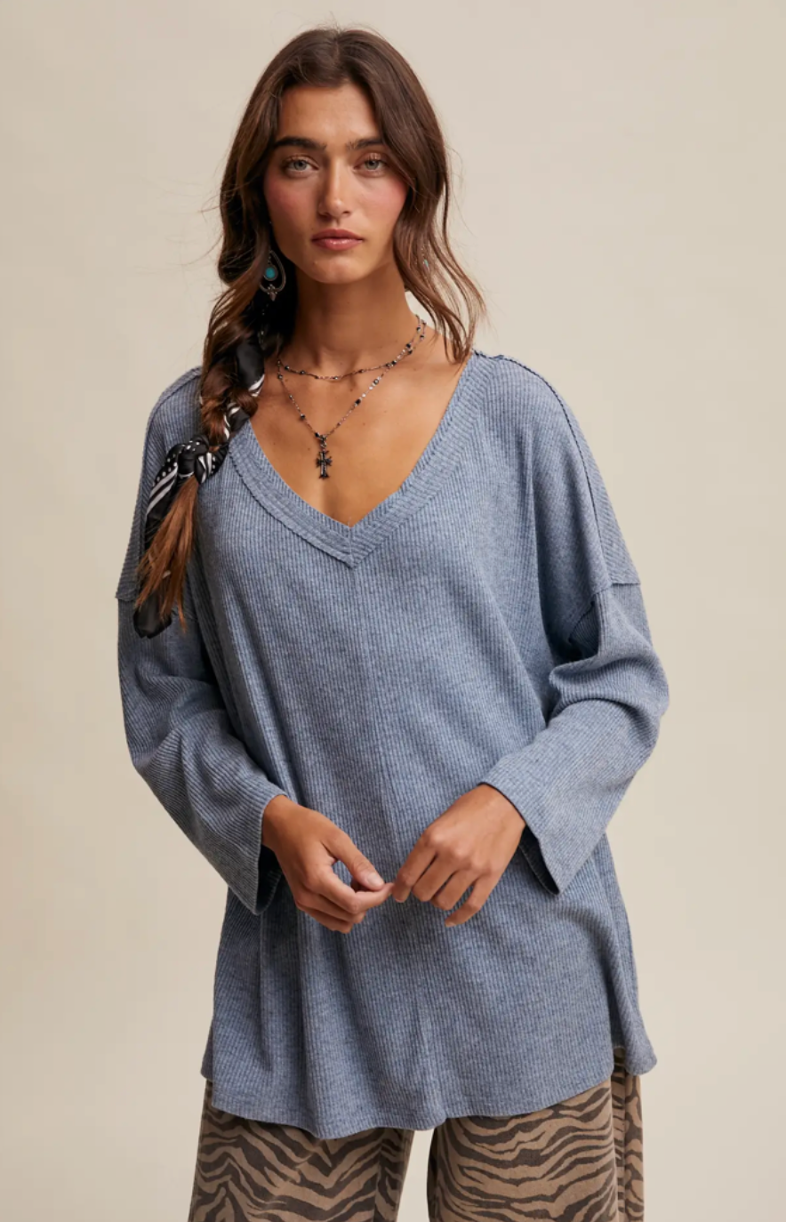 Soft Ribbed Knit: Lightweight stretch fabric with a fine rib texture for all-day comfort - Relaxed Fit: Draped silhouette for an effortless, laid-back look - Deep V-Neckline: Flattering cut ideal for layering with camis or statement jewelry - Drop Shoulder Design: Enhances the casual, slouchy aesthetic - Long Sleeves: Loose, easy sleeves that can be styled rolled or full length - Tunic Length: Slightly longer hemline for versatile styling with jeans, leggings, or skirts - Side Slits: Allow for ease of movement and a flattering drape - Available in Multiple Colors: Choose from soft neutrals or rich seasonal tones - Model is 5' 7" 30-24-35 and wearing a size Small A versatile top that blends comfort with effortless style-perfect for layering under jackets or pairing with denim for a casual Western-inspired look.