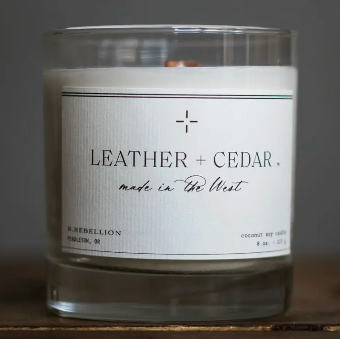 LEATHER + CEDAR: leather, smoke, cedar, herbs Weight: 8 oz / 227 gr Diameter: 3.125 in Height: 3.5 in Burn time: Up to 60 hours Vessel: Reusable Whiskey Glass Our candles are hand-poured in small batches with a luxurious blend of all-natural coconut + soy wax, wood wicks, phthalate-free fragrance oils, zero dyes, and always with love. Wood wicks are sustainably sourced, all-natural, and create a beautiful flame + soft crackle as they burn.