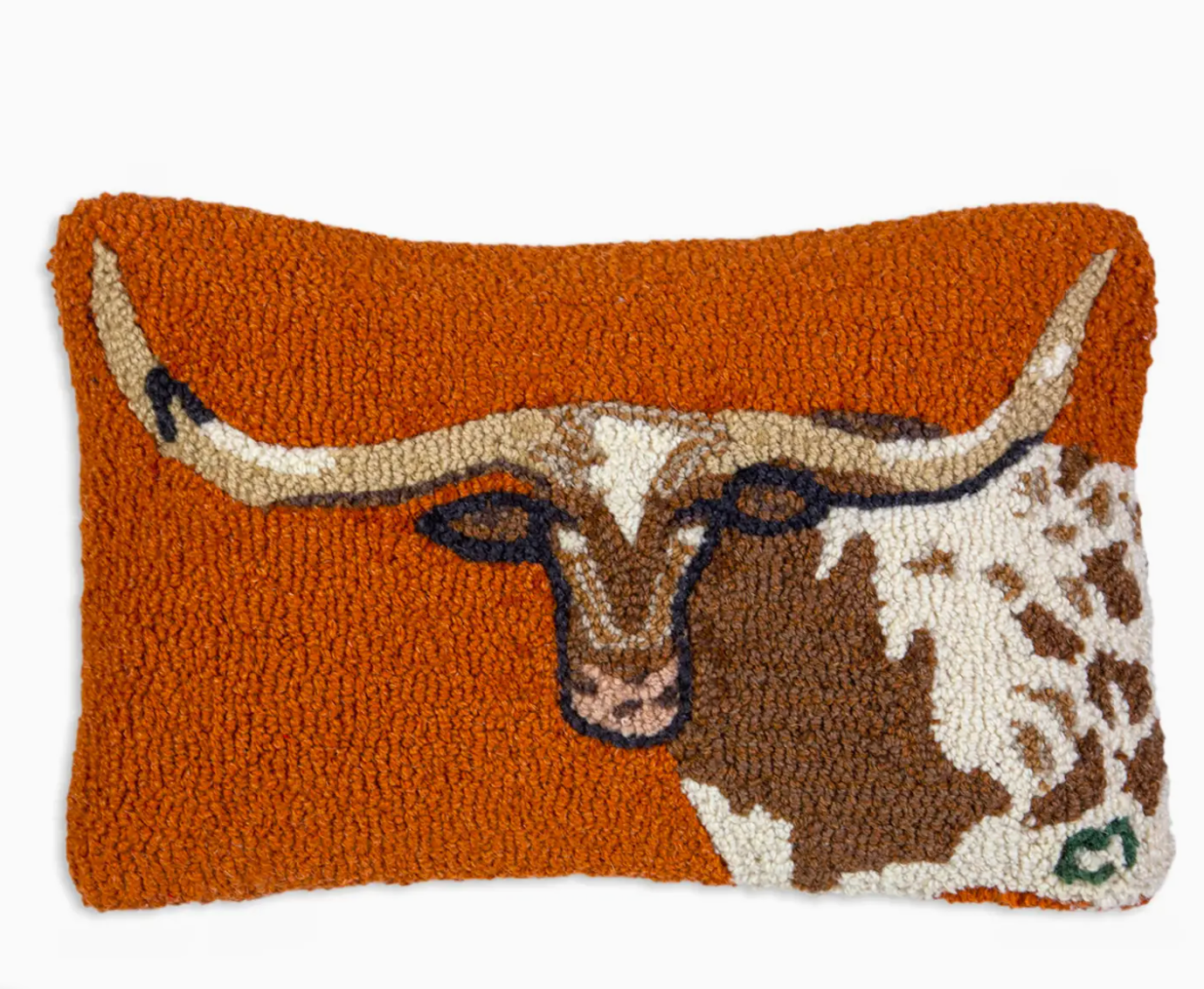 A striking decorative pillow for the western home featuring a longhorn steer against a vibrant Southwest-inspired orange background.