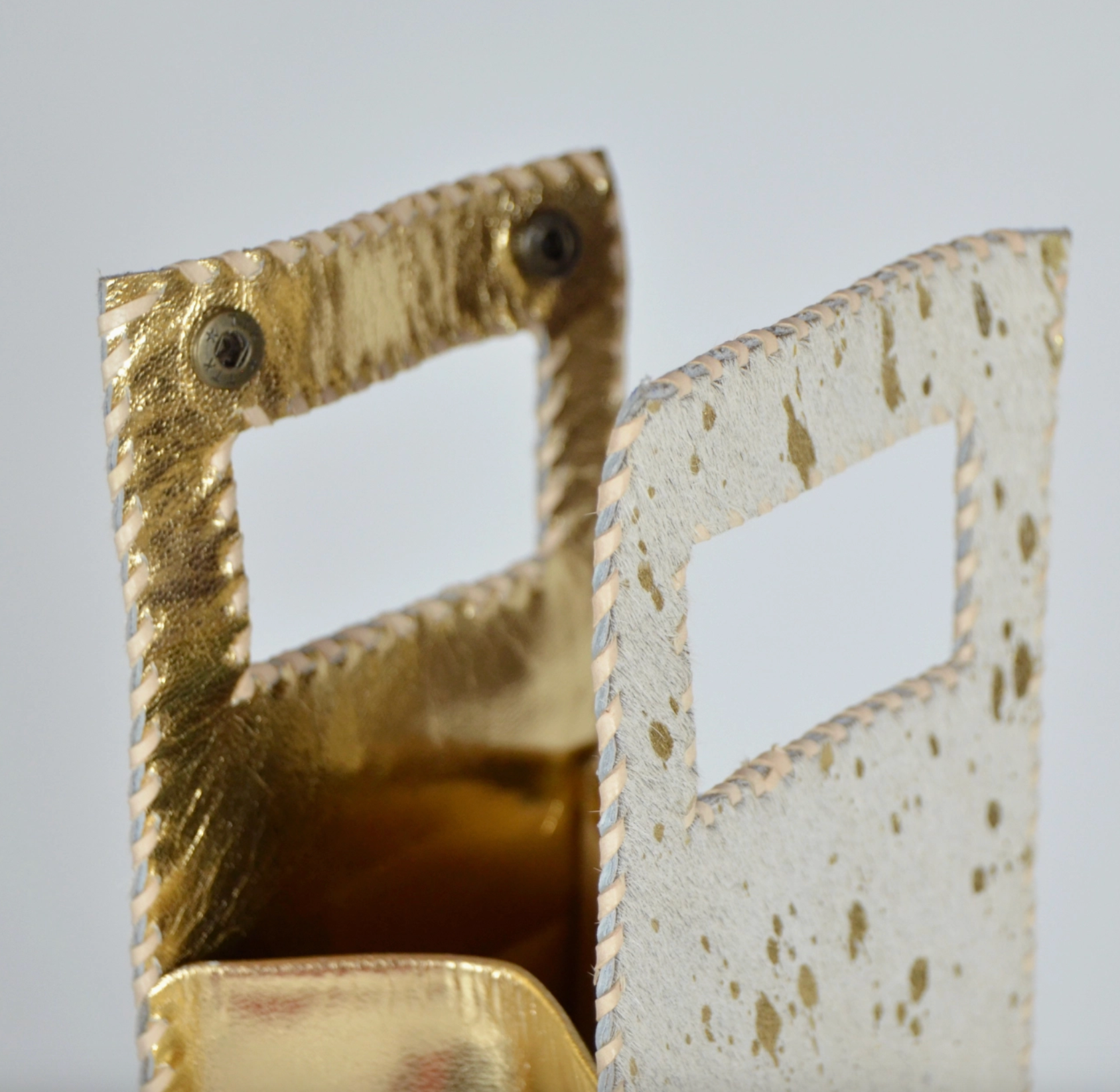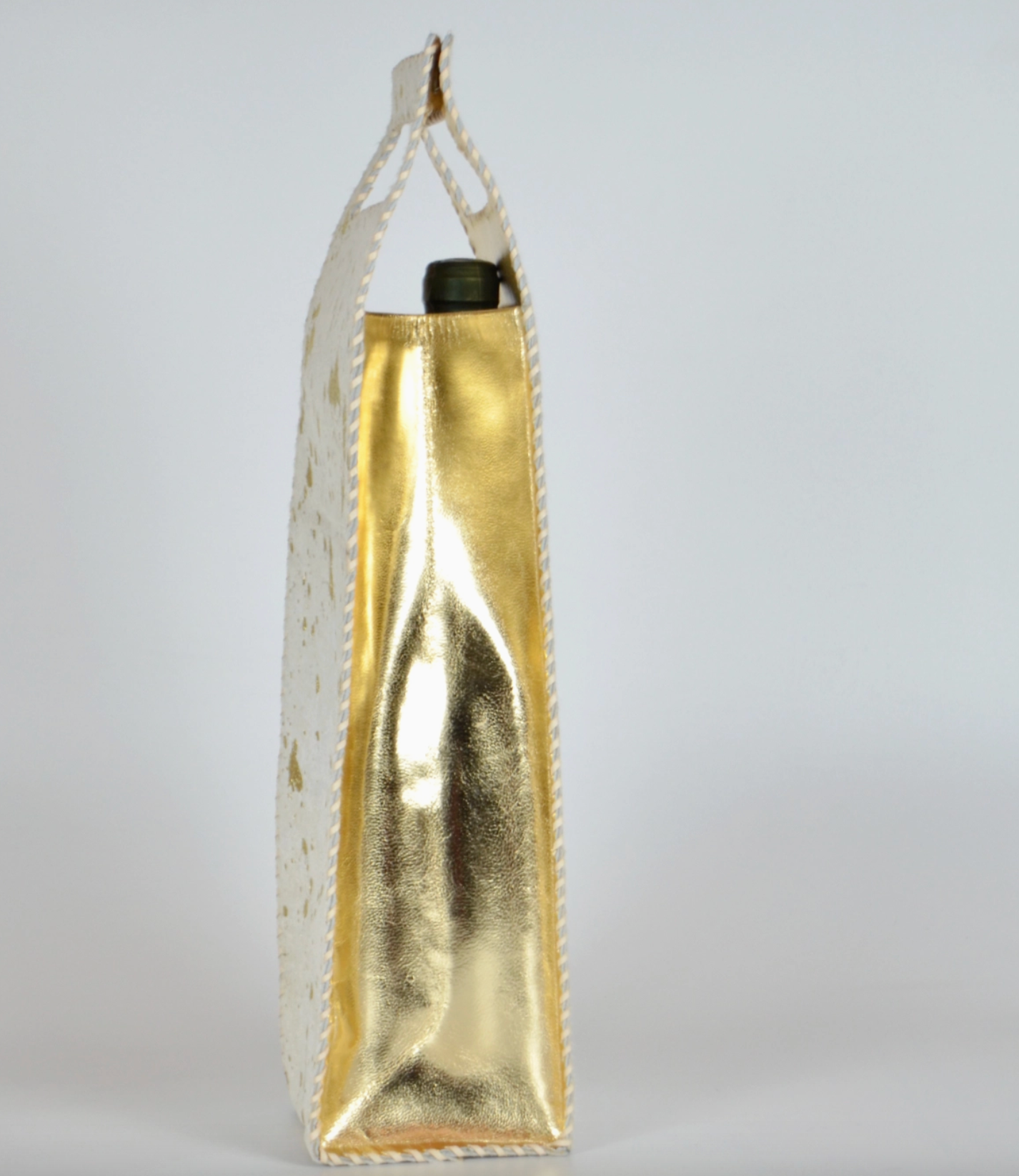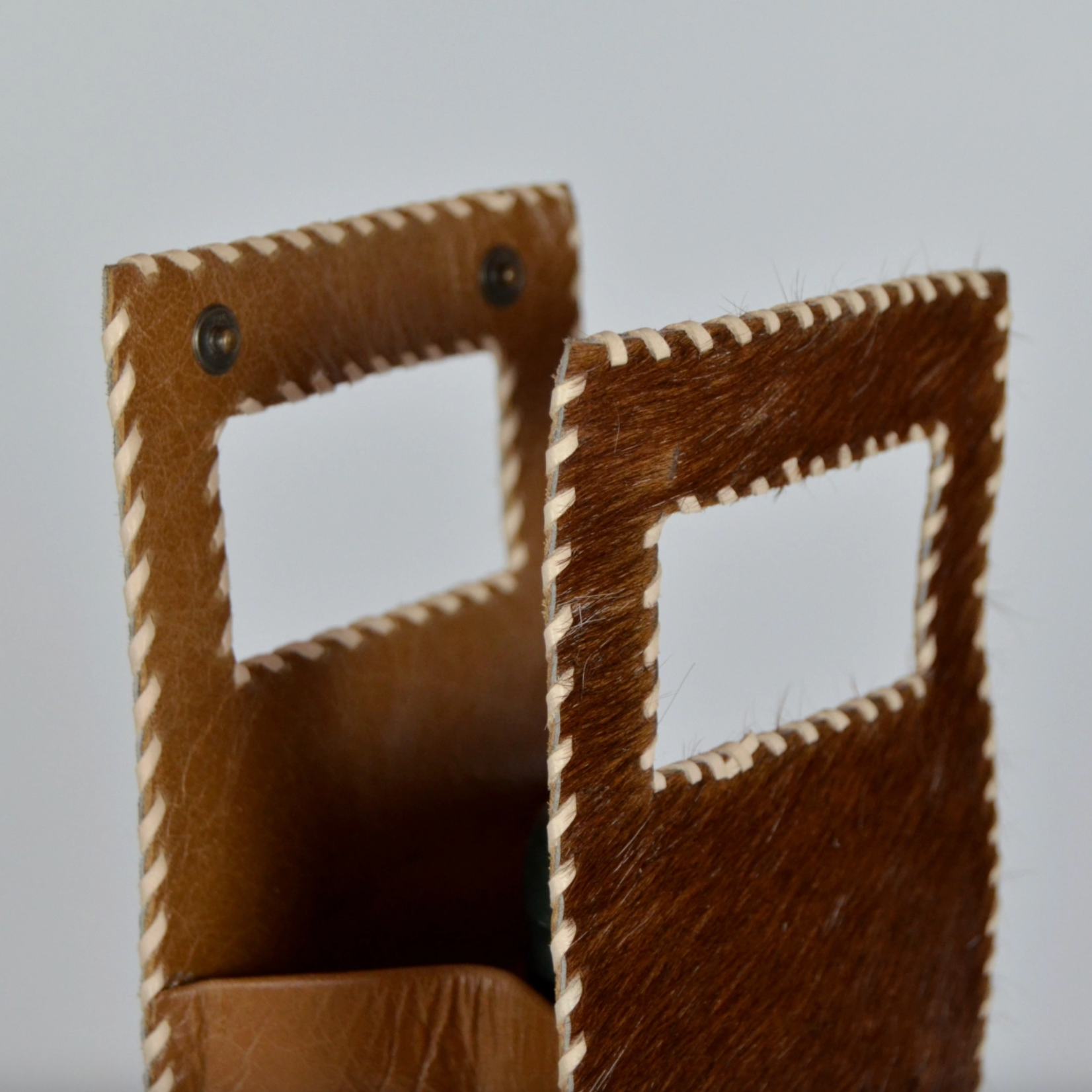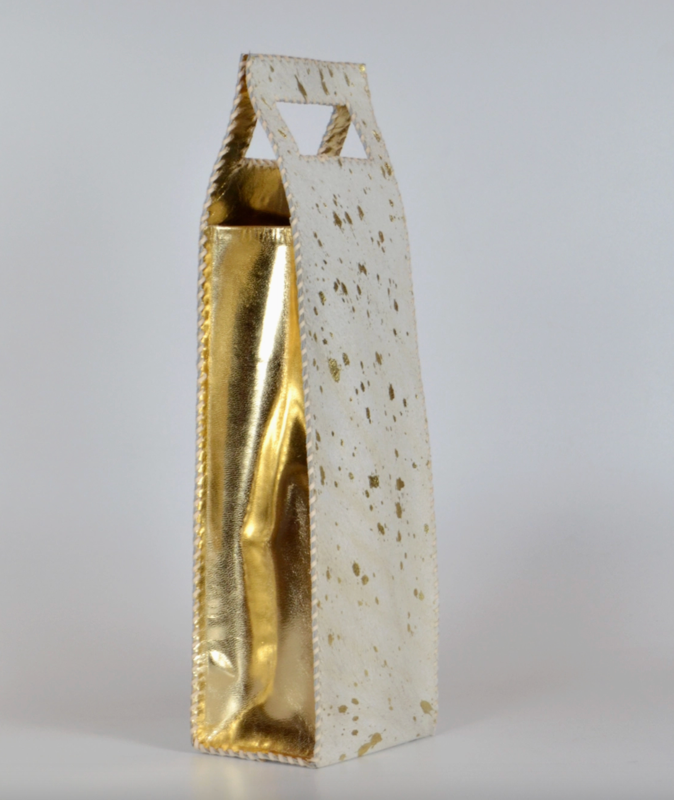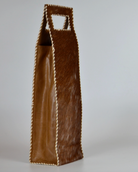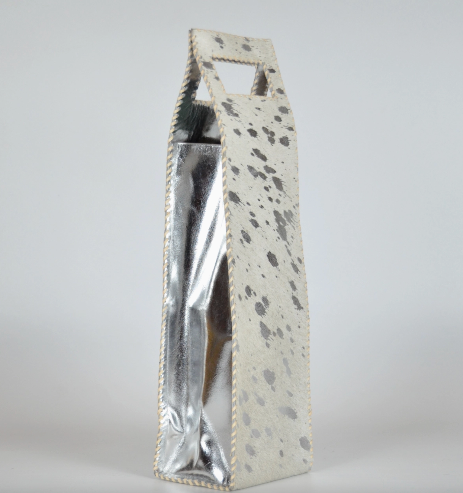 Artisan Handmade Wine Bag. Made with Hairon Cowhide leather. Handstiched using leather strips creating beautiful leather detailing. Lightweight, durable and compact. Carry handle for comfortable for comfortable transportation. Fits most types and brands of wine bottles available. Size: 15.5"x4.5"x4"