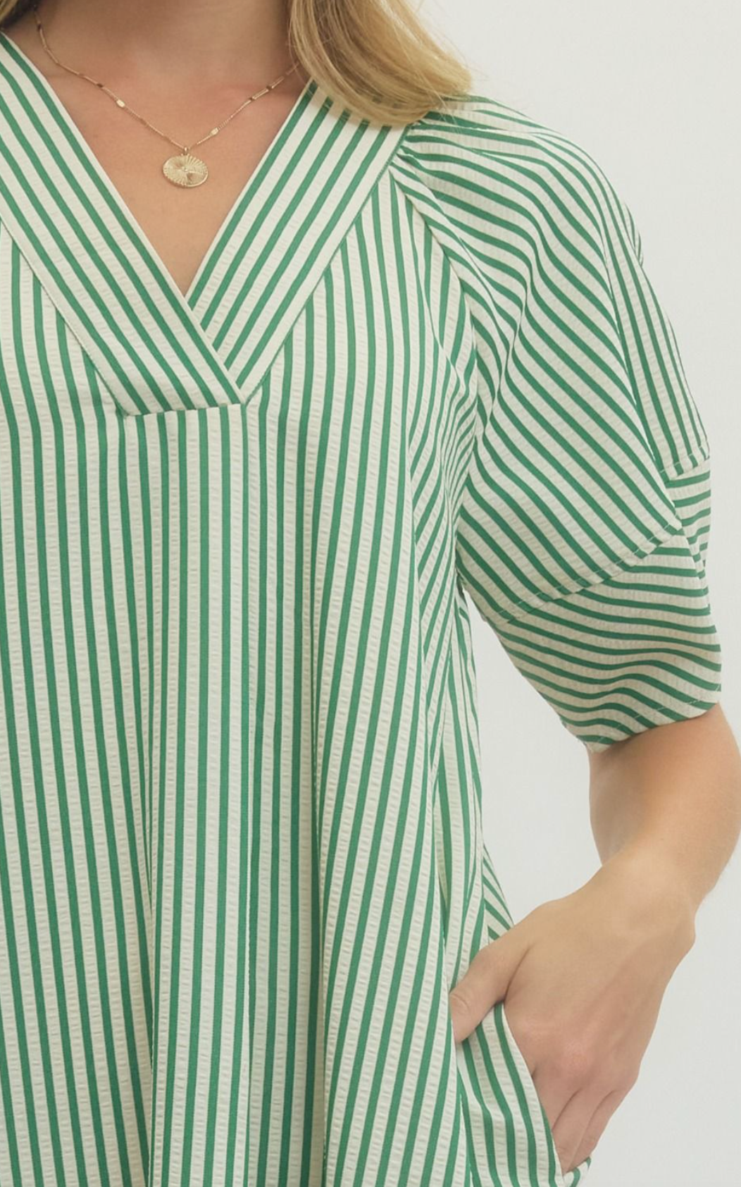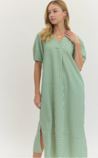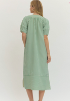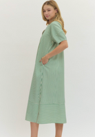 Stripe pattern textured pullover midi dress features raglan lantern sleeves and slit side hems. Pockets at side. Lined. Woven. Non-sheer. Lightweight.