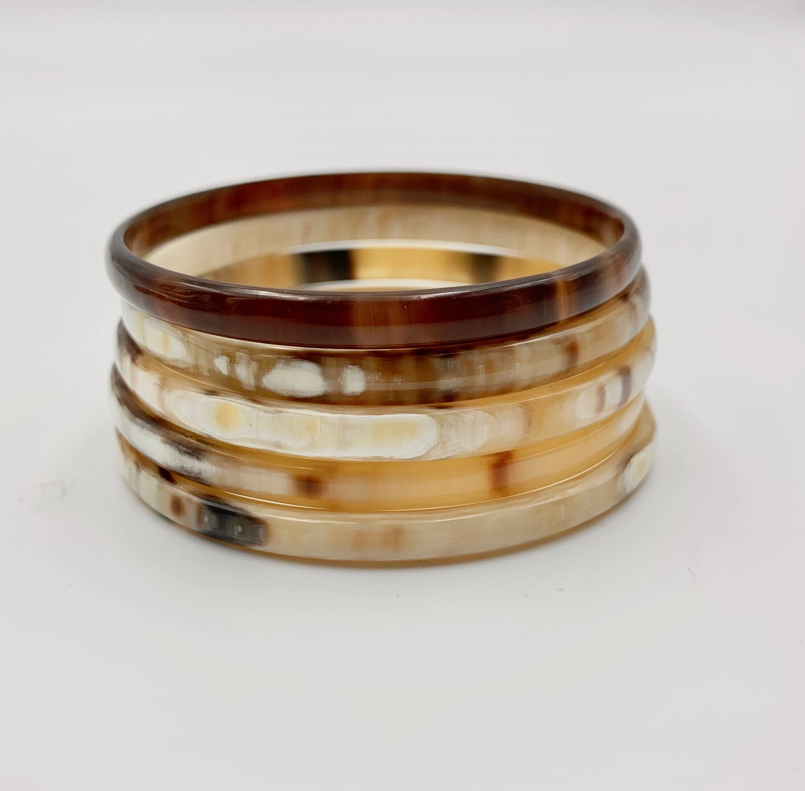 Thin horn bangles are perfect stacked together in a cluster of three or four or paired with a Medium or Wide bangle grouping. Assorted color tones. This unique, hand-crafted horn product is sustainably made from the horns of the Ankole-Watusi, or Ankole Longhorn, a breed of cattle native to western Uganda and parts of East Africa. These distinctive horns are a recycled byproduct of the food industry and are purchased directly from the cattle keepers, providing revenue for local cattle keeping communities. The horn is then hand carved and polished according to Maadili designs by a small scale artisan community. * Sustainably sourced horn from rural Ugandan cattle keepers, horn is used and upcycled instead of wasted