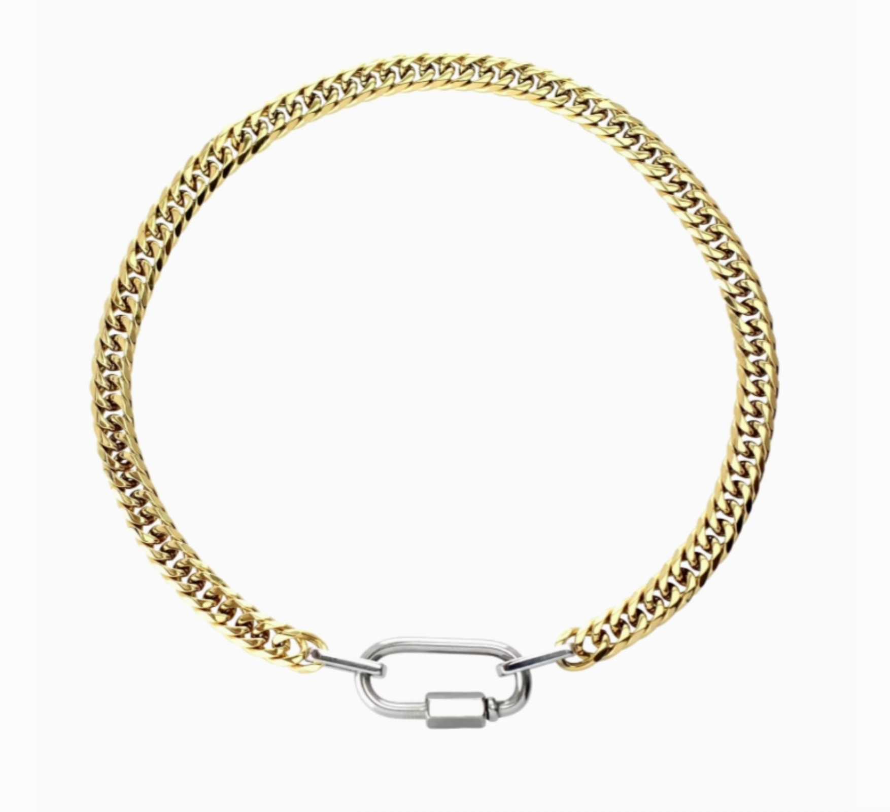 The Carabiner Chunky Screw Lock Necklace is a timeless jewelry staple as a clasp and a pendant. Mixed Chain in a chunky style- Cuban. Our Largest Chain To Date The Carabiner Collection allows you to stack your charms and chains. It is chic, Rock, Messy, Bohemian.Amulet link or Charm Collection Holder Created in a stainless steel model making it difficult to make but stunning and long lasting. Opens with a twisting bead to add charms or other chains. You can adjust these as clasps to make necklaces or bracelets or mix and match your stack 14K Genuine gold plated then EP coated. Hand set foil back Crystals. Stainless STeel Waterproof. Hand set Crystals. Lobster Claw Clasp and Steel Chain and extender. Waterproof Hypoallergenic