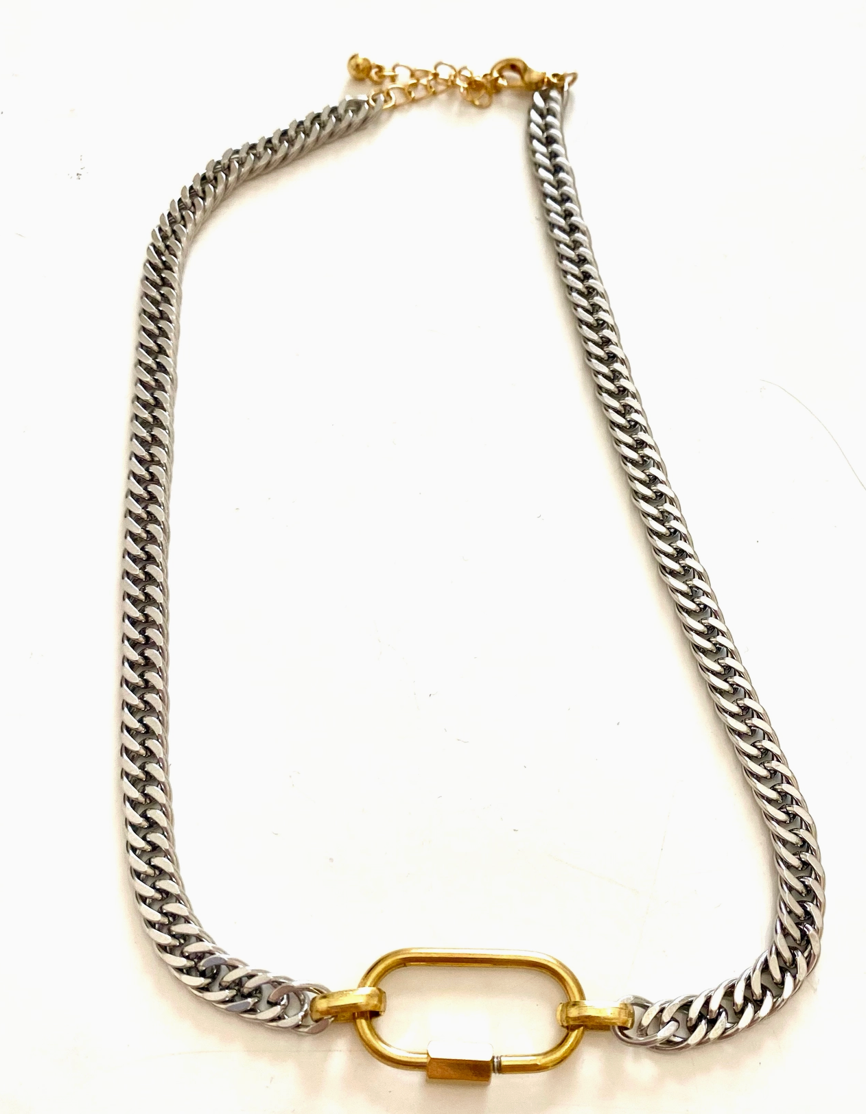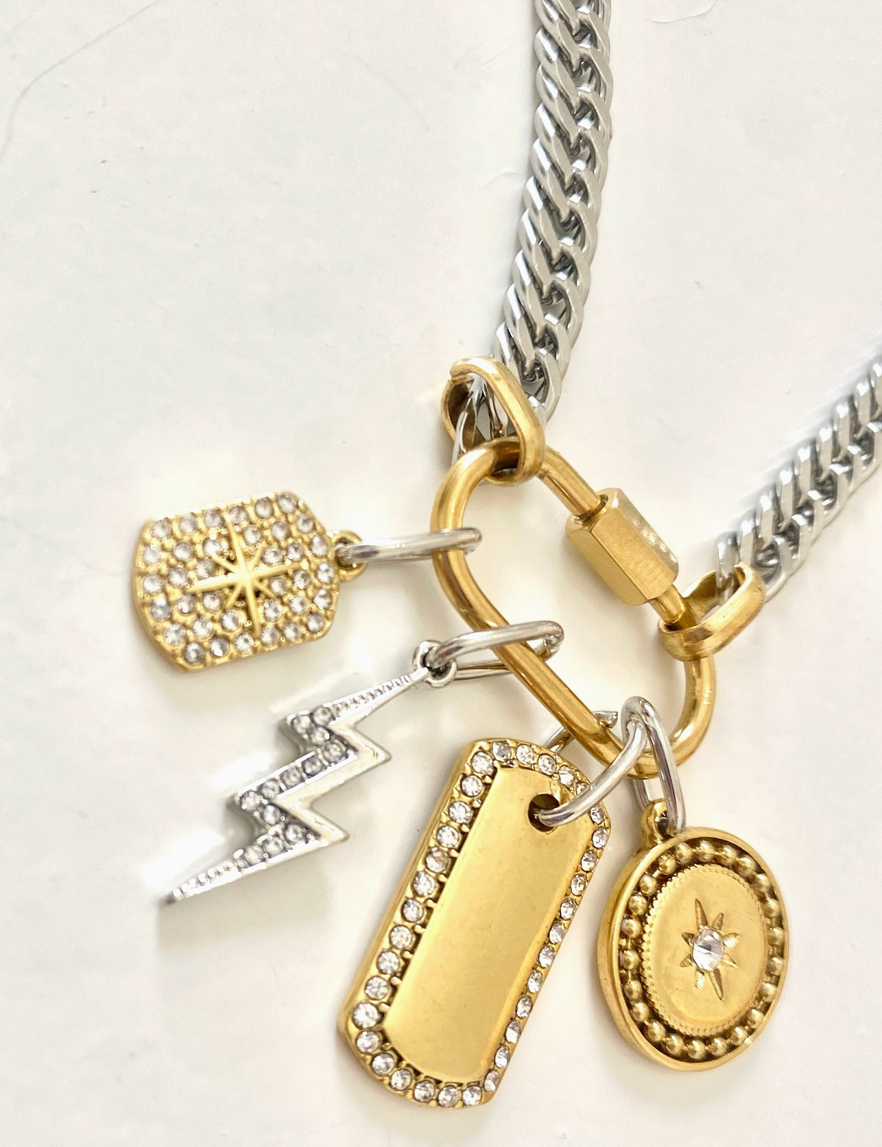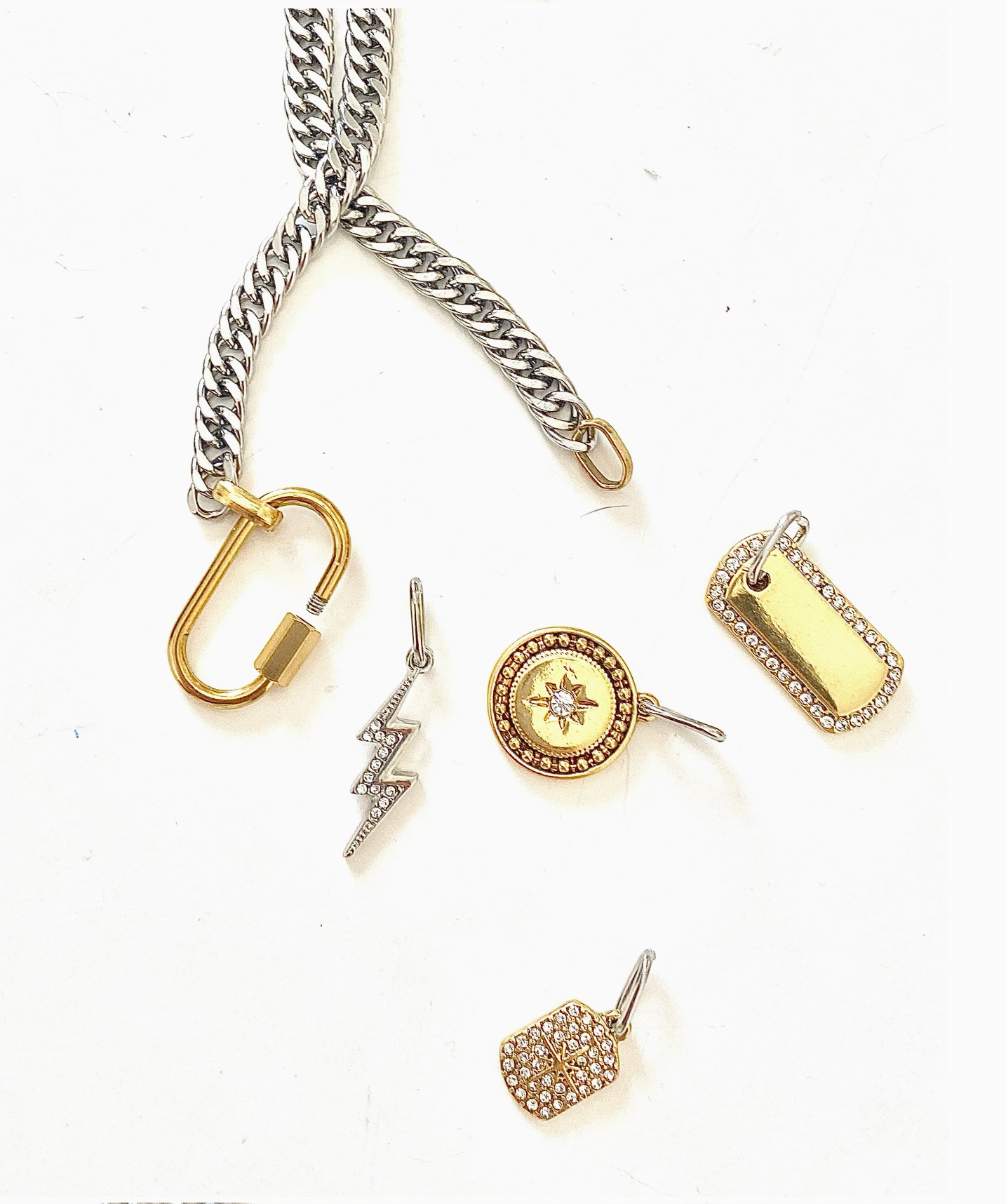 The Carabiner Screw Lock Necklace is a timeless jewelry staple as a pendant. The Carabiner Collection allows you to stack your charms and chains. Amulet link or Charm Collection Holder. Add an subtract charms or wear as a simple statement Mixed metal Star piece Created in a stainless steel model making it difficult to make but stunning and long lasting. 14K Genuine gold plated then EP coated. Hand set foil back Crystals. Lobster Claw Clasp and Steel Chain and extender. Waterproof Hypoallergenic Working Carabiner