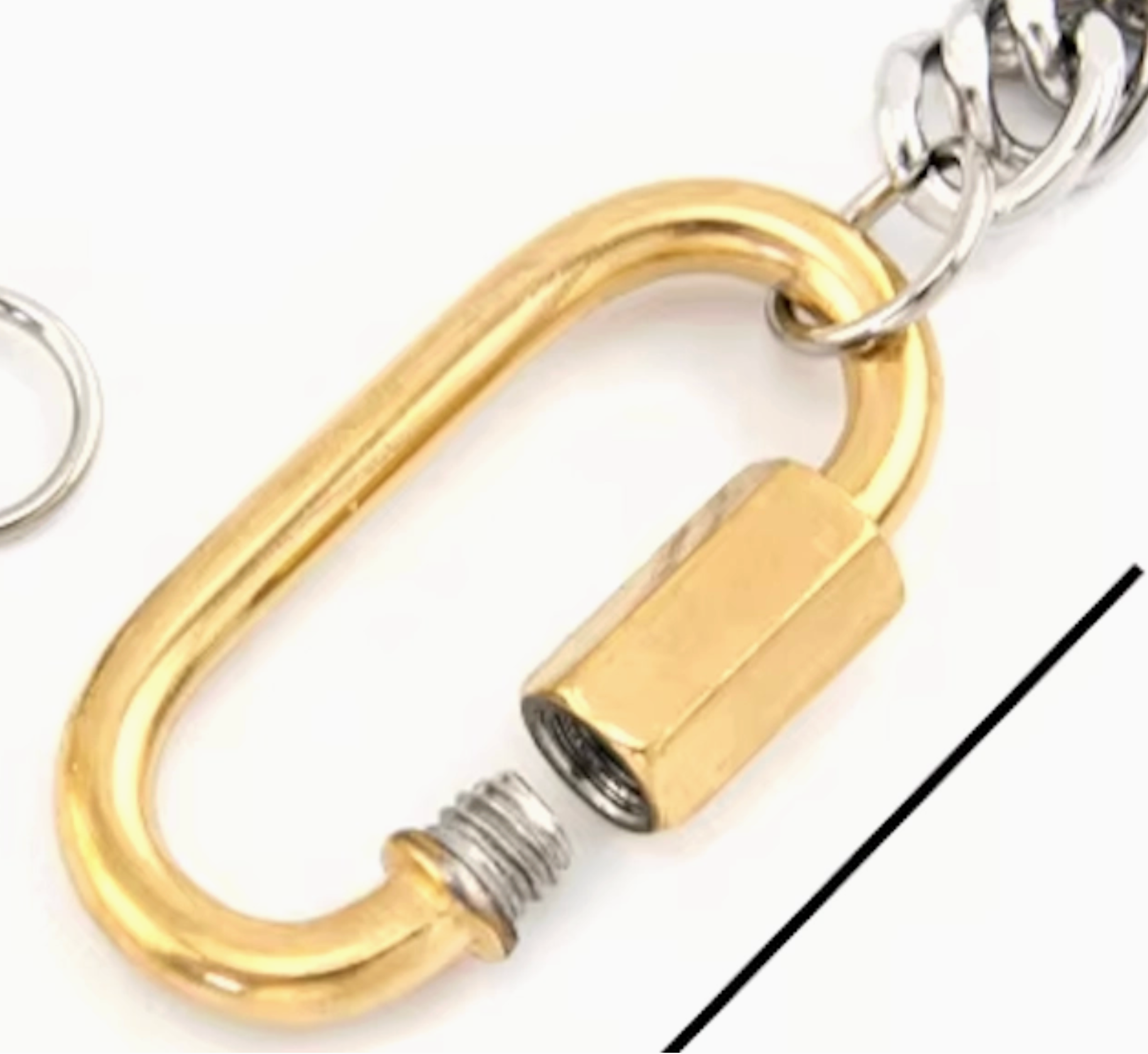 The Carabiner Screw Lock Necklace is a timeless jewelry staple as a clasp and a pendant. Mixed Chain in a chunky style- Cuban. The Carabiner Collection allows you to stack your charms and chains. It is chic, Rock, Messy, Bohemian.Amulet link or Charm Collection Holder Created in a stainless steel model making it difficult to make but stunning and long lasting. Opens with a twisting bead to add charms or other chains. You can adjust these as clasps to make necklaces or bracelets or mix and match your stack 14K Genuine gold plated then EP coated. Stainless Steel Waterproof. Lobster Claw Clasp Steel Chain Hypoallergenic Lead Free Nickel Free