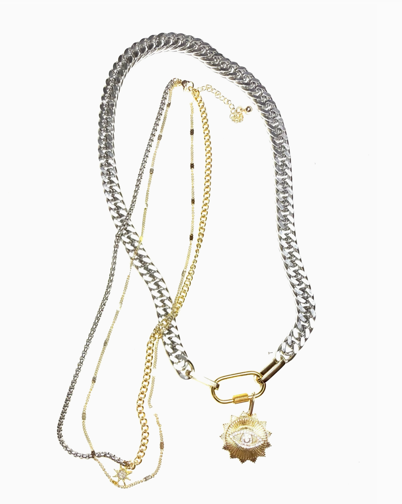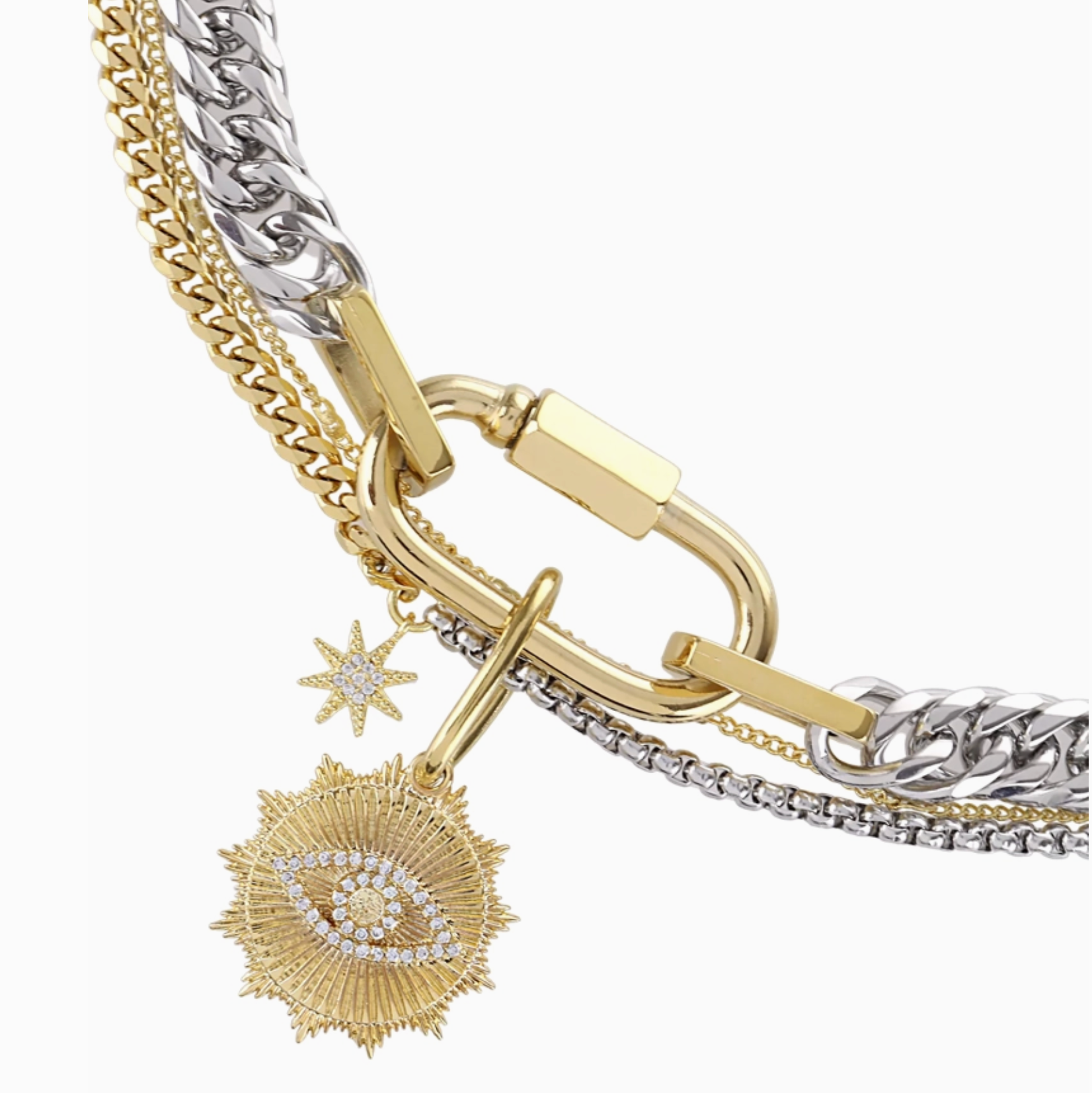 The Carabiner Link and Talisman Holder with mixed chain and charms. New and improved. The links are bigger and the necklace now does up at the Carabiner to ensure weight doesn't pull the closure apart. It is also more comfortable. Fully adjustable. Carabiner opens and can be added to. Pave is hand set CZ glass stones with foil for more sparkle. The Carabiner Screw Lock Necklace is a timeless jewelry staple as a clasp and a pendant. Evil Eye talisman charm. You can start your collection of charms mixed metal and extra chains. The Carabiner Collection allows you to stack your charms and chains. It is chic, Rock, Messy, Bohemian. Amulet link or Charm Collection Holder Created in a stainless steel model making it difficult to make but stunning and long lasting. Opens with a twisting bead to add charms or other chains. You can adjust these as clasps to make necklaces or bracelets or mix and match your stack 14K Genuine gold plated then EP coated. Waterproof Hypoallergenic
