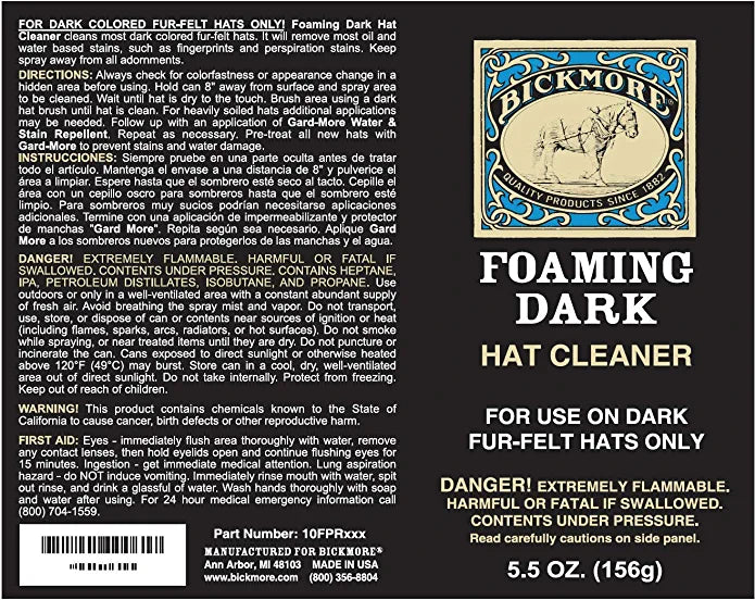 FOR DARK COLORED FUR-GELT HATS ONLY: Foaming Dark Hat Cleaner cleans most dark colored fur-felt hats. It will remove most oil and water based stains, such as fingerprints and perspiration stains.