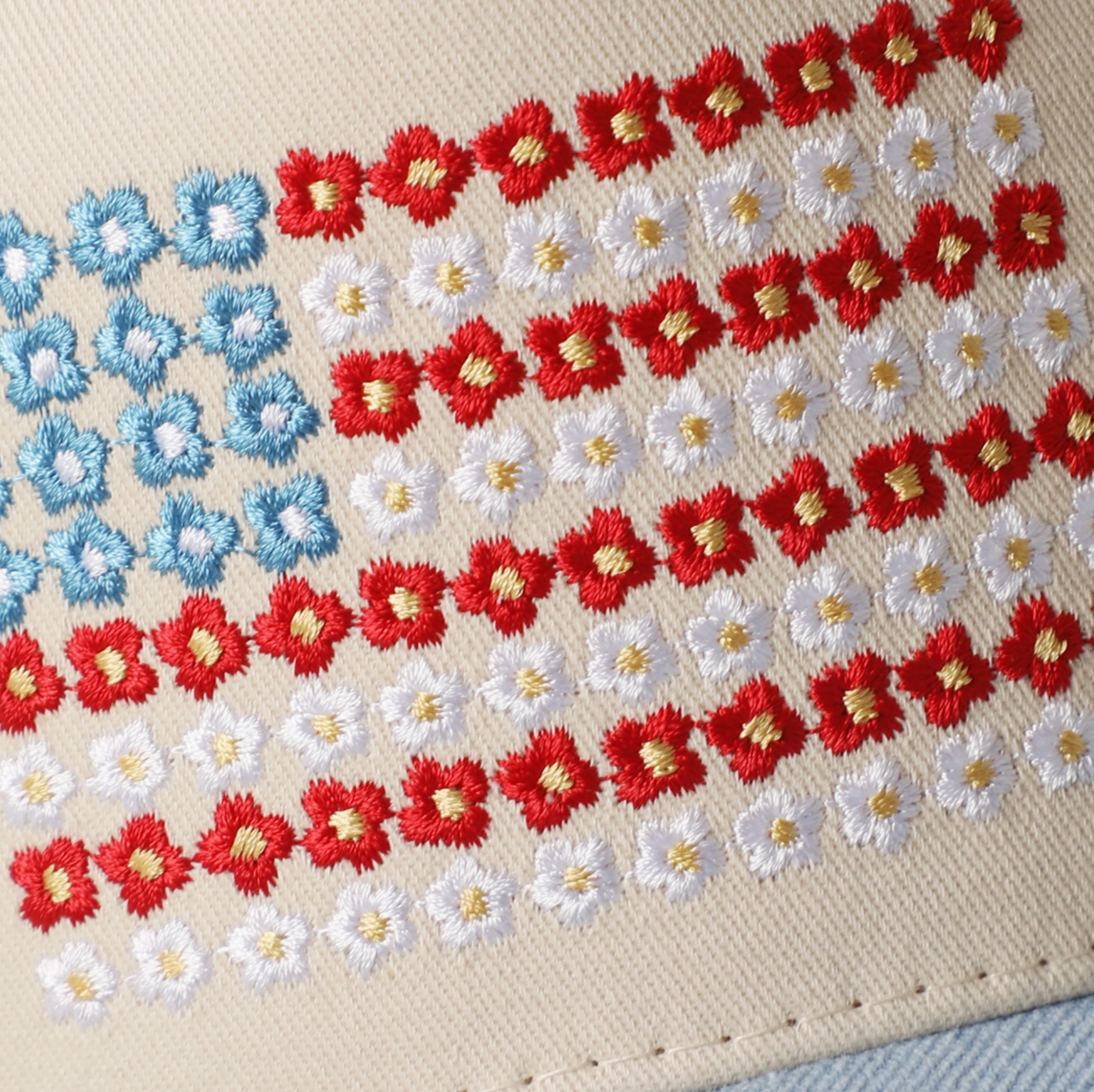 Floral American Flag Embroidered Two-Tone Denim Trucker Hat
