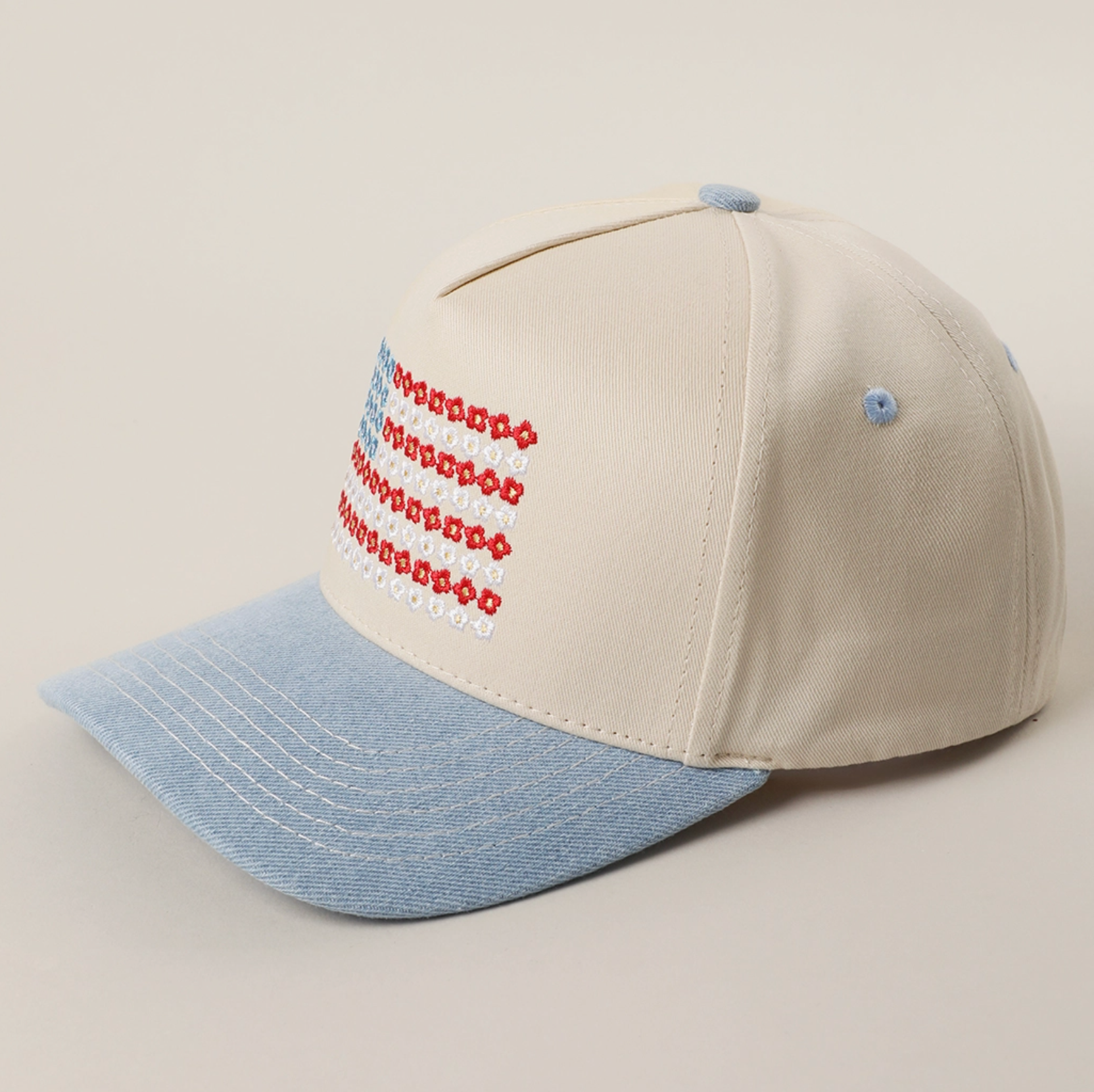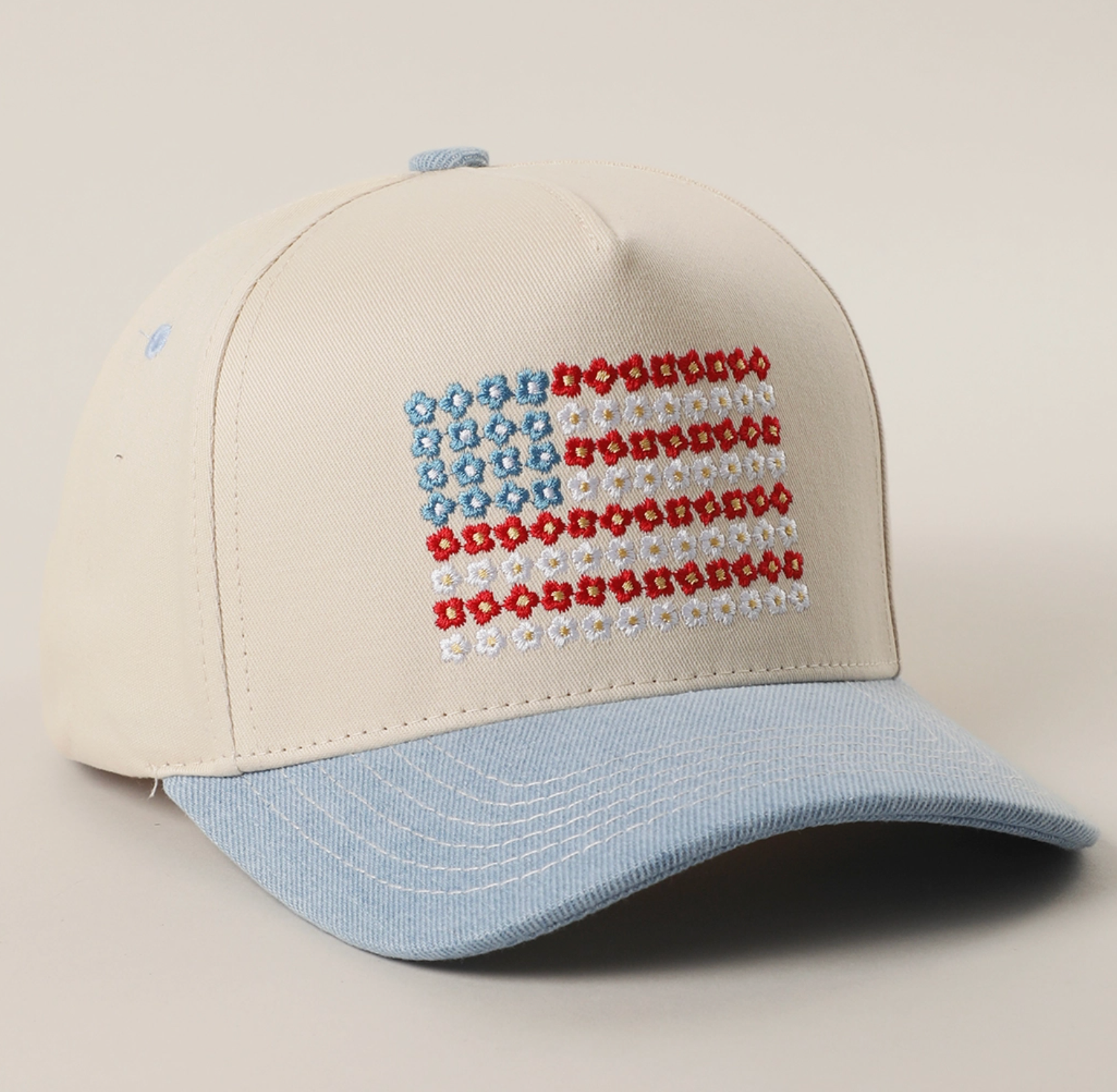 Show off your patriotic style with the Floral American Flag Embroidered Two-Tone Denim Trucker Hat. This unique design features an embroidered American flag made entirely of small floral motifs, blending classic Americana with a touch of feminine charm. The beige crown contrasts beautifully with the light denim brim, creating a modern two-tone finish. Crafted from 100% cotton canvas for comfort and durability, it’s perfect for sunny days, festivals, or casual outings. The structured 5-panel shape offers a flattering fit, while the adjustable snapback closure ensures one size fits most — stylish, fun, and effortlessly American.