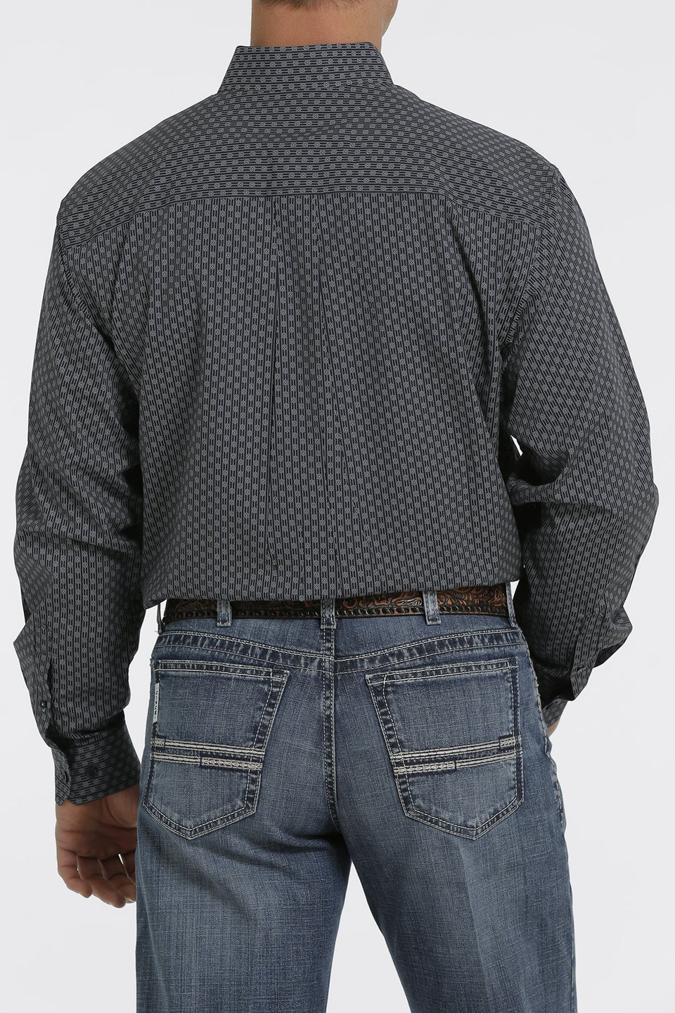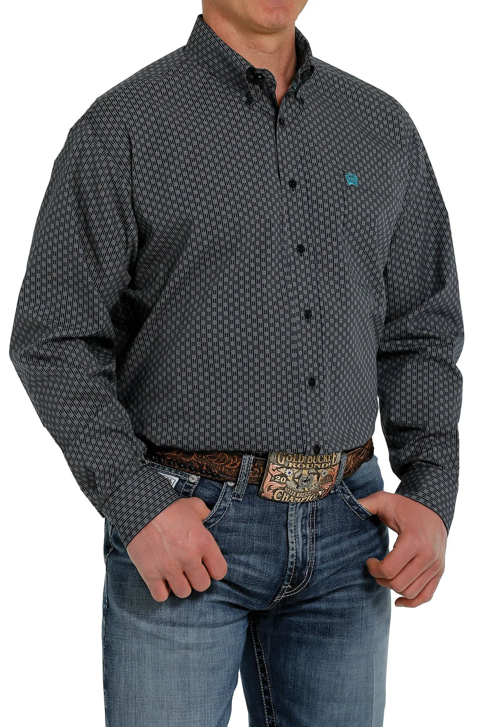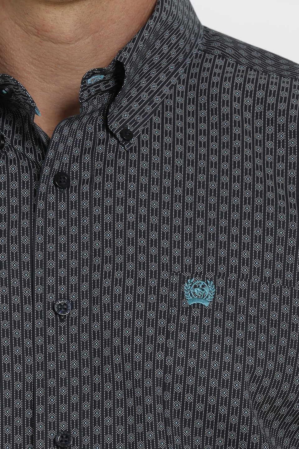 Choose an all-season navy printed button down like this one to highlight your favorite blue jeans or khaki pants. Our powerhouse shirt features a classic design with dense geometric print, white buttons, and open left front pocket with embroidered CINCH logo.