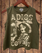Country Deep Vintage Adios Cowboy Muscle Crop top A feminine version of the muscle crop tank, this womens flowy scoop neck tank top is a must-have style, designed with exceptionally soft cotton fabrication that softly drapes around curves.