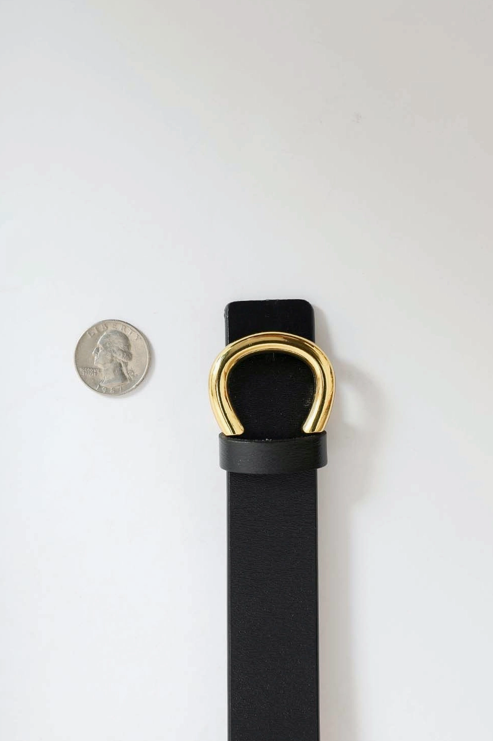 Add a dash of minimalist glamour to your collection with the Minimalist Gold Horseshoe Belt. This belt goes beyond mere functionality—it's a refined statement piece. The gold horseshoe buckle lends an air of subtle sophistication, serving as a tasteful centerpiece without overwhelming the look. Designed to be equally at home cinching a sleek dress or adding flair to a pair of tailored trousers, this belt offers a touch of elegance with a modern twist. 100% Genuine Leather