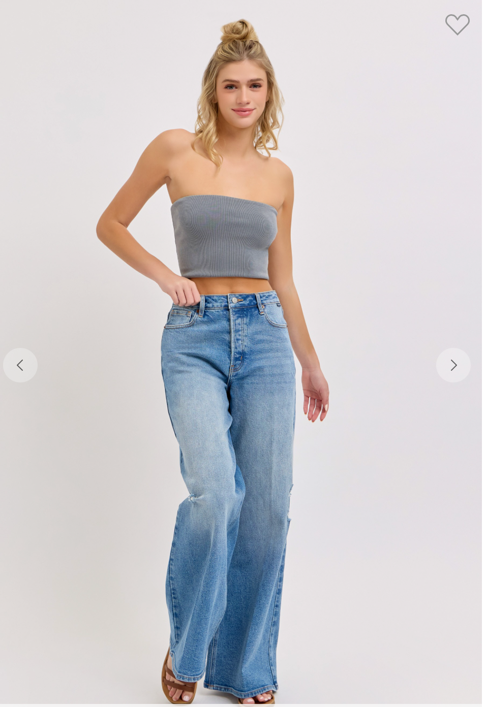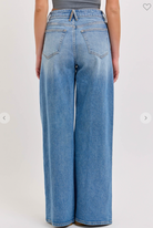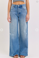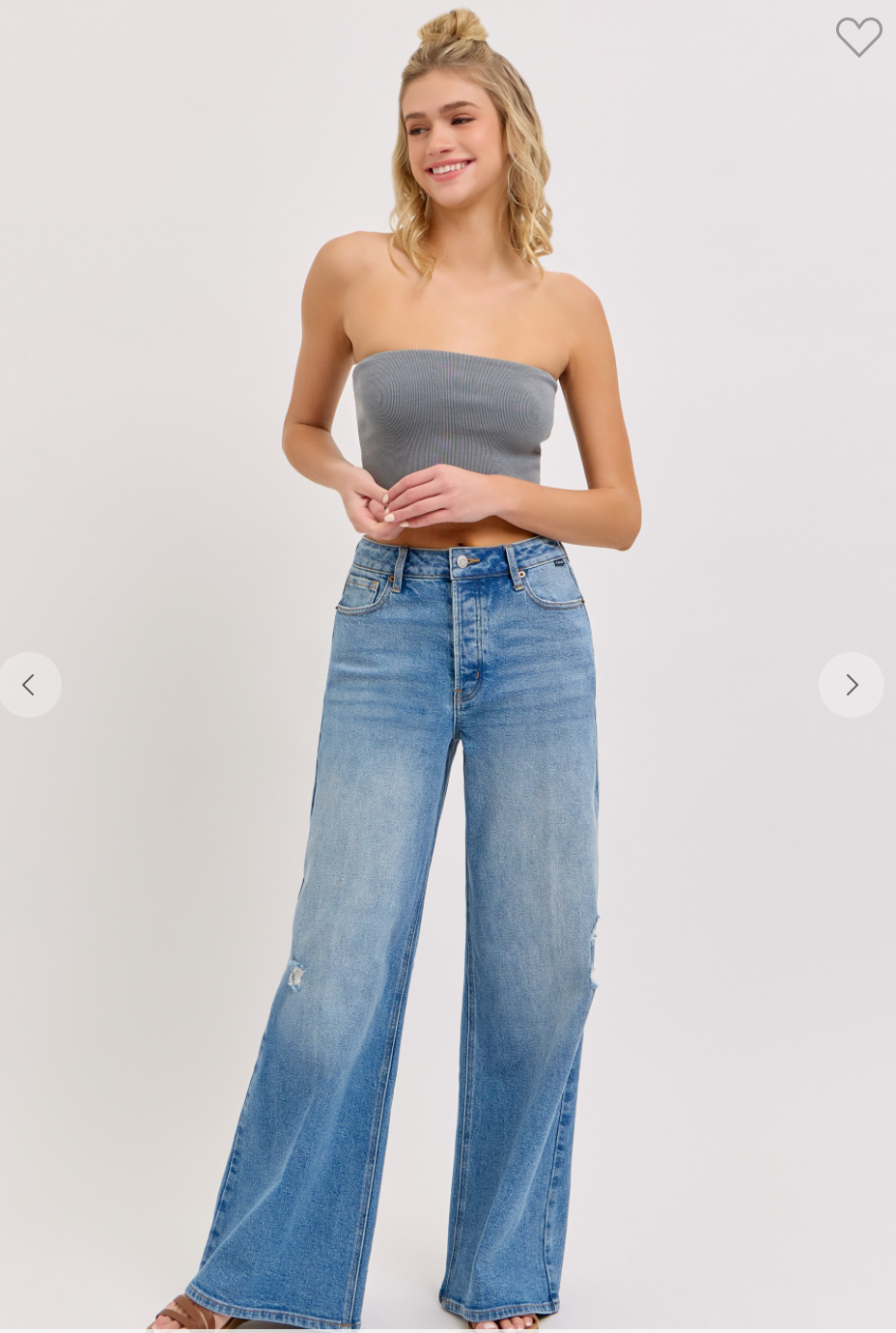 32" Inseam High Rise Wide Leg Zipper Belt loops Medium Denim Import FRONT RISE 11 1/2", INSEAM 32" Fabric Content: 99% Cotton, 1% Spandex