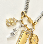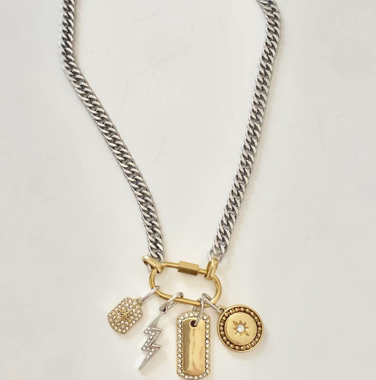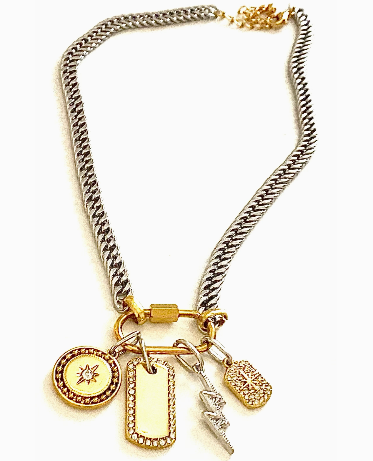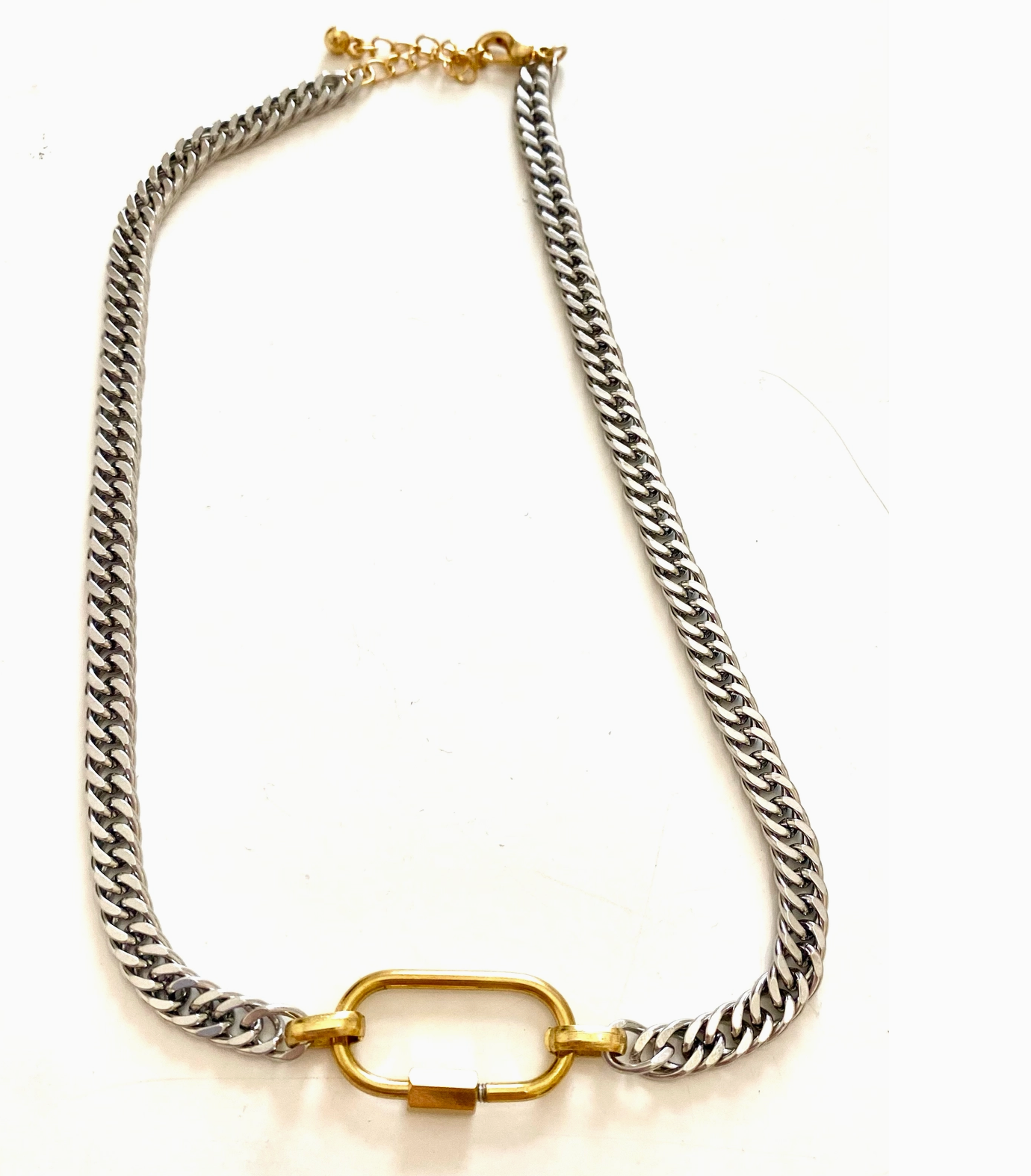 The Carabiner Screw Lock Necklace is a timeless jewelry staple as a pendant. The Carabiner Collection allows you to stack your charms and chains. Amulet link or Charm Collection Holder. Add an subtract charms or wear as a simple statement Mixed metal Star piece Created in a stainless steel model making it difficult to make but stunning and long lasting. 14K Genuine gold plated then EP coated. Hand set foil back Crystals. Lobster Claw Clasp and Steel Chain and extender. Waterproof Hypoallergenic Working Carabiner