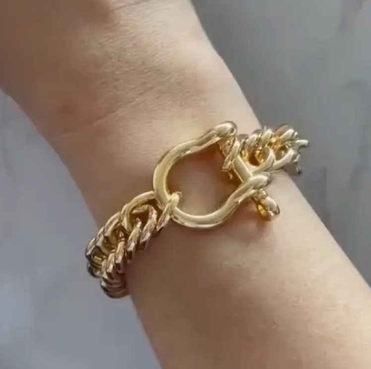Horse Bit Carabiner. Horse Bit carabiner opens to hold your charms. This is the Updated Equestrian Charm Necklace. Cuban Steel Chain. Lays flat on the wrist. Screw opens at the Bit. Comes with horn charm that can be removed Stainless steel Gold Two Tone 14K Genuine gold plated Lobster Claw Clasp Steel Chain and extender. Waterproof Hypoallergenic