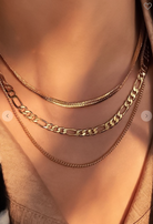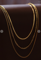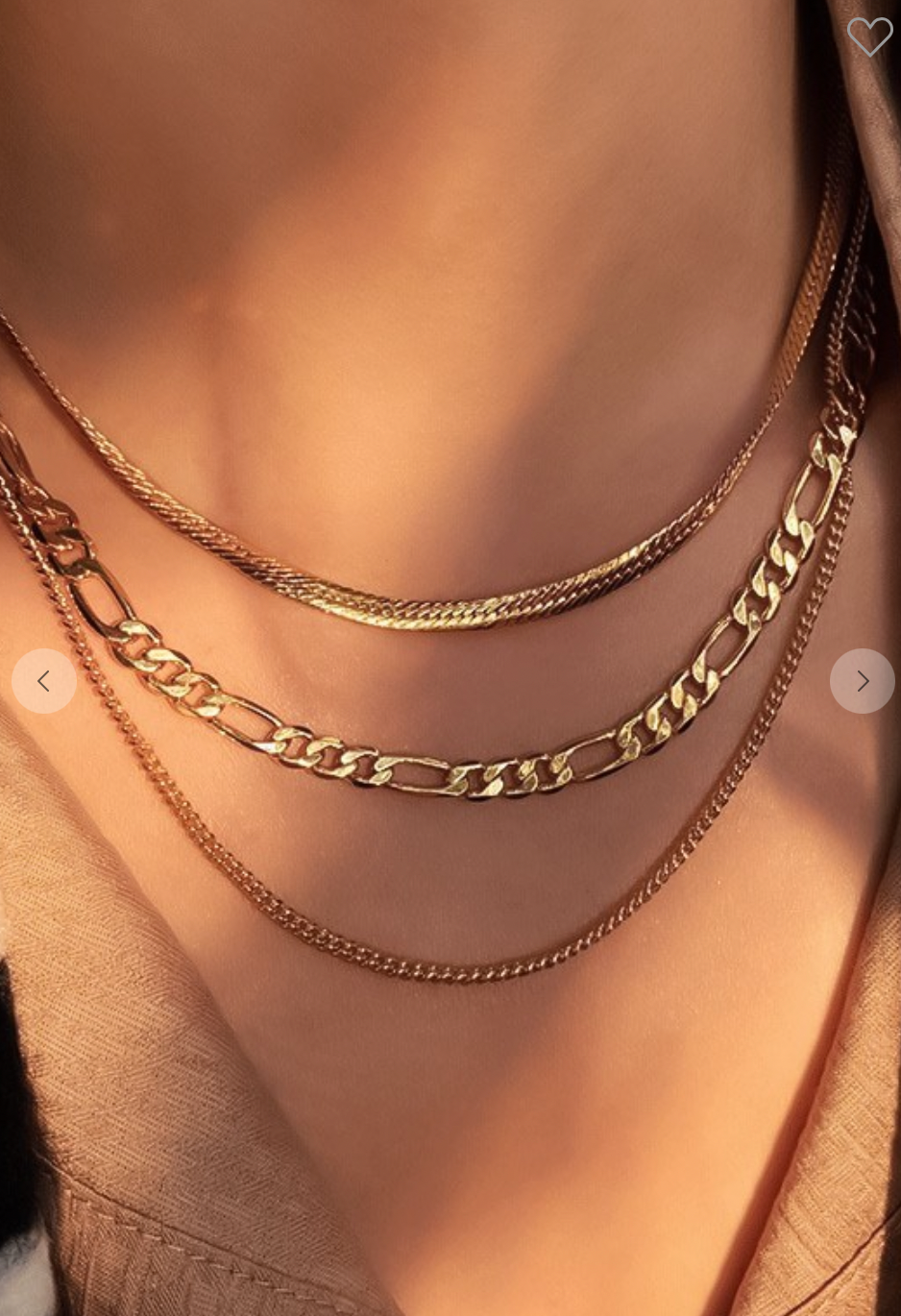Set of 3 layering necklaces including a herringbone chain necklace (15.5"L + extender), a Figaro chain (18"L + extender) and a small curb chain necklace (20"L + extender)