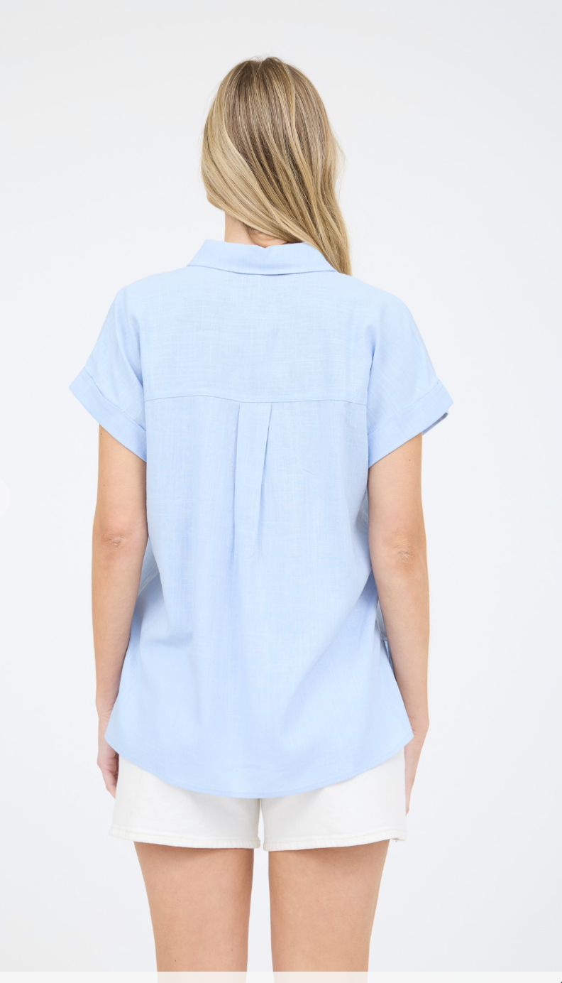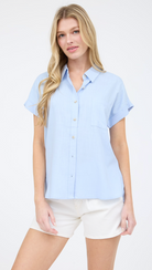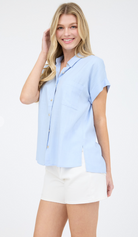 COLLARED SHORT ROLL SLEEVES BUTTON DOWN POCKET SOLID NOT LINED WOVEN TOP SELF: RAYON 80%, LINEN 20