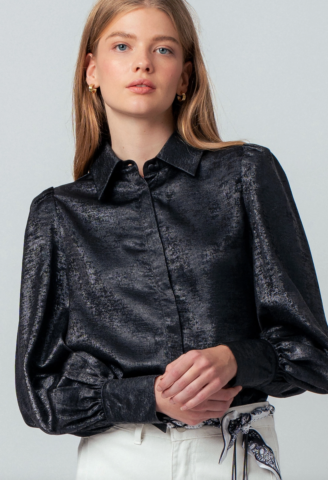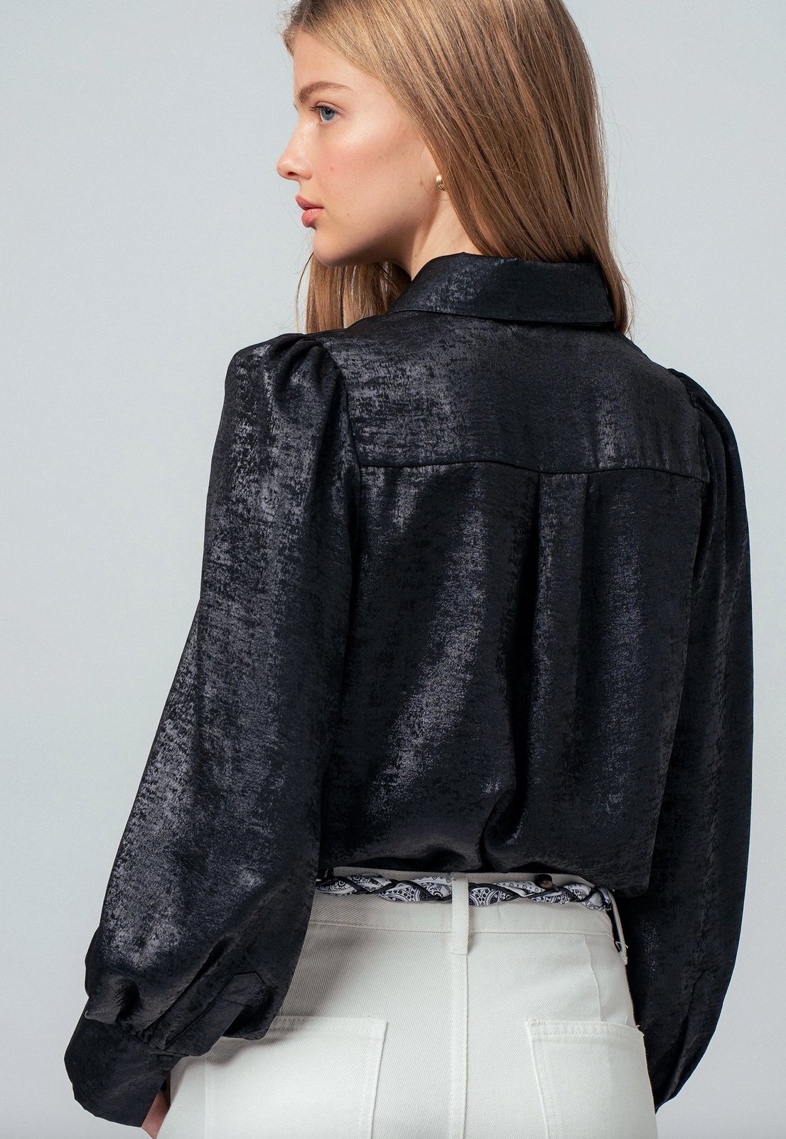 Make a shimmering statement with this textured Black bronze metallic blouse. Designed to bring effortless glamour to any holiday or evening look, its lustrous fabric catches the light beautifully. The classic button-down silhouette is elevated with dramatic puff sleeves, creating a chic and festive piece. Material: 100%polyester Design: Classic button-down front with a polished collar Fit: Relaxed silhouette for elegant draping Details: Features statement puff sleeves and wide buttoned cuffs