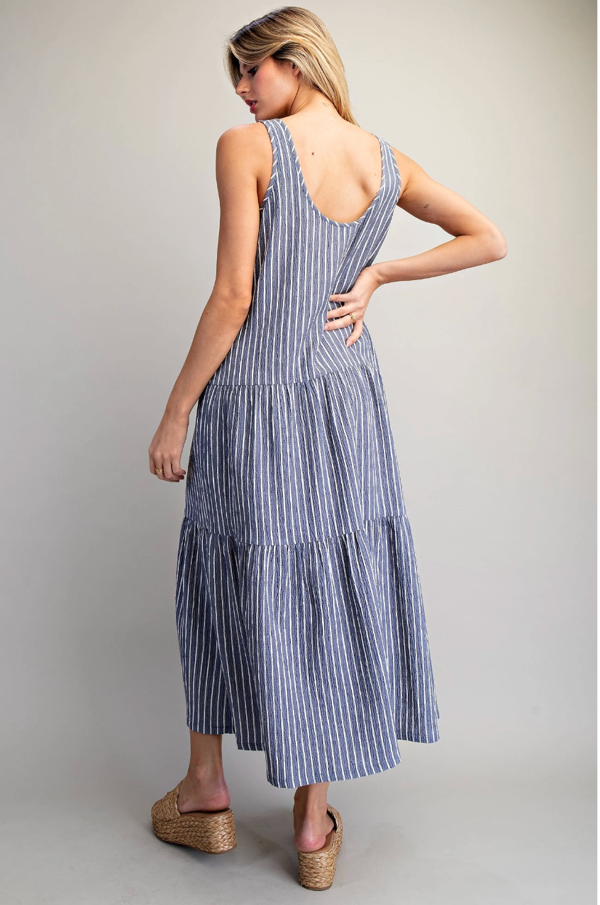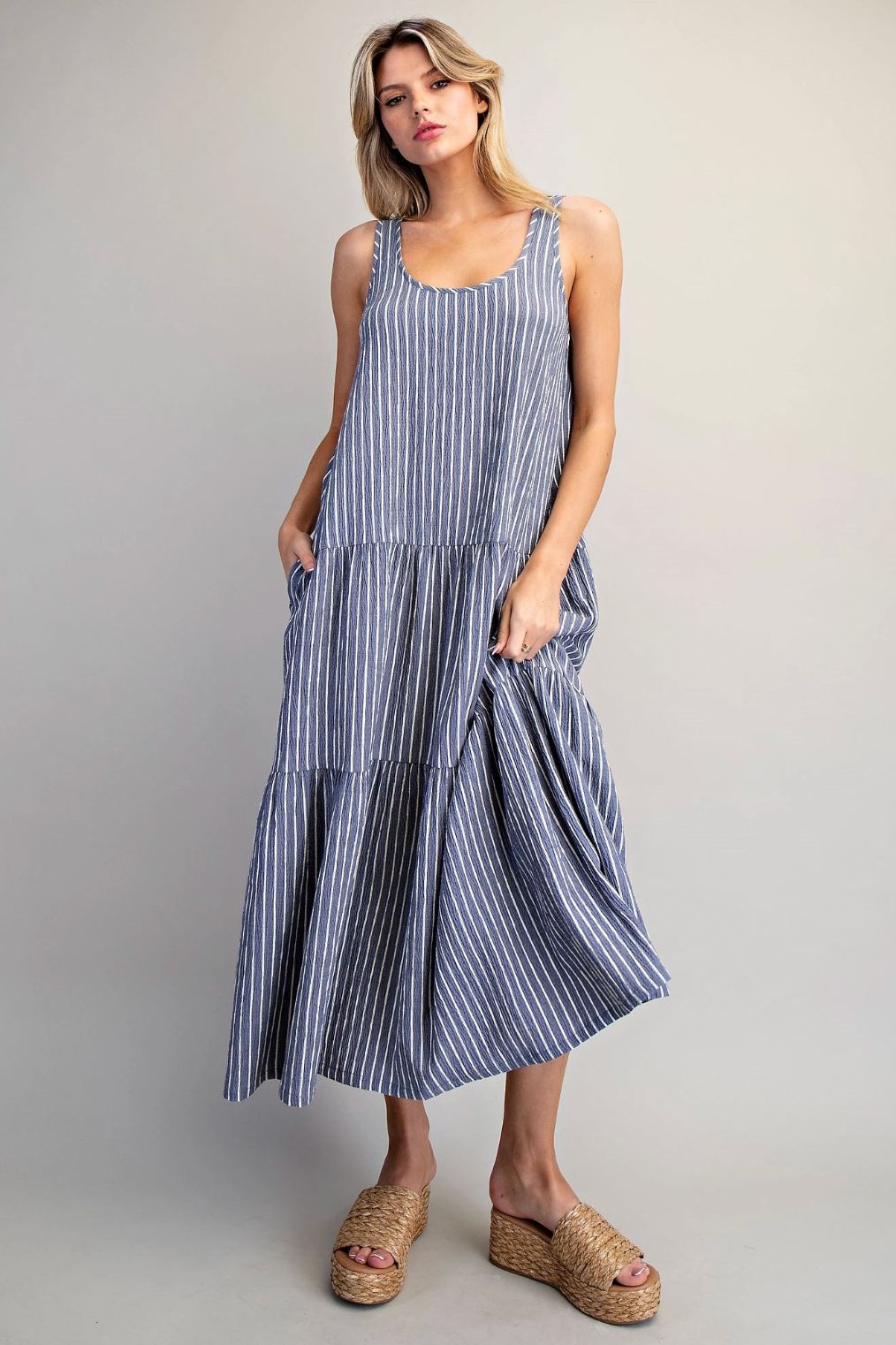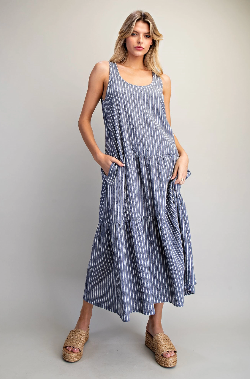 This tiered maxi dress features a scoop neckline, thick shoulder straps, subtle vertical stripes, two side pockets, and a flowy tiered silhouette that drapes into a breezy, ankle skimming hem for an effortless summer look.