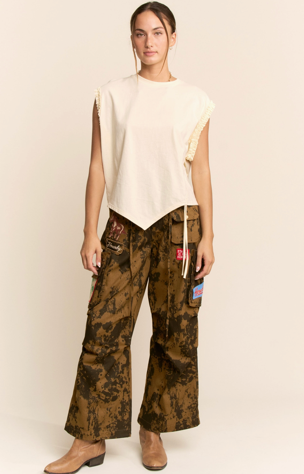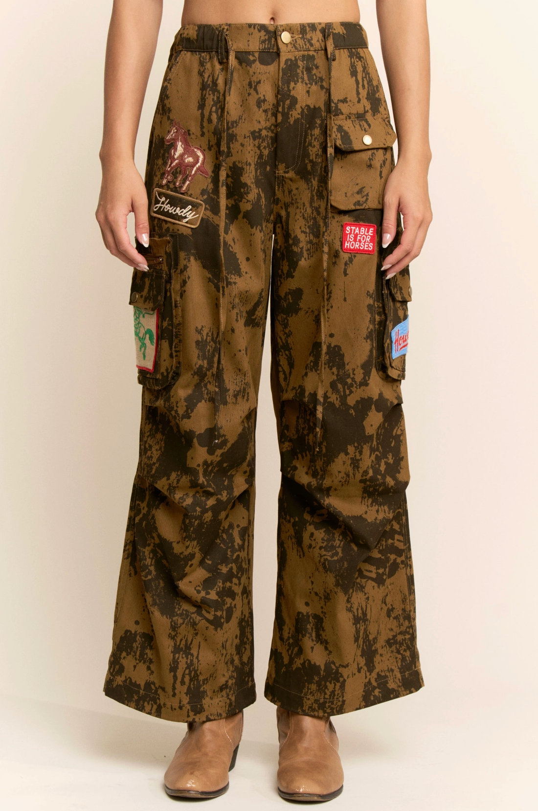 Western-inspired washed effect cargo pants featuring a bold cow camo print and playful embroidered patches. Designed with multiple utility pockets and a relaxed wide-leg fit for a rugged yet wearable look. A standout piece for boutique buyers seeking unique, trend-forward casualwear. Model is wearing Small Height: 5'10" Bust : 34 Waist : 25” Hips : 35”