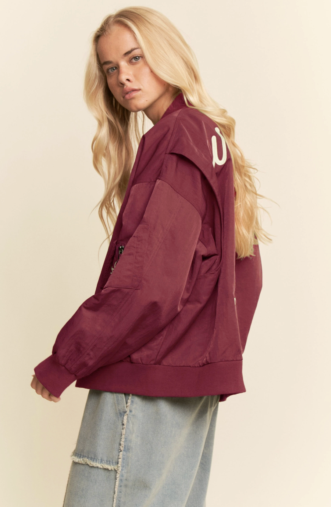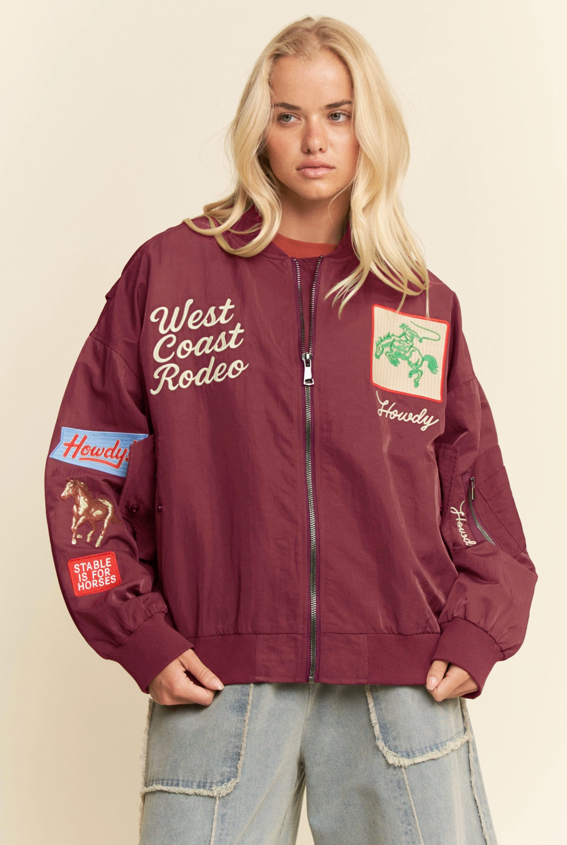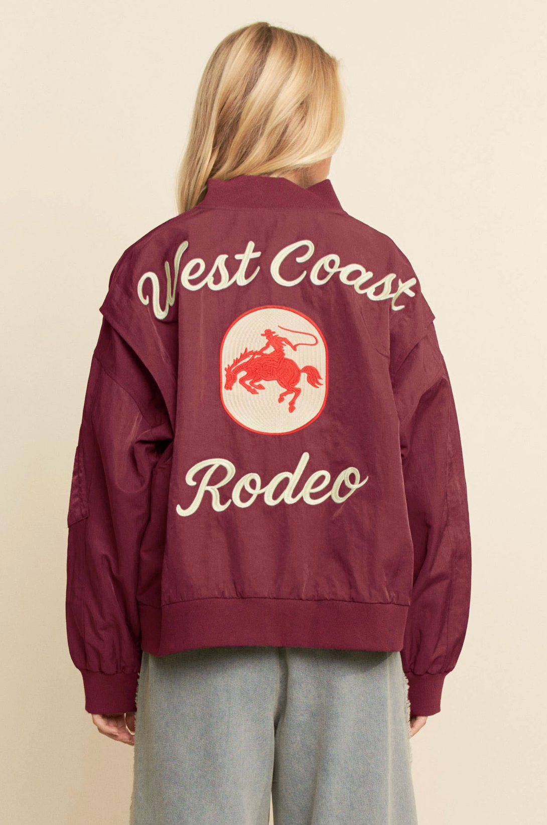 Western-inspired bomber jacket with bold cowboy embroidery and "West Coast Rodeo" lettering. Lightweight nylon shell with ribbed cuffs and hem, zip front, side pockets, and sleeve pocket. Available in Olive Green and Black. Perfect statement piece for boutiques, festival fashion, and streetwear collections. Details: Construction: 100% Nylon shell Fit: Oversized bomber fit