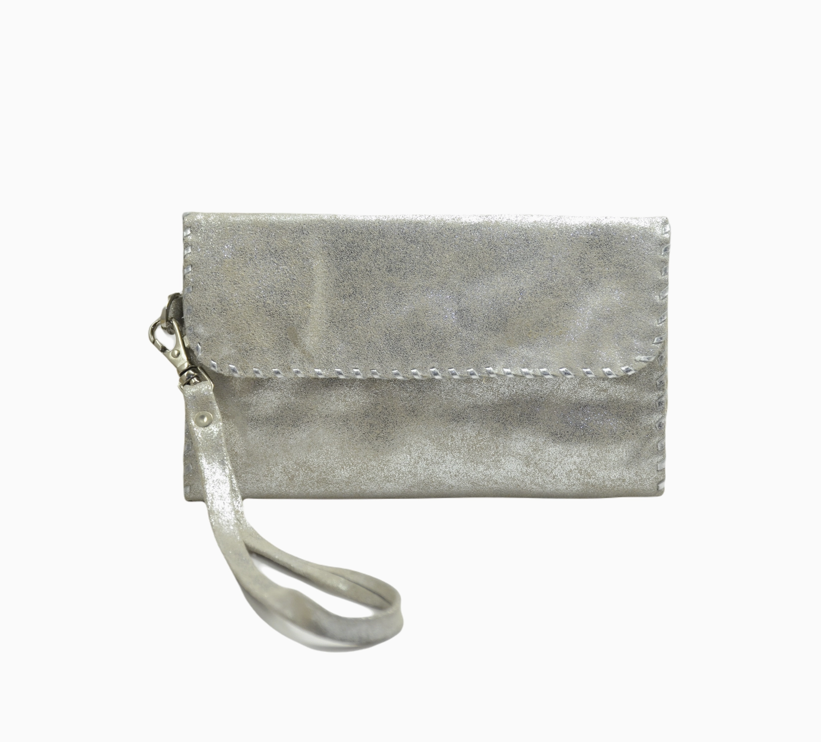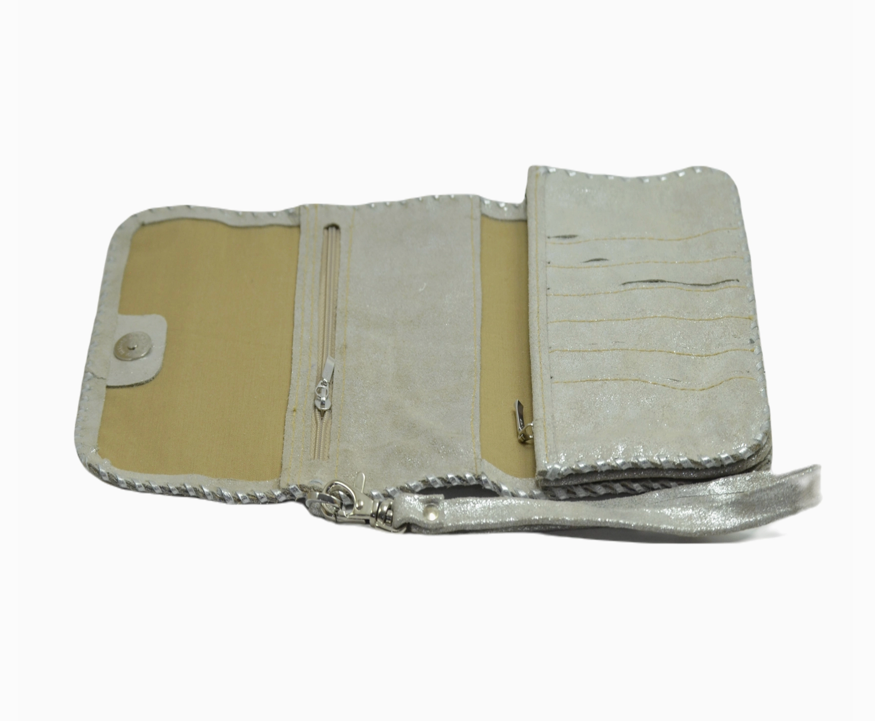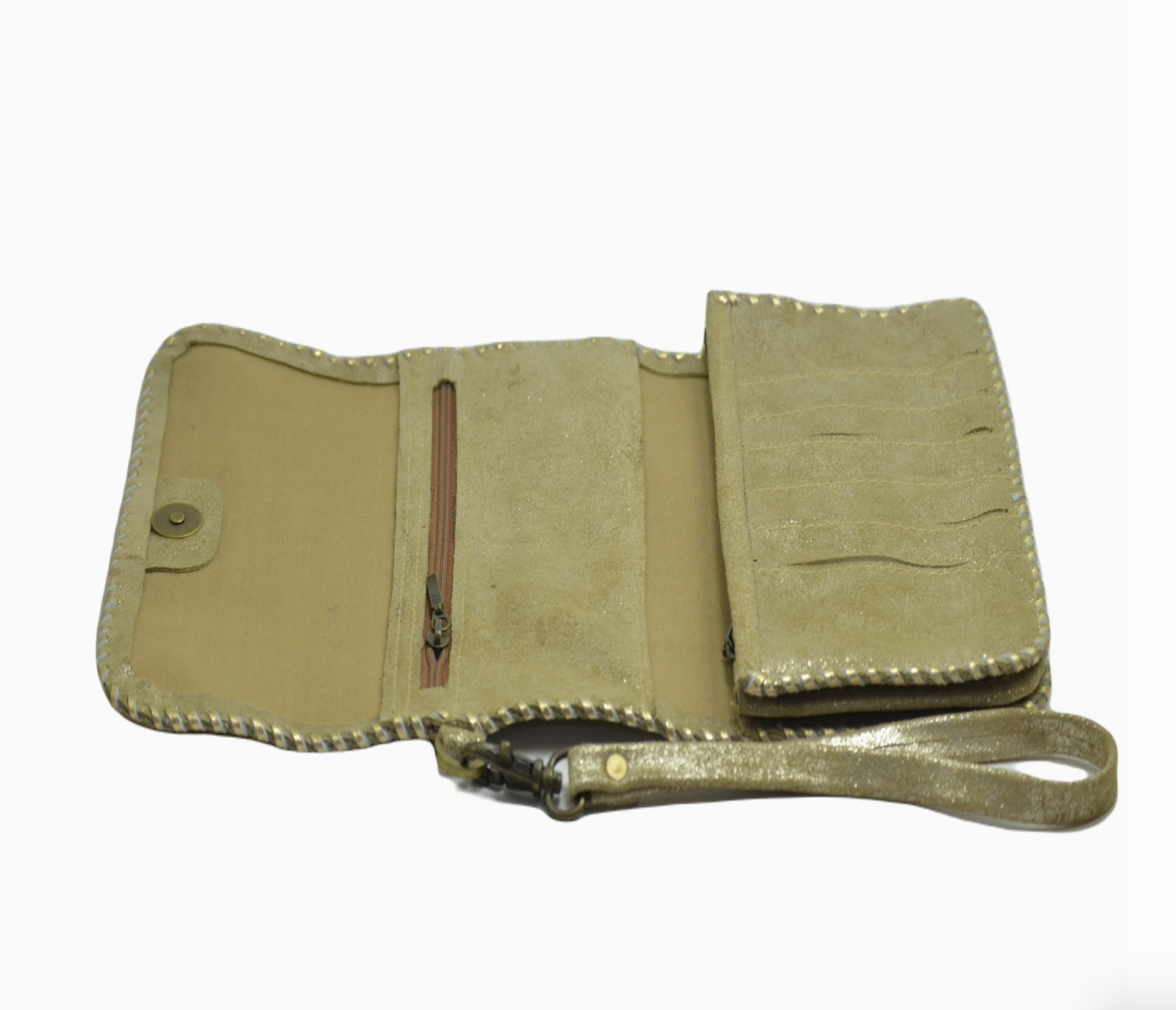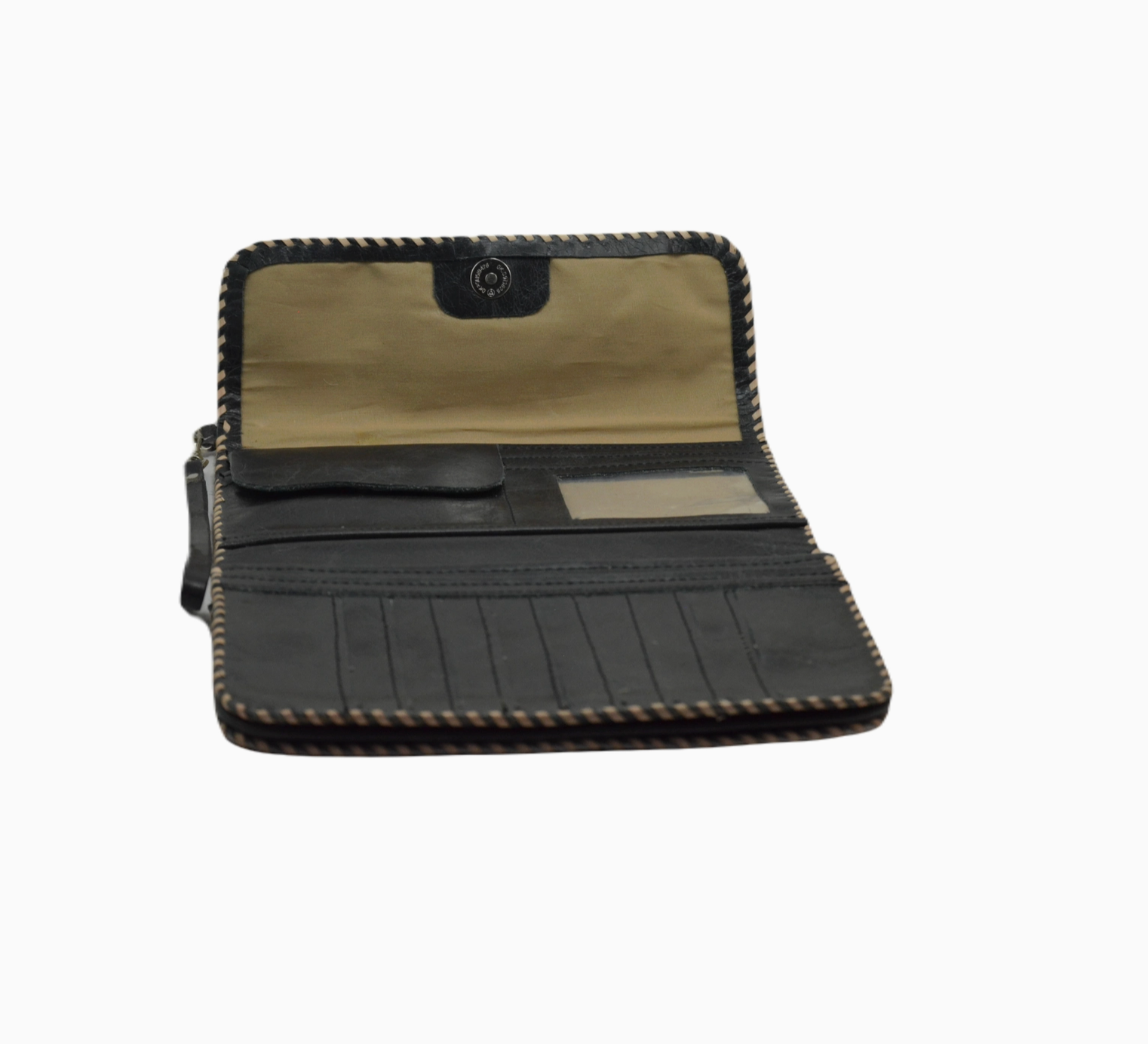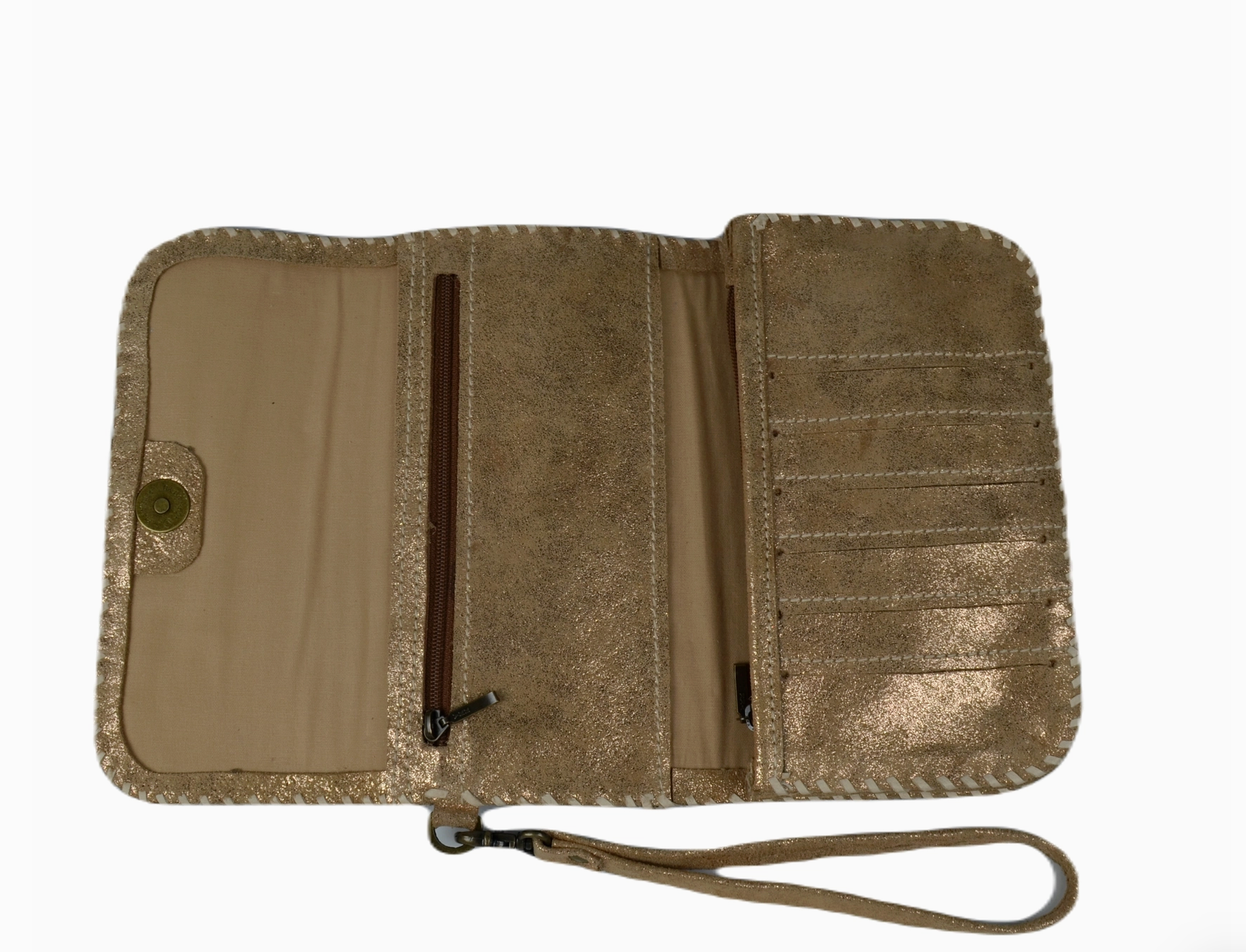 Handmade trifold wallet with cotton lining. Made with cowhide hairon leather. Hand-stitched using leather strips creating beautiful whipstitch detailing. Magnetic Closure Compartments 2 Zipper Pockets 6 credit card slots Detachable wristlet