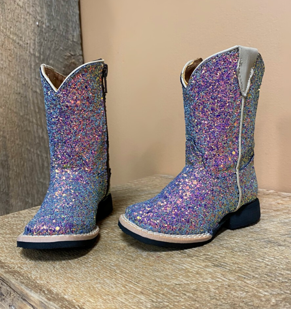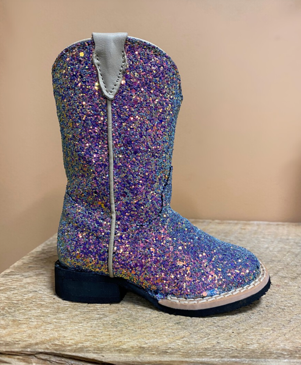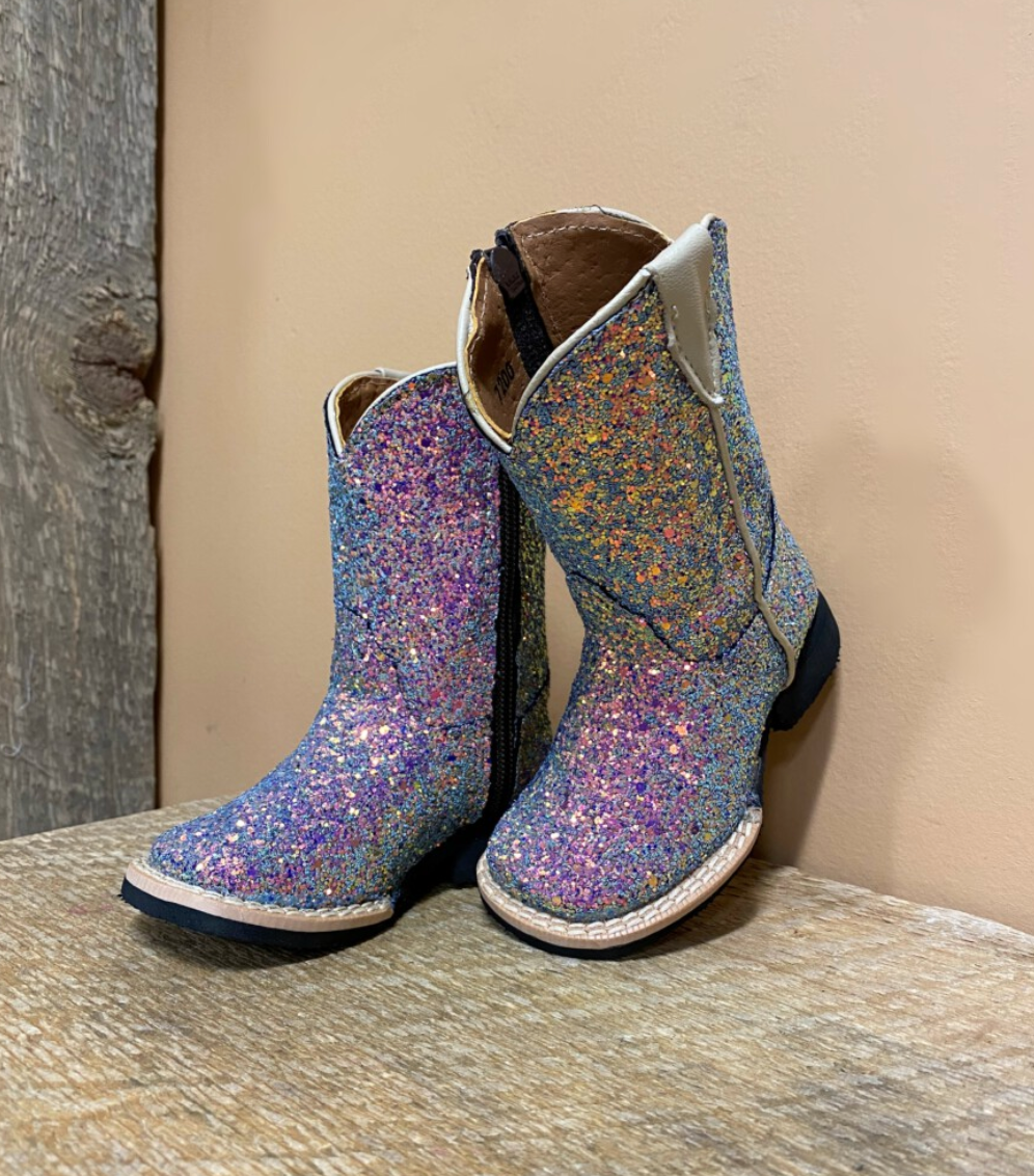 Just like your little cowgirl, the Kid's Mermaid Cowgirl Boots in Blue are all sparkle. These boots feature a square toe, full leather construction covered with blue iridescent glitter, leather sole, and walking heel.