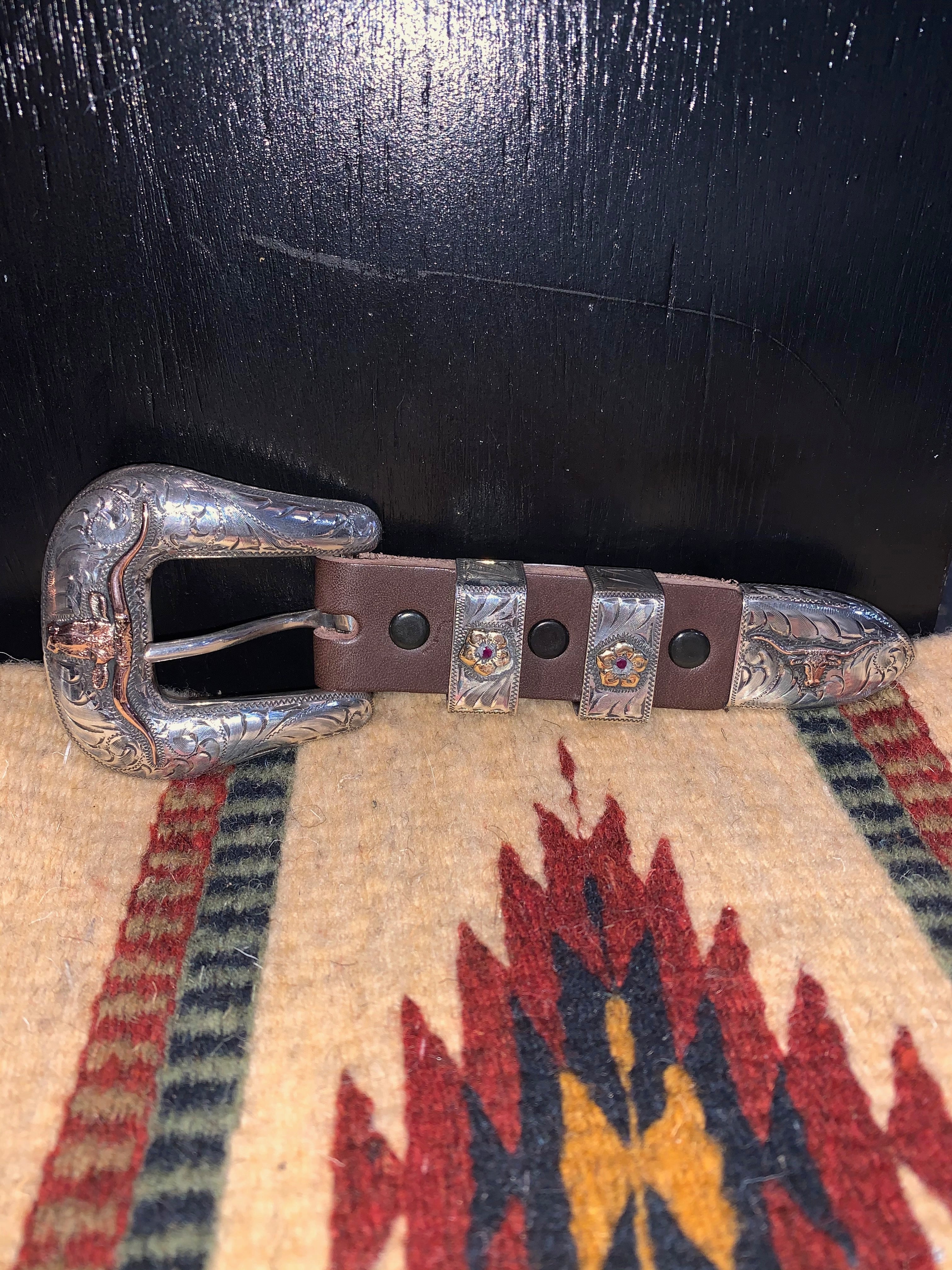 Sterling Silver 4 Piece 1" buckle set w/ 14k red gold longhorns