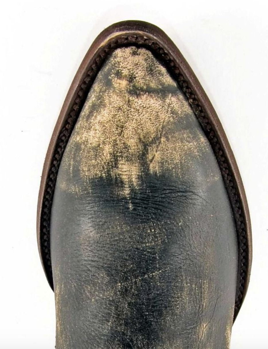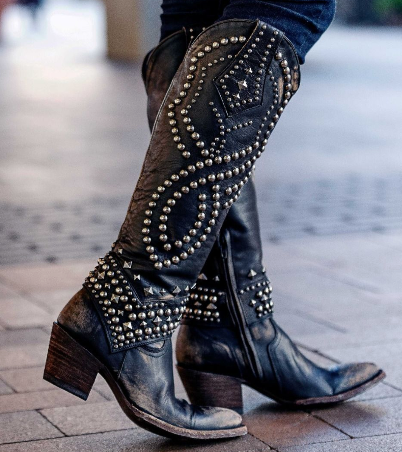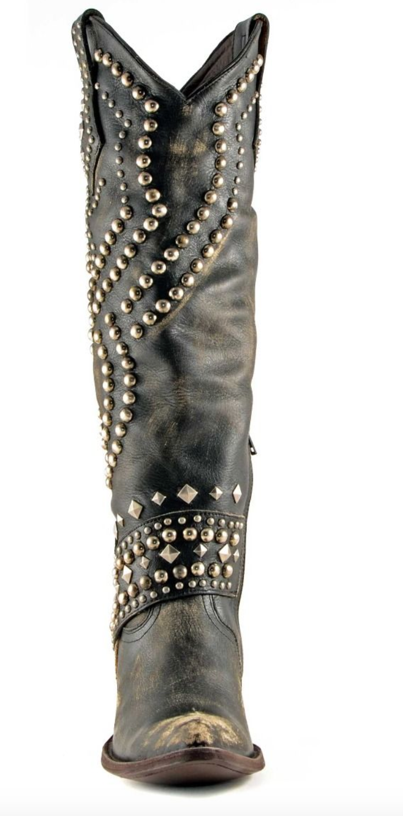 Rockeresque studded style that resides somewhere in between Fashion Forward and Western Glam Styling. Beige based black leather is heavily distressed and only looks better which age and wear. Colors may vary.