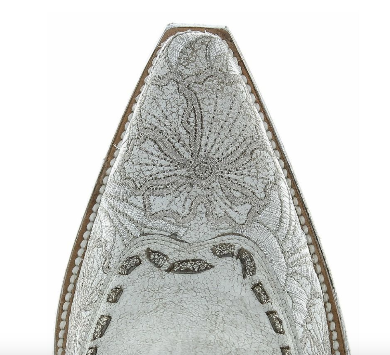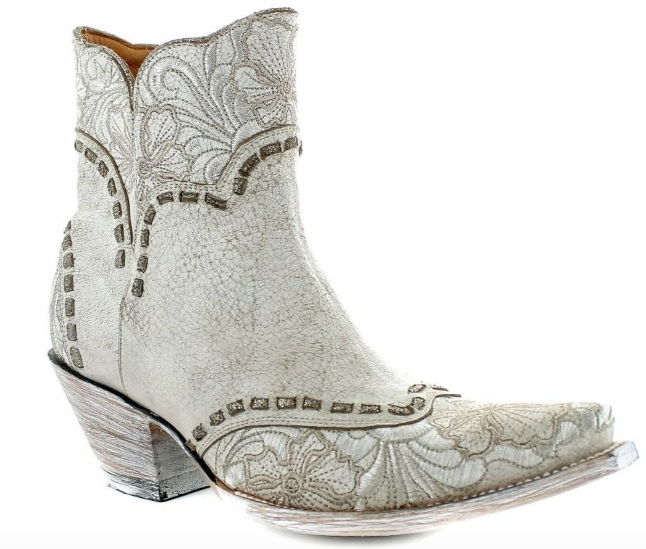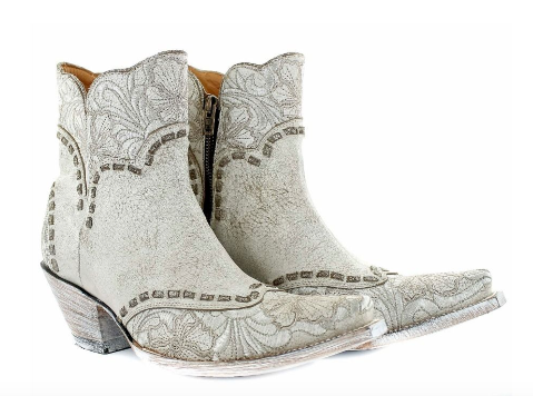 Signature Old Gringo Erin gets a classy update on a crackled taupe leather. Tonal floral embroidery with a pop of sparke makes it refined enough to be your wedding boot, while the scallop collar and crackled finish makes it rustic enough for the plains.