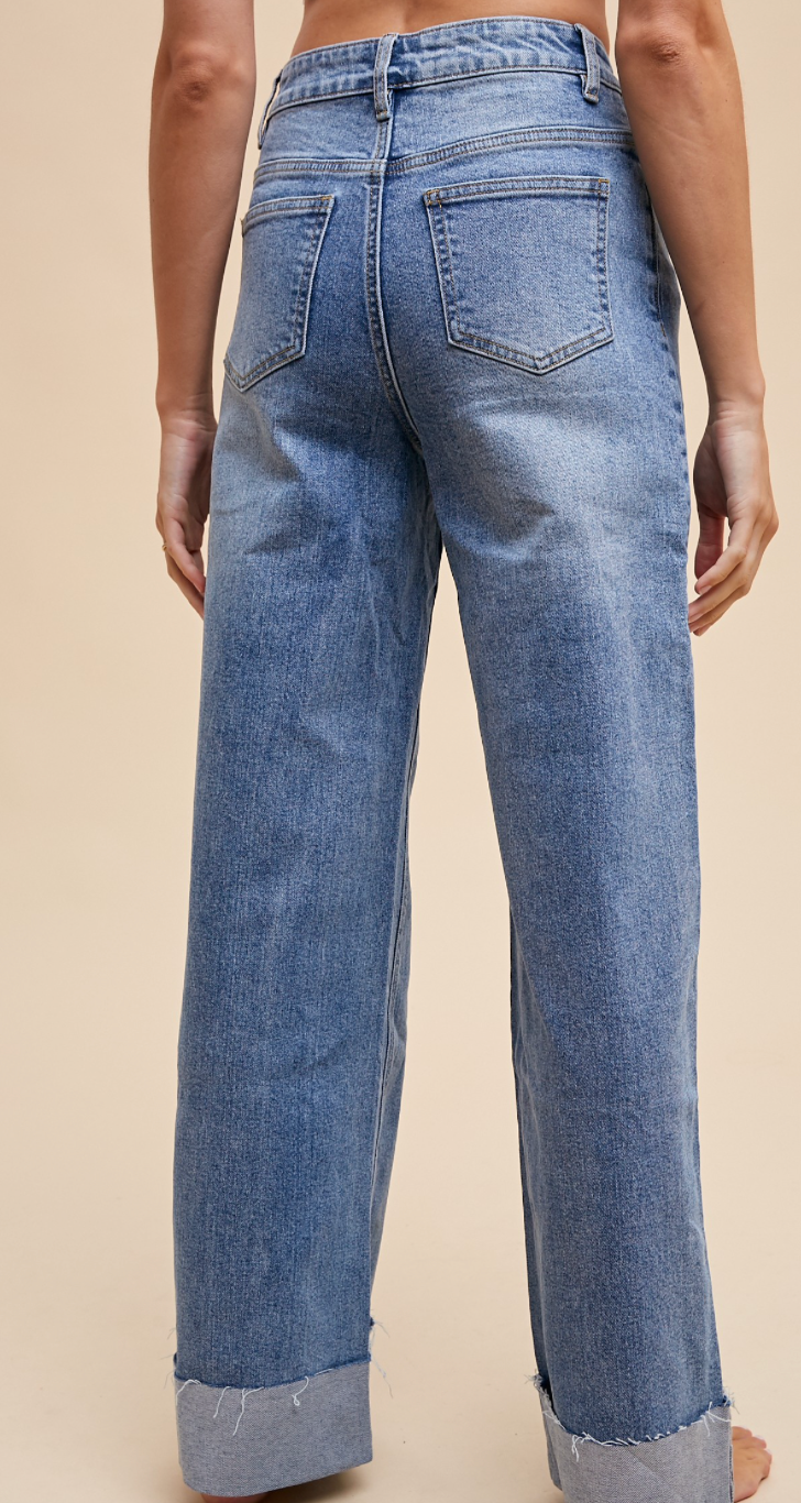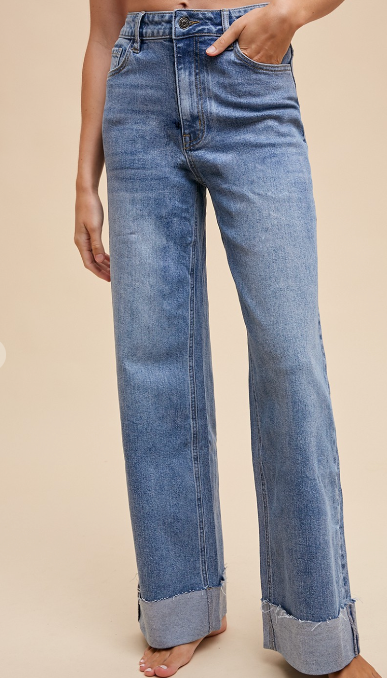 90S STYLE CUFFED HEM HIGH RISE STRAIGHT FULL LENGTH JEANS