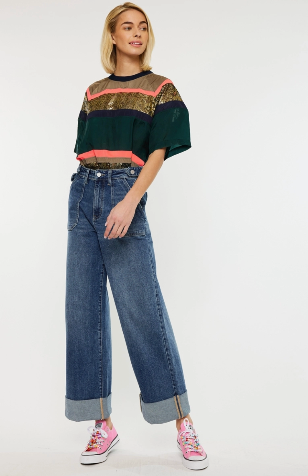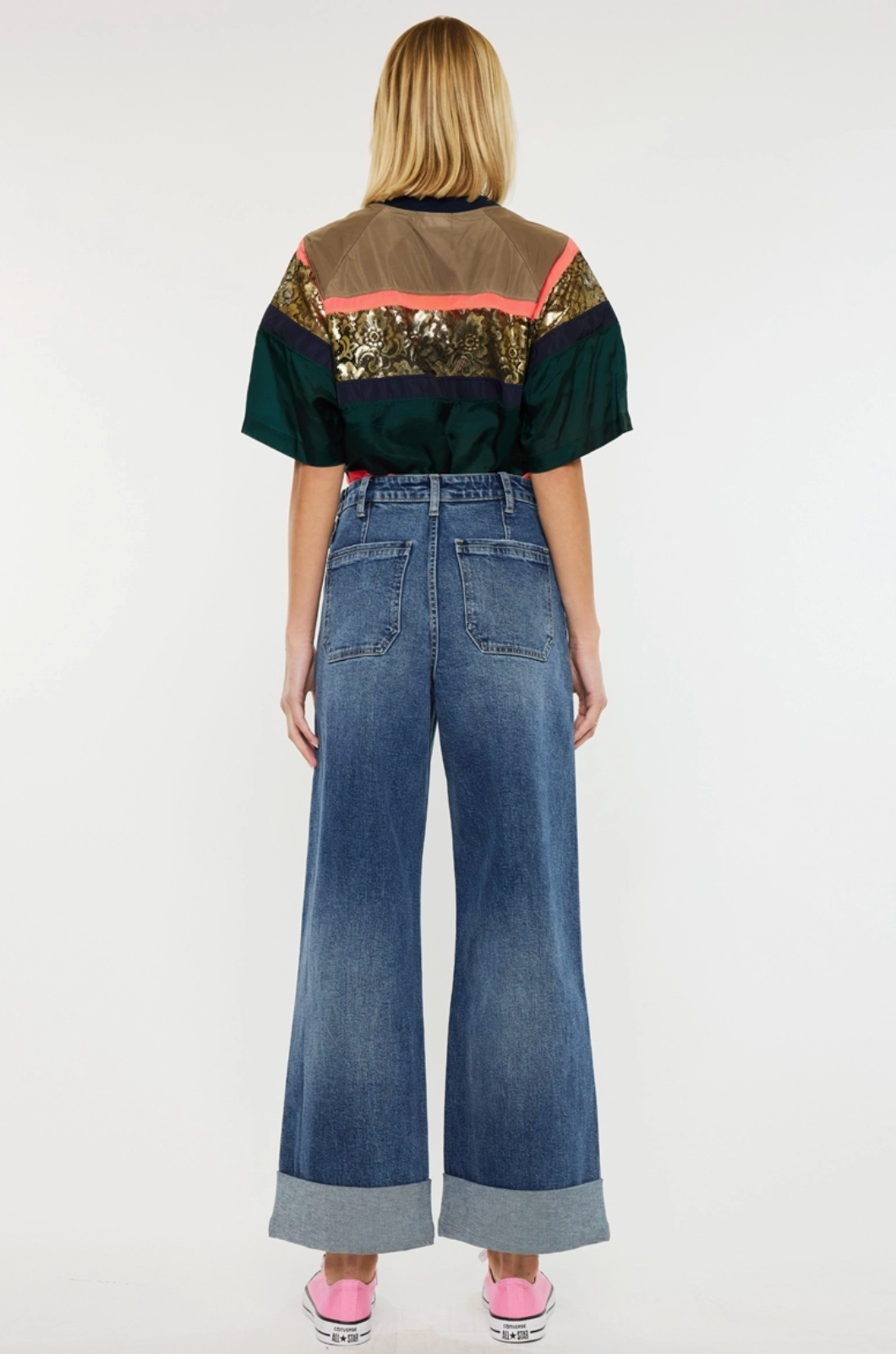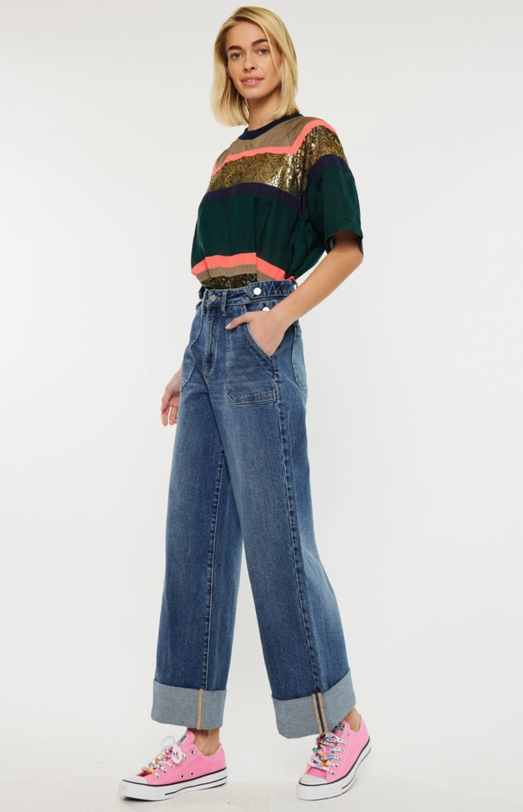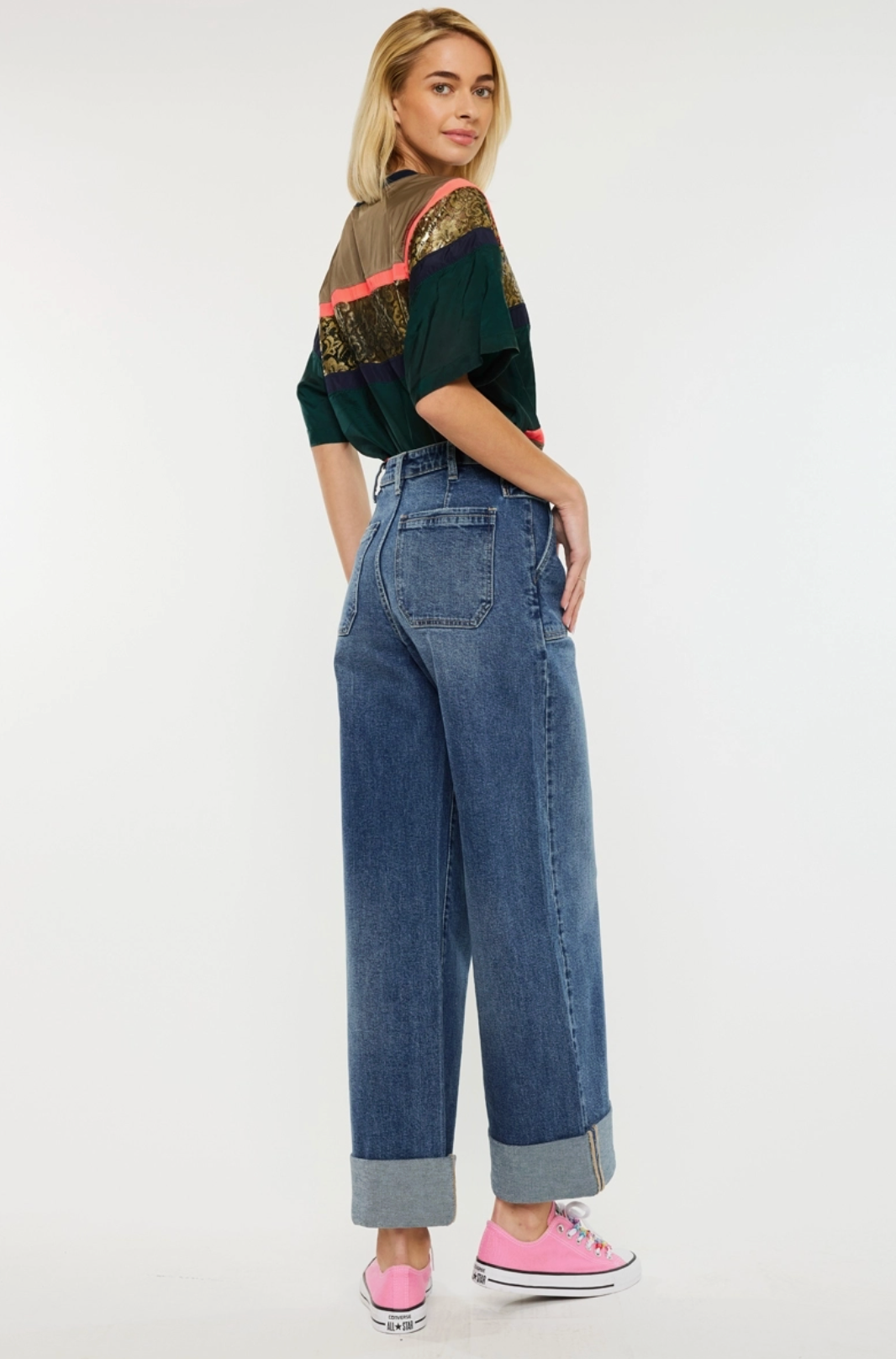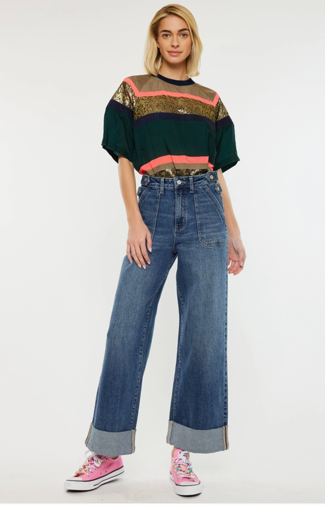 Ultra high rise 90’s wide leg trousers jeans Dark wash Comfort stretch 3” double cuff hem Front slant pockets Zipper fly 4 waistband adjusters w/ snap buttons Back darts Rise 12" inseam 28" wb 1.5" in size 5/26 98% cotton, 2% spandex