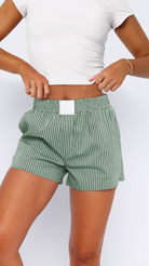 Soft, lightweight green striped shorts Elastic waistband with a white patch or detail in the center Casual and comfortable fit, perfect for lounging or casual wear Light and breathable fabric, ideal for warmer weather Paired with a simple white crop top for a relaxed look
