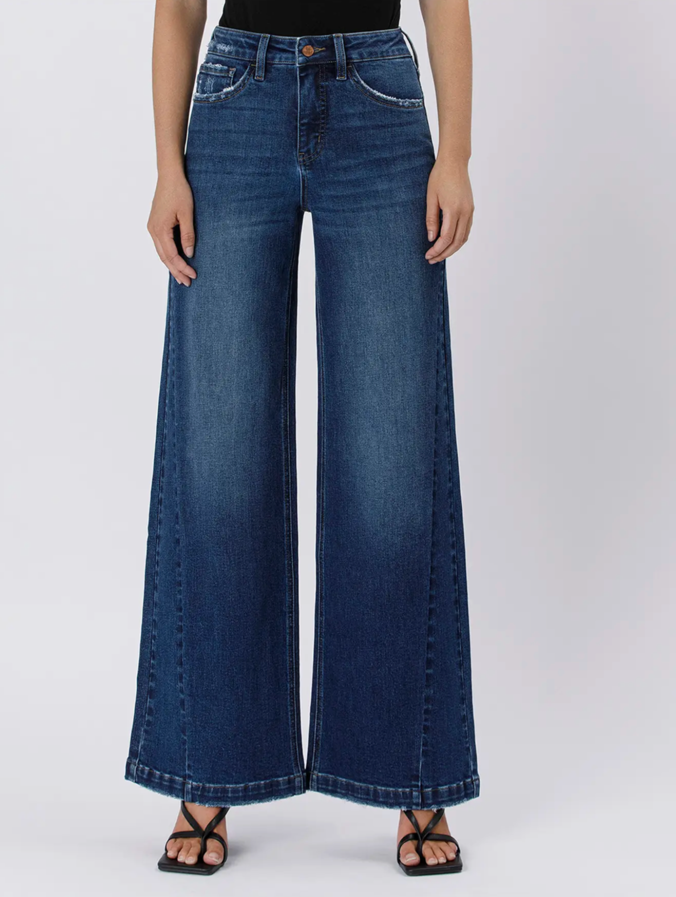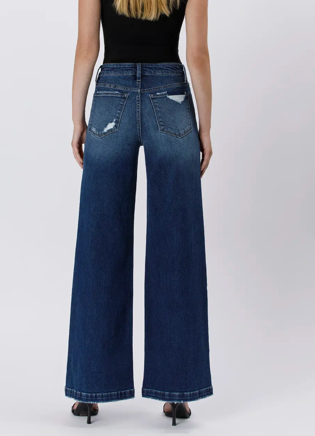 A lightly distressed finish and full-length wide leg silhouette give a modern yet timeless vibe, while the finished hem makes them versatile enough to dress up or down. Pair them with sneakers and a tee for casual cool or with heels and a blouse for an effortlessly chic night out.