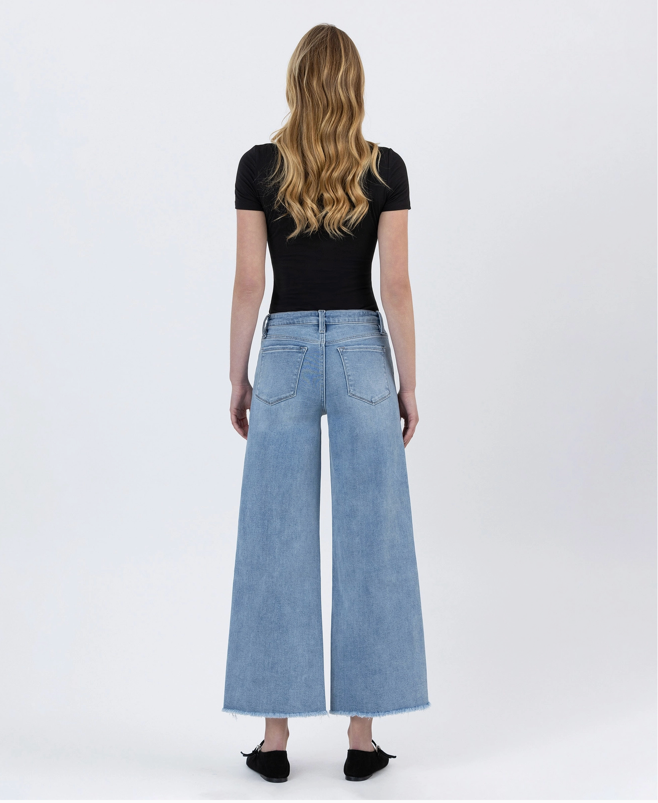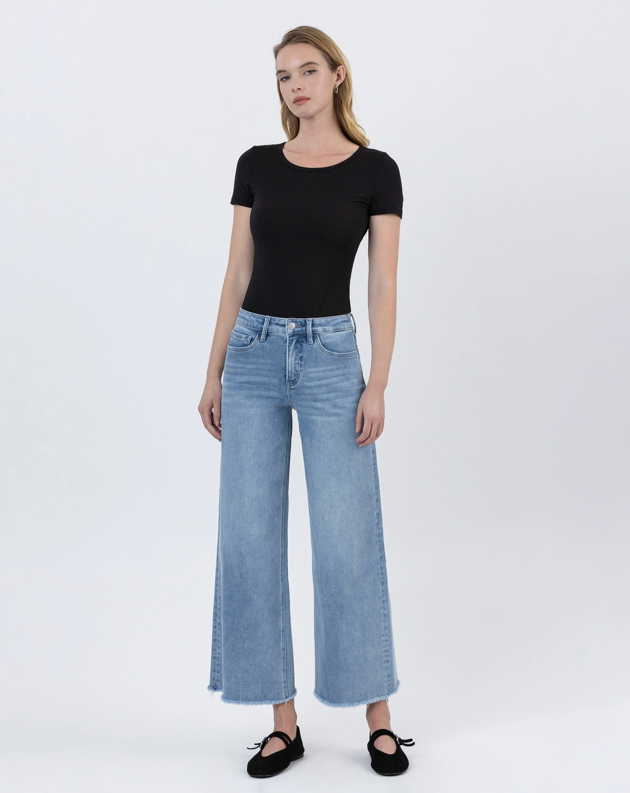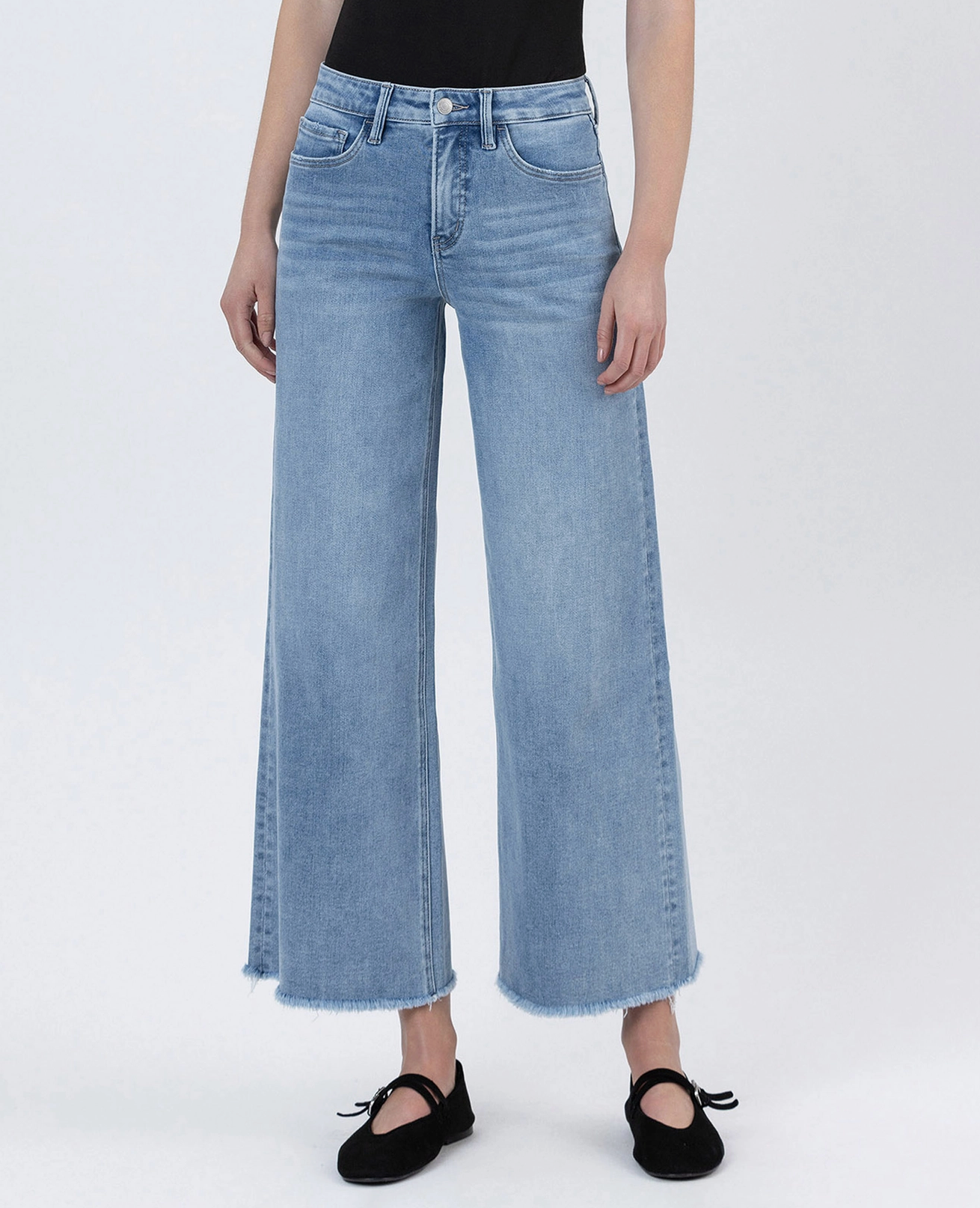 Mom Approved!!!! Tummy control high rise ankle wide leg jeans Comfort stretch denim, high rise waist, seamless waistband, frayed hem, ankle length, wide leg jeans Tummy control feature with inner panels for shaping and smoothing F. Rise: 10 1/4" / inseam: 27 1/4" / leg opening: 22 1/2" Model is 5'10" wearing a size 26