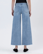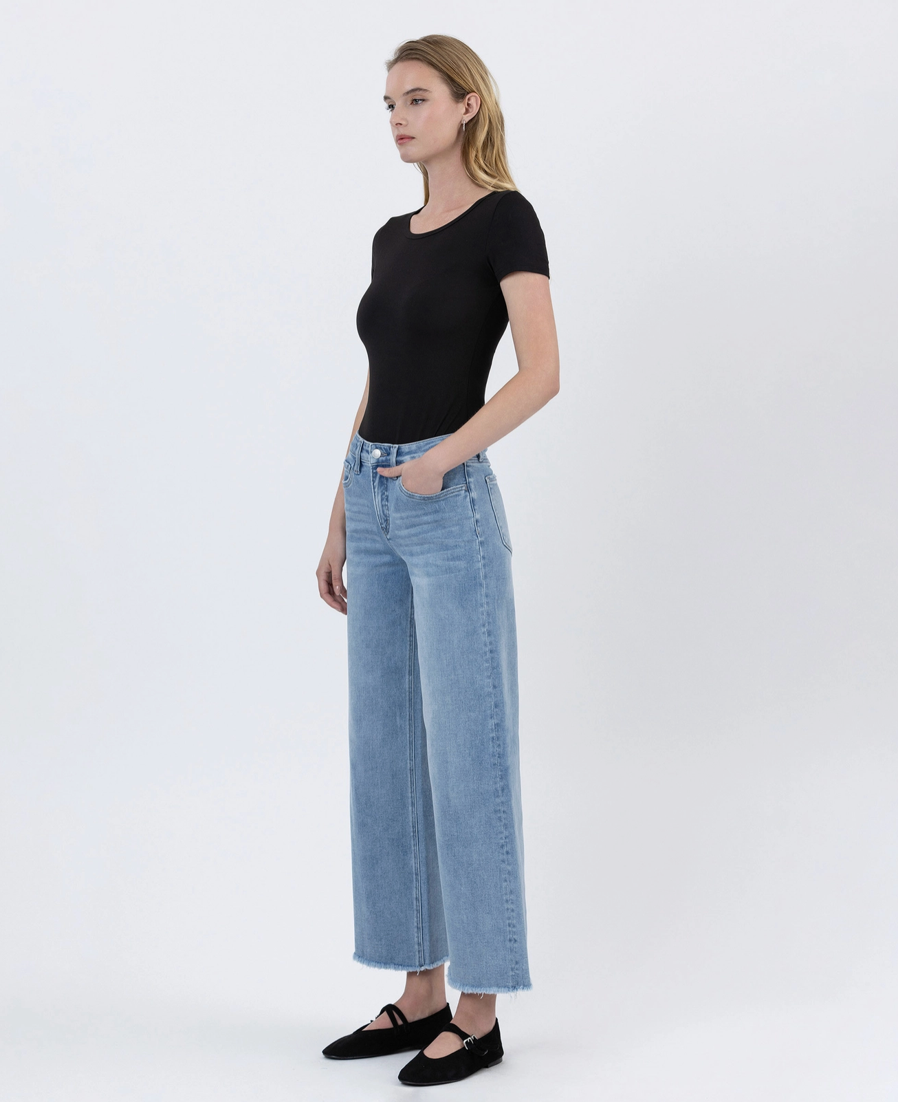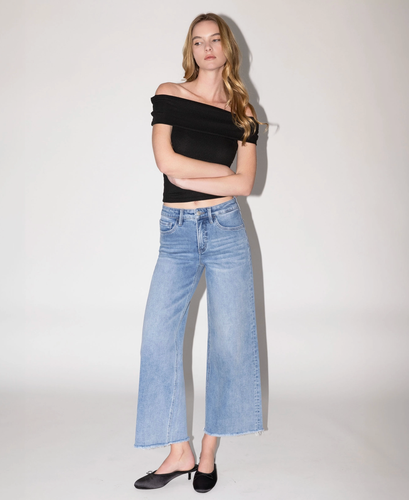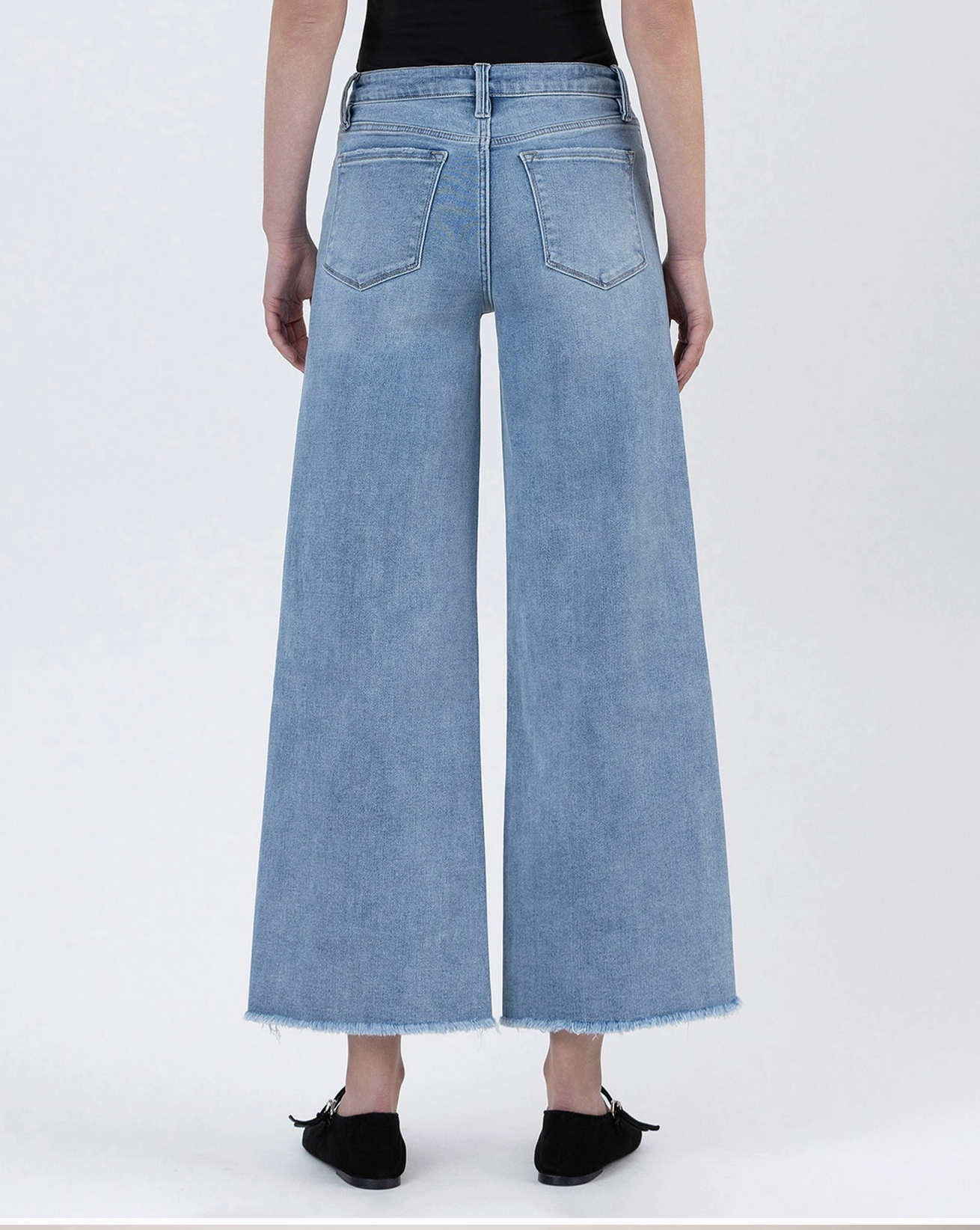 Mom Approved!!!! Tummy control high rise ankle wide leg jeans Comfort stretch denim, high rise waist, seamless waistband, frayed hem, ankle length, wide leg jeans Tummy control feature with inner panels for shaping and smoothing F. Rise: 10 1/4" / inseam: 27 1/4" / leg opening: 22 1/2" Model is 5'10" wearing a size 26
