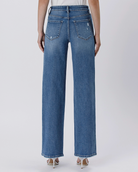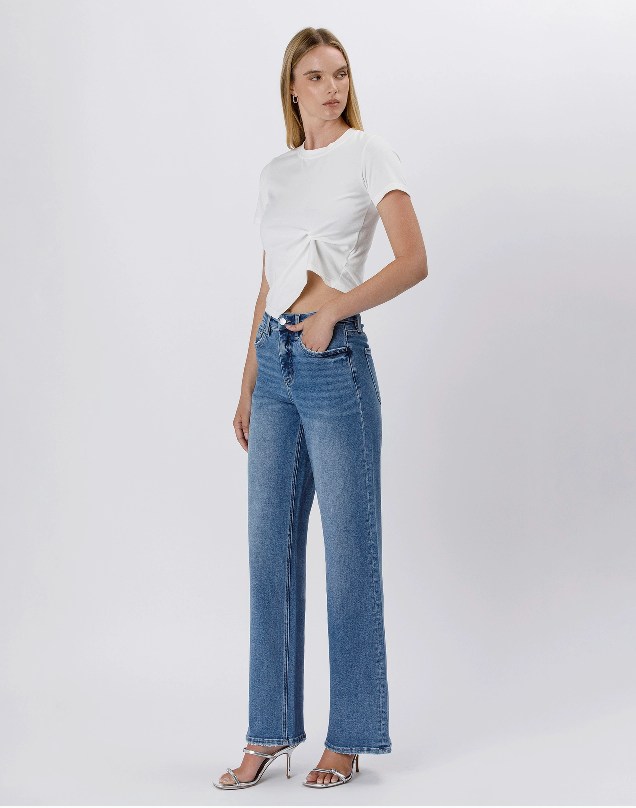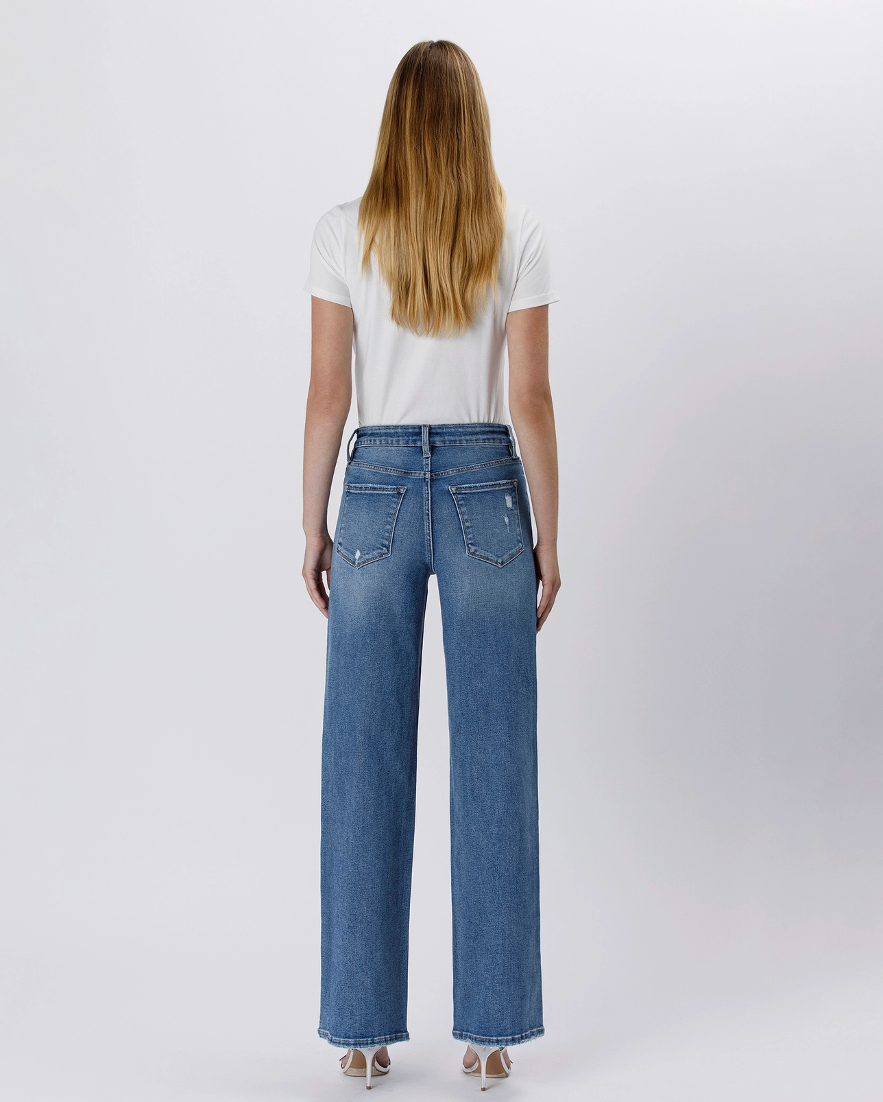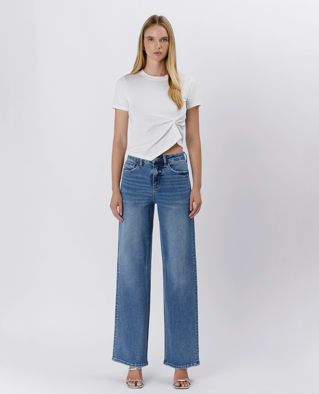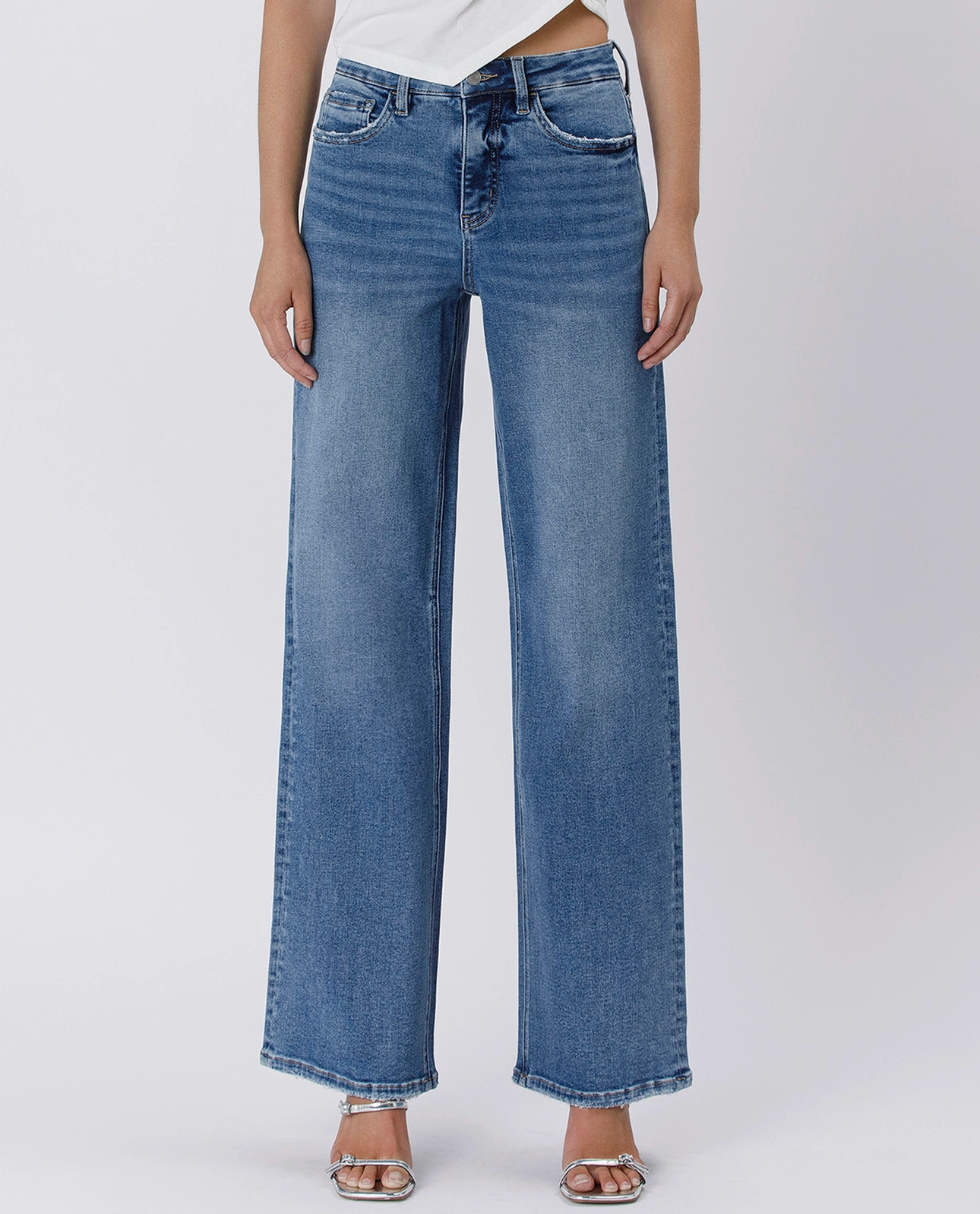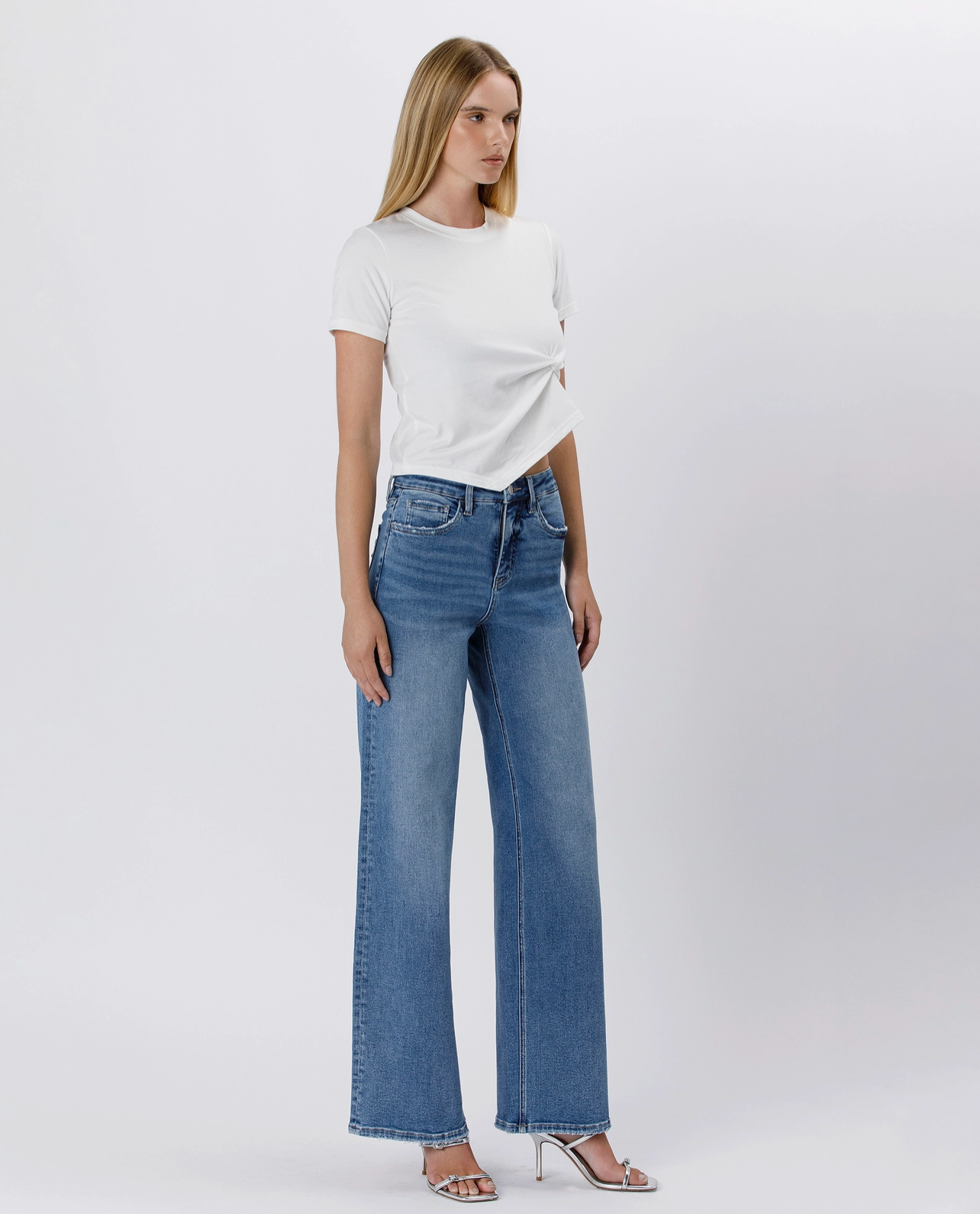 Tummy control super high rise baggy wide jeans Comfort stretch denim, super high rise waist, 5 pockets, lightly distressed detail, finished hem, medium dark wash, full length, baggy wide jeans Tummy control feature with inner panels for shaping and smoothing F. Rise: 11" / inseam: 32 1/2" / leg opening: 21" Model is 5'10" wearing a size 26