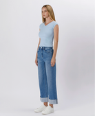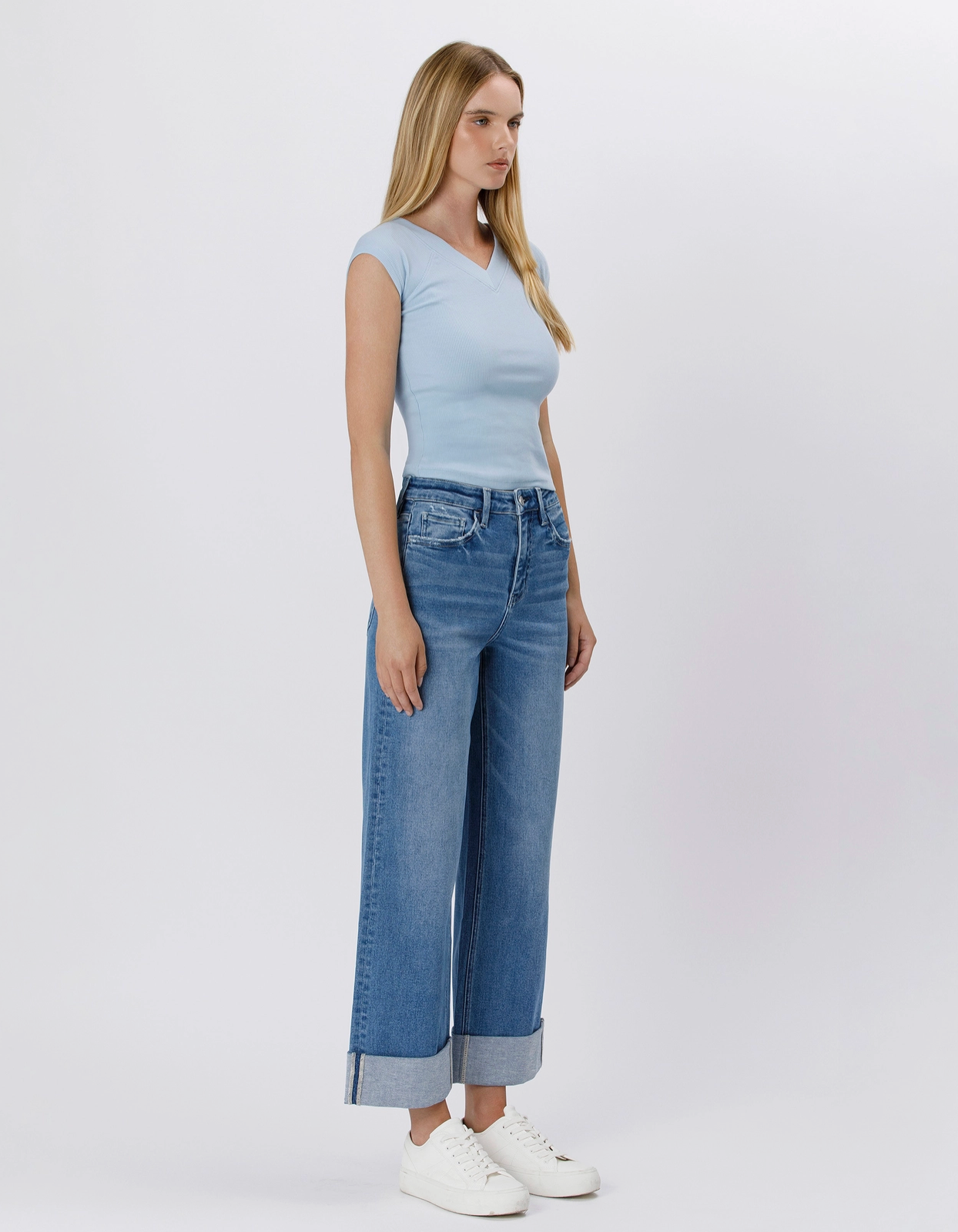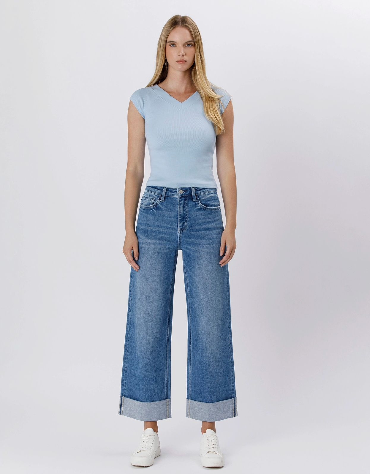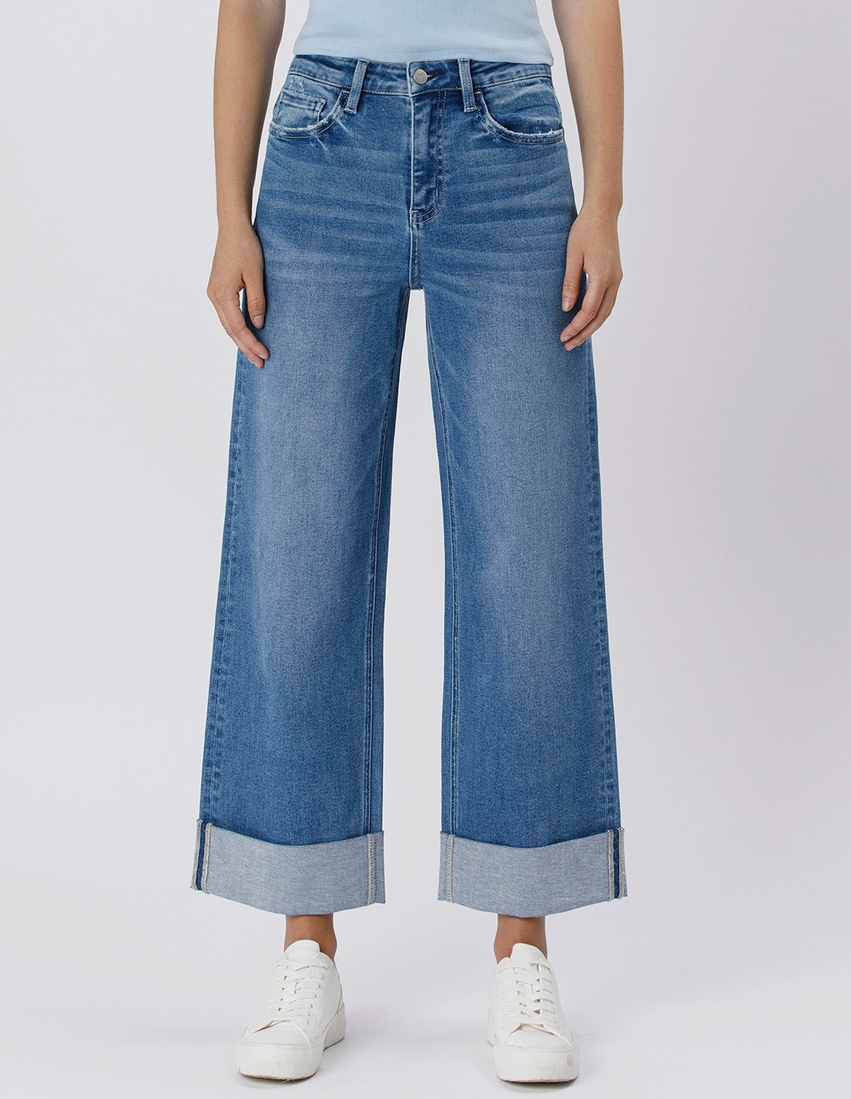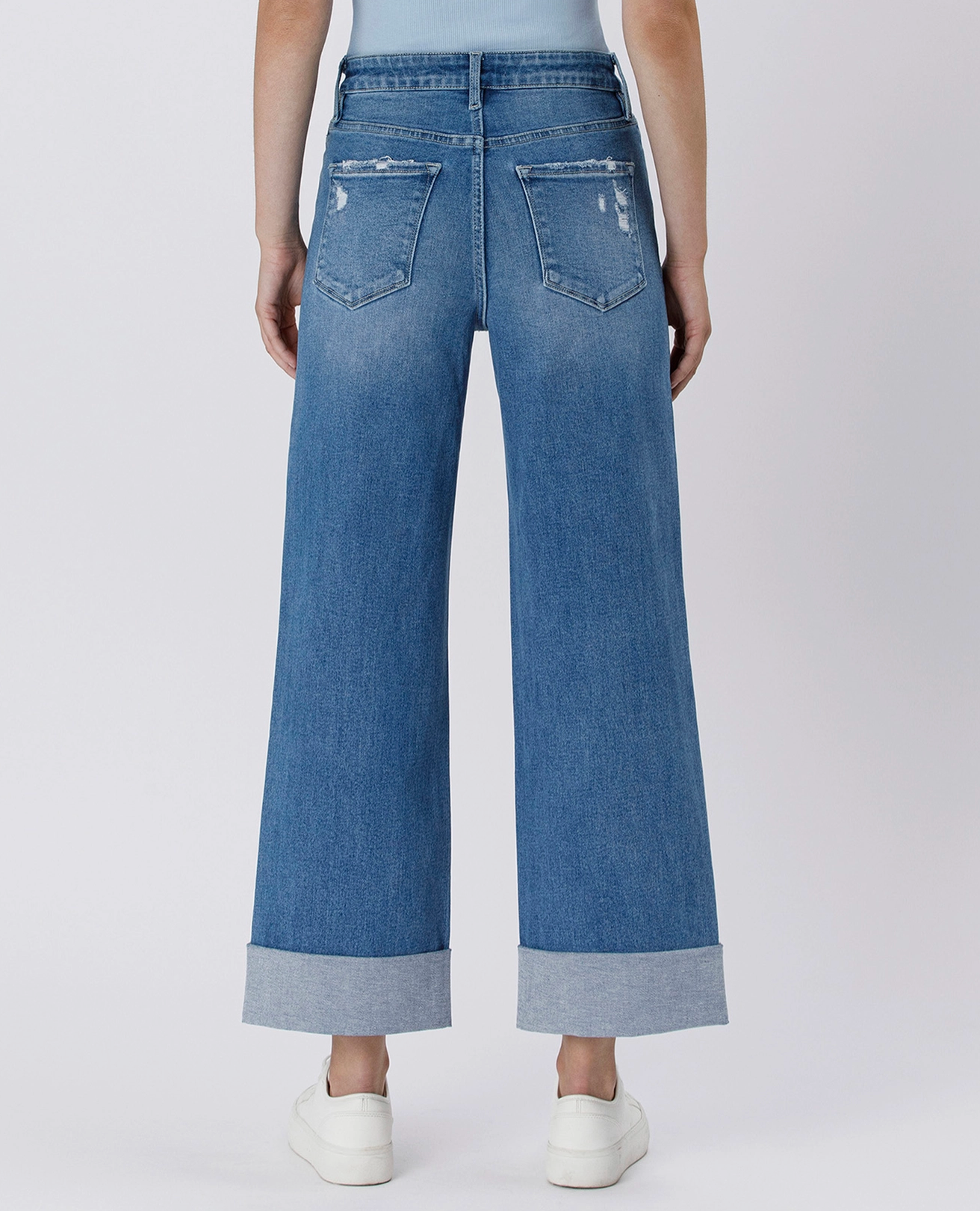 Super high rise double cuffed baggy wide jeans Comfort stretch denim, super high rise waist, lightly distressed detail, double cuff hem, cropped length, baggy wide jeans F. Rise: 11" / inseam: 26 1/2" / leg opening: 20" / cuff: 3" x 2 Model is 5'10" wearing a size 26