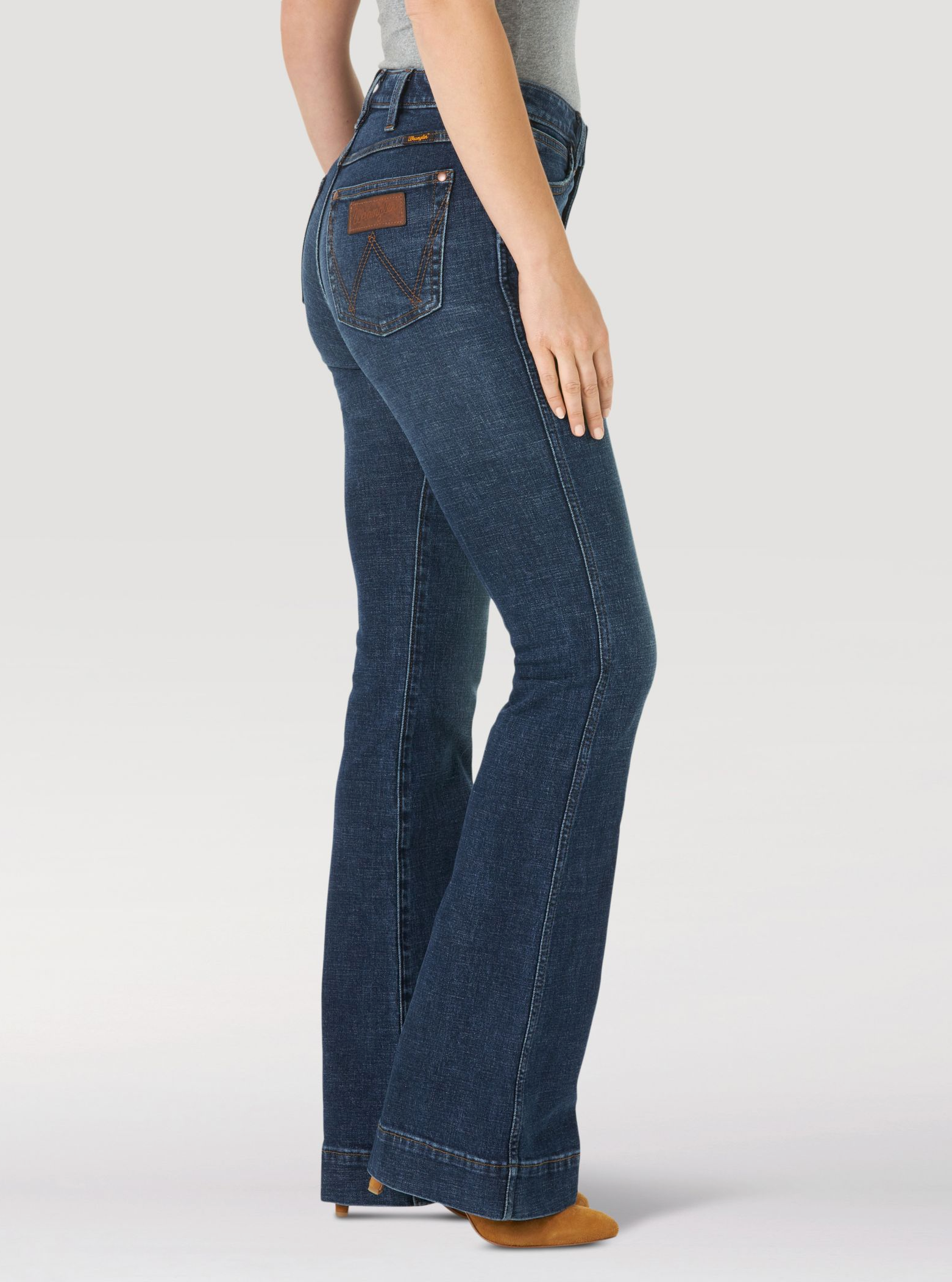 Your favorite Western jeans are going green. As part of the Wrangler Retro® Green Jean assortment, our women's trouser jeans are reimagined to combine all the Western style you love with enhanced sustainability features you can be proud of. Inspired by our love of the land, the Green Jean is designed using a blend of recycled cotton and made exclusively in factories that have met some of the highest standards for prioritizing employee health and safety. Style couldn't be missing from this Western classic—that's why the Green Jean trouser features the same curve-flattering high rise and contoured waist of the originals. The style offers a close fit through the thigh before releasing at the knee to a subtle, wide leg opening that fits perfectly around your favorite cowgirl boots and Western-inspired heels.