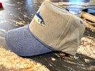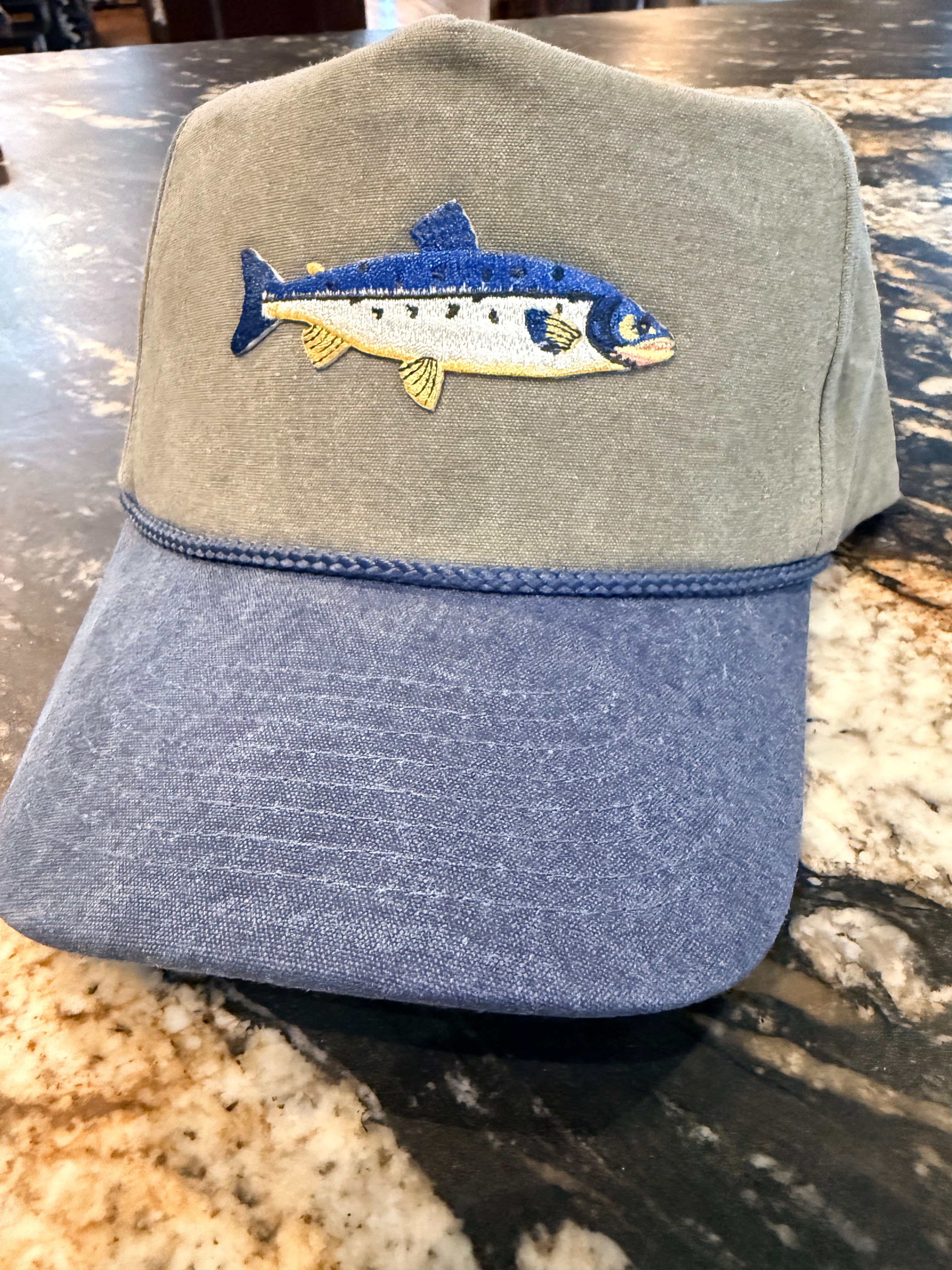 Blue Salmon Sal embroidery patch on our two toned canvas with a denim brim