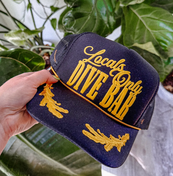 Show of your style in our Locals Only Diver Bar Country Western, puff trucker hat. - Features the phrase "Locals Only Diver Bar" across the front in a red or gold puff ink - Come with a removable small pin attached to each hat - Individually heat pressed onto each hat - 5 Panel, Mesh Back with Snap Back *due to screens & filters colors may vary slightly to photos