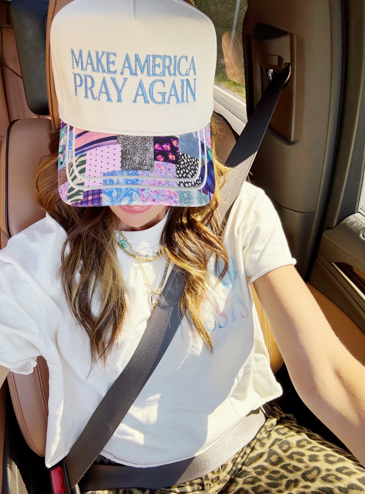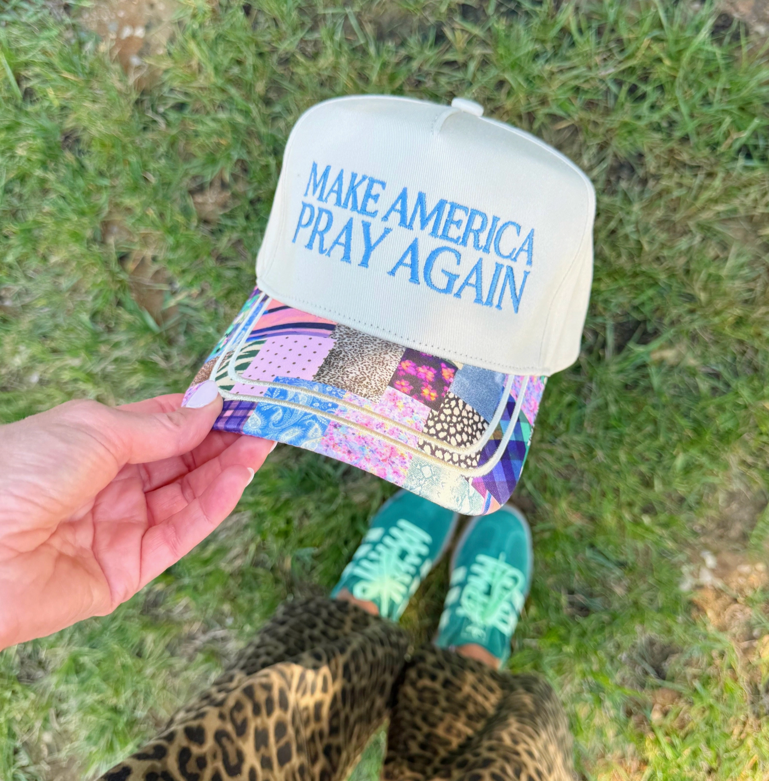 Show your devotion boldly with the Colorful Make America Pray Hat. Canvas hat embroidered stitch