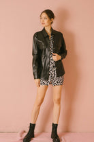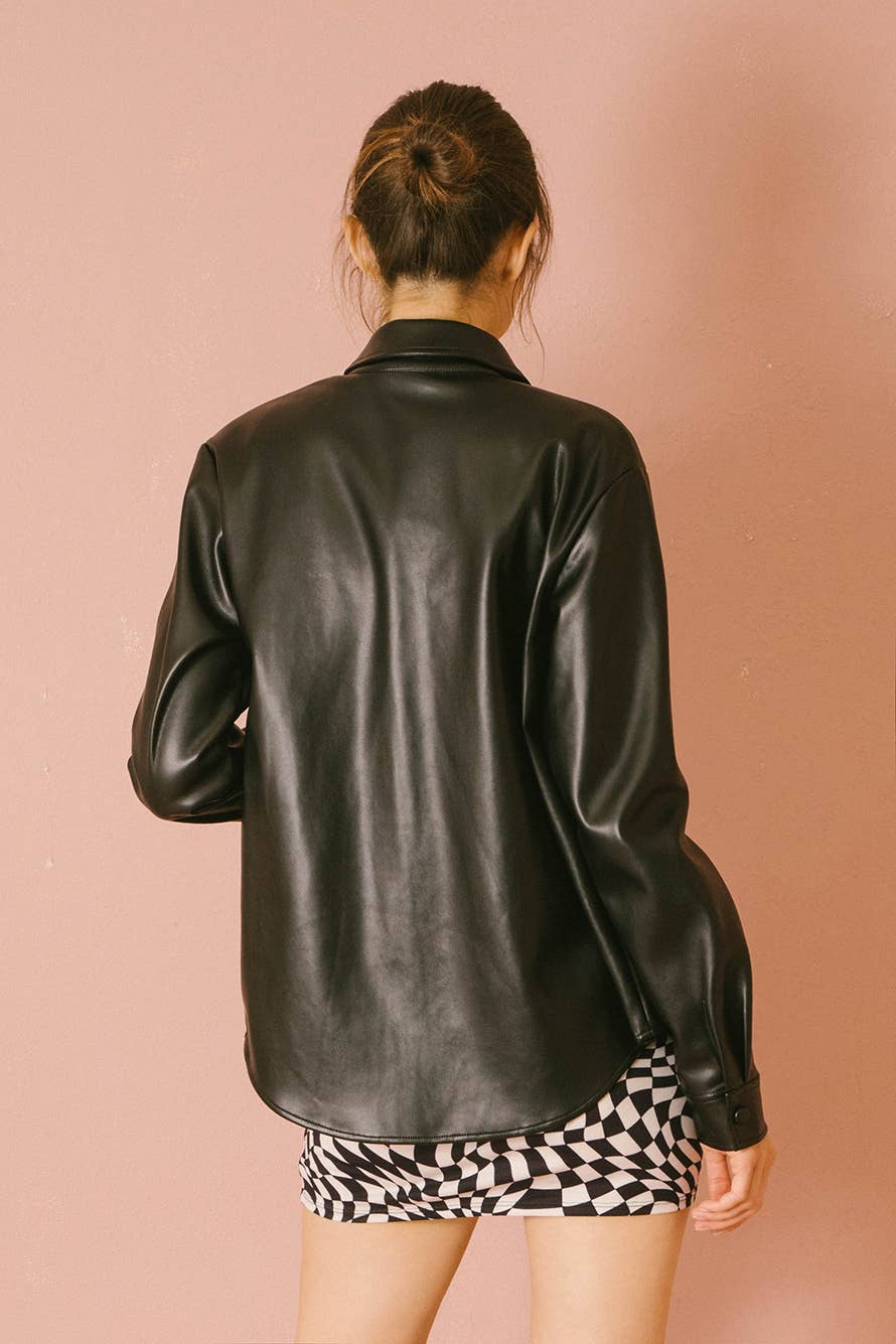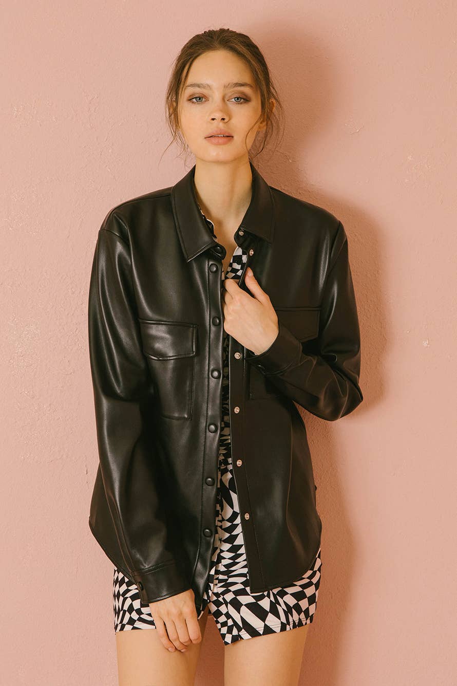 Leather oversized shacket. It features a notch collar, long sleeves, and center snap buttons (button-up). It also has two large front pockets and a dolphin hem.