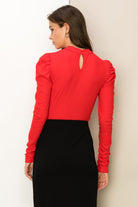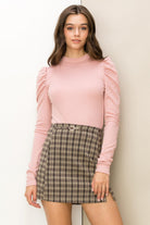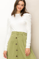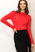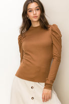 Look exceptionally cute in our Chloe ribbed knit, ruched shoulder, long sleeve top.