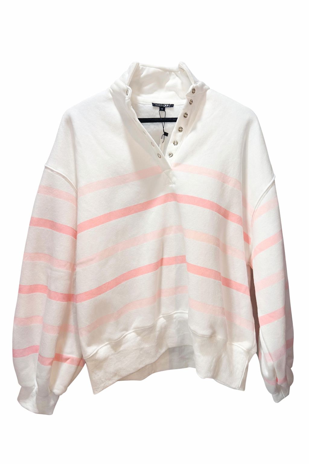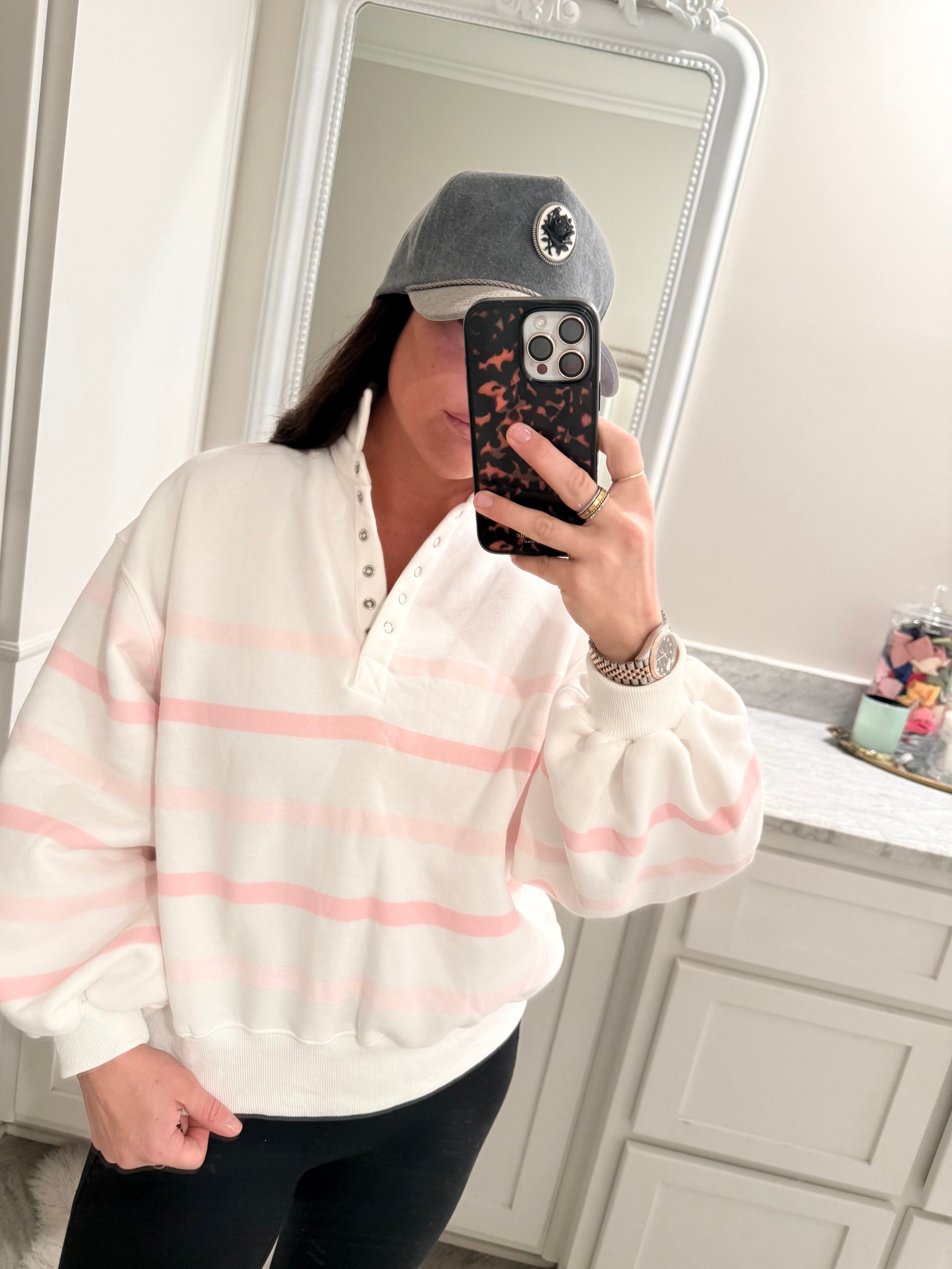 Striped Mock Neck Pullover Relaxed Fit Add a touch of effortless style to your everyday look with this cozy striped pullover. Designed with a soft relaxed silhouette it features a mock neckline and a snap front detail that brings a clean modern feel. The wide sleeves create an easy comfortable shape while the classic stripe pattern adds a fresh timeless touch perfect for layering through every season - Soft knit fabric with a smooth comfortable feel - Mock neckline with snap front detail - Relaxed drop shoulder for a laid back fit - Wide sleeves for an easy cozy silhouette - Classic stripe design for a clean polished look Perfect For Casual days coffee runs weekend errands or layering with denim and basics for a simple elevated outfit
